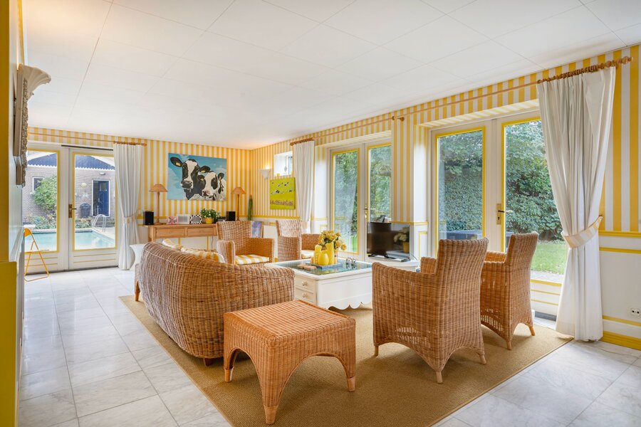 Er zijn twee royale woonkamers. De voorkamer heeft de karakteristieke ronde ramen, een open haard en toegang tot het voorterras. De achterkamer is zeer ruim, L-vormig en biedt via openslaande deuren toegang tot twee terrassen, waarvan één grenst aan de groene achtertuin met zwembad.