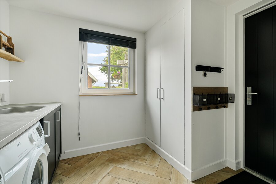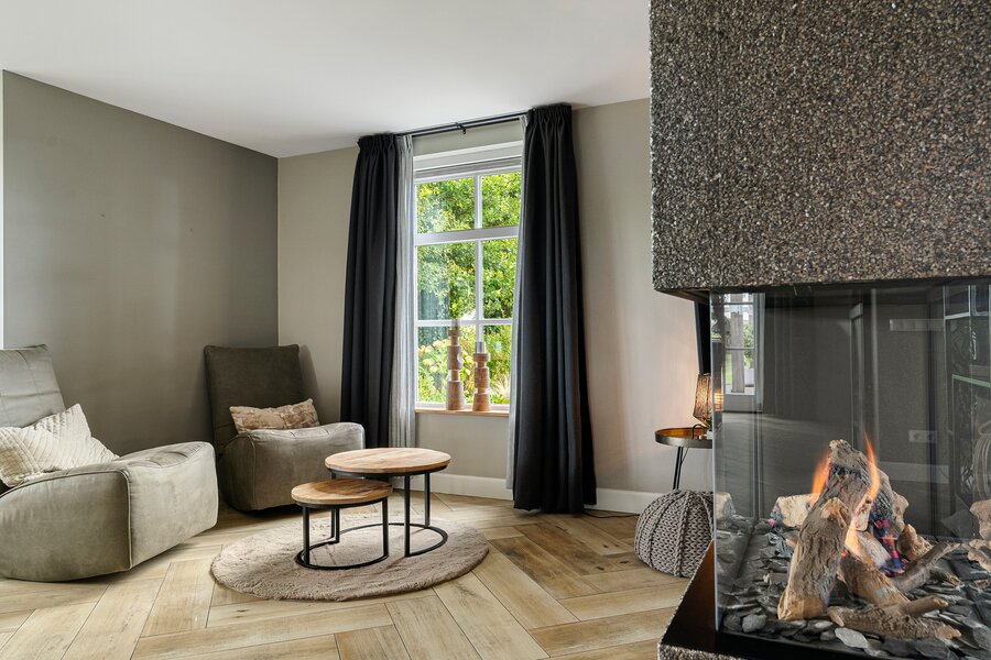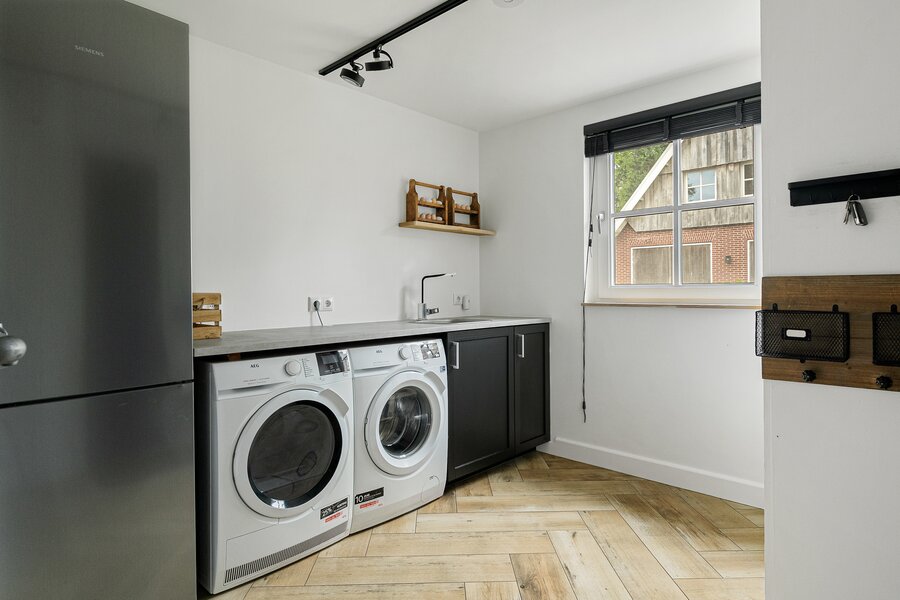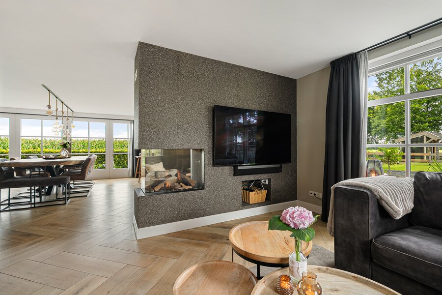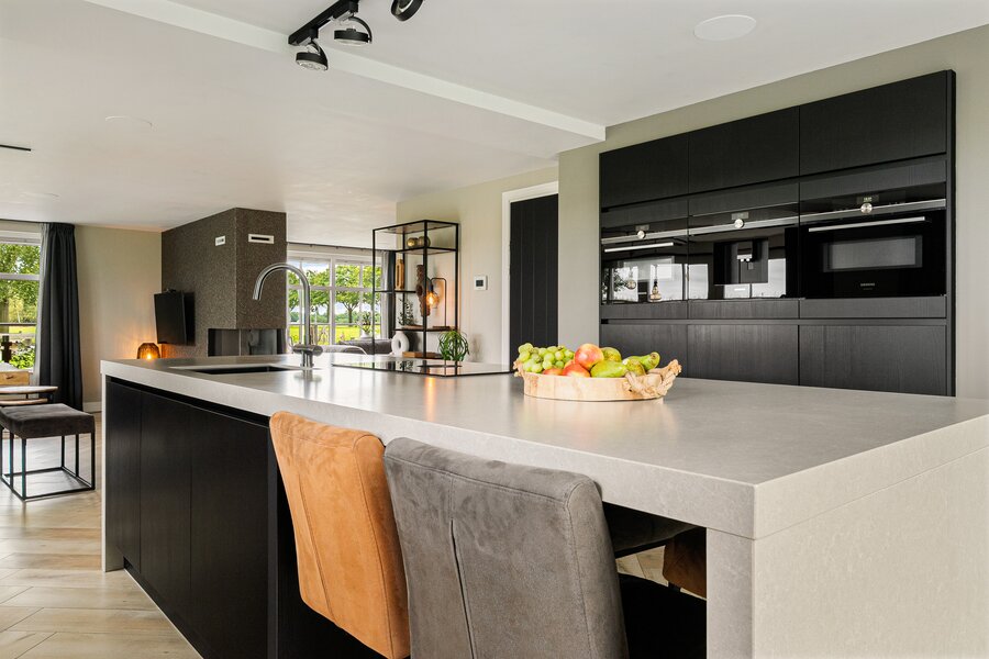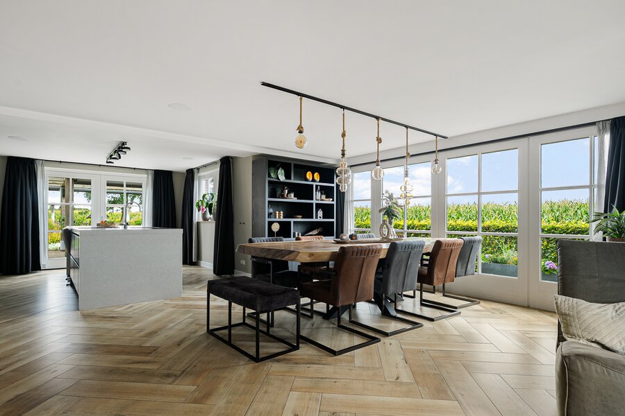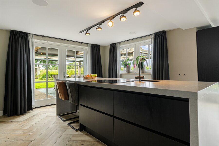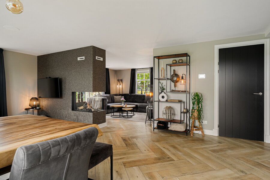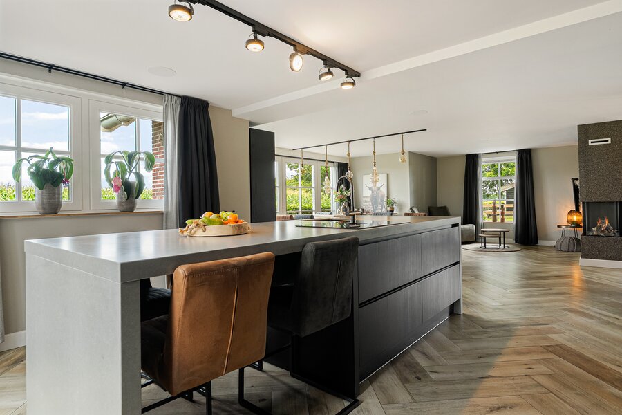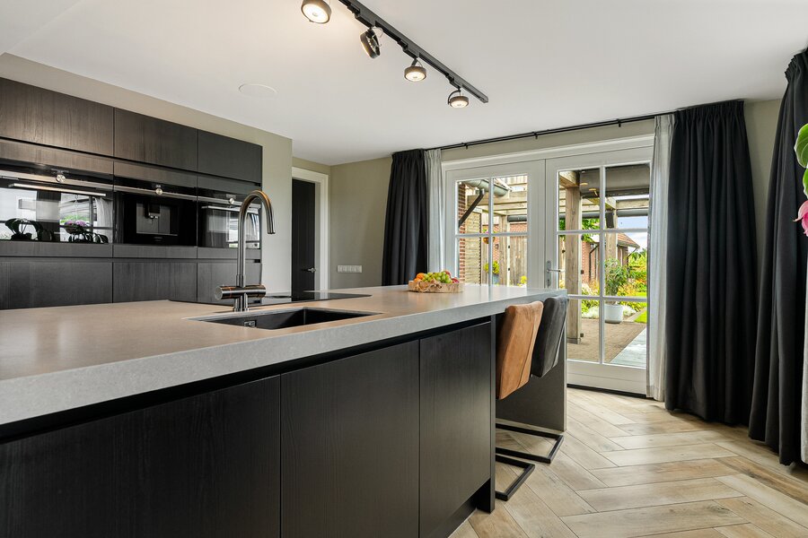 Je betreedt de woning via de ruime entree met meterkast en toiletruimte. Vanuit hier kom je in de woonkamer, waar de keramische parketvloer en de gasgestookte open haard zorgen voor een warme, sfeervolle uitstraling. De grote ramen geven prachtig zicht op de tuin en laten het licht rijkelijk binnenstromen. Aansluitend bevindt zich de moderne open keuken, een waar paradijs voor kookliefhebbers. Hier beschik je over een composieten werkblad met de mogelijkheid om aan te zitten. Er zijn twee koelkasten, een vriezer, twee combi-ovens, een ingebouwd koffiezetapparaat, een vaatwasser, een Bora inductiekookplaat met afzuigingssysteem en een Quooker. Vanuit de keuken heb je toegang tot de bijkeuken, met cv-opstelling en plaats voor het witgoed.