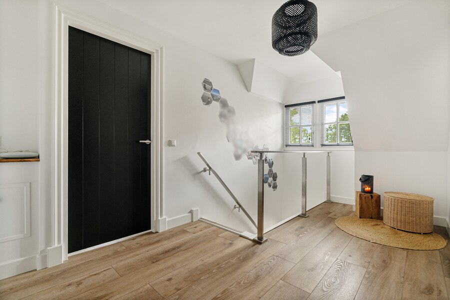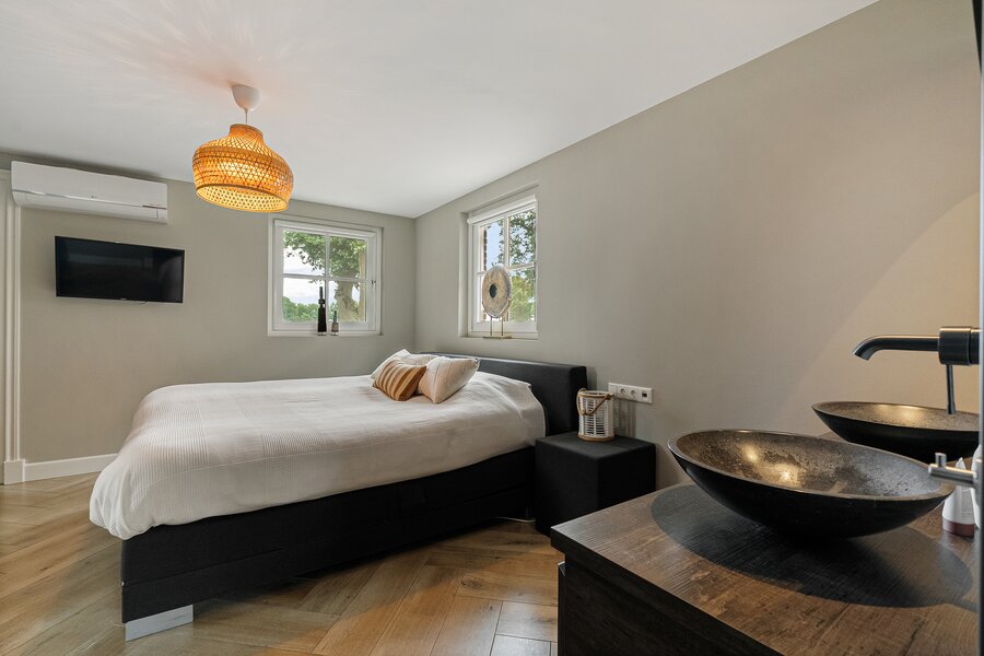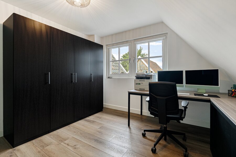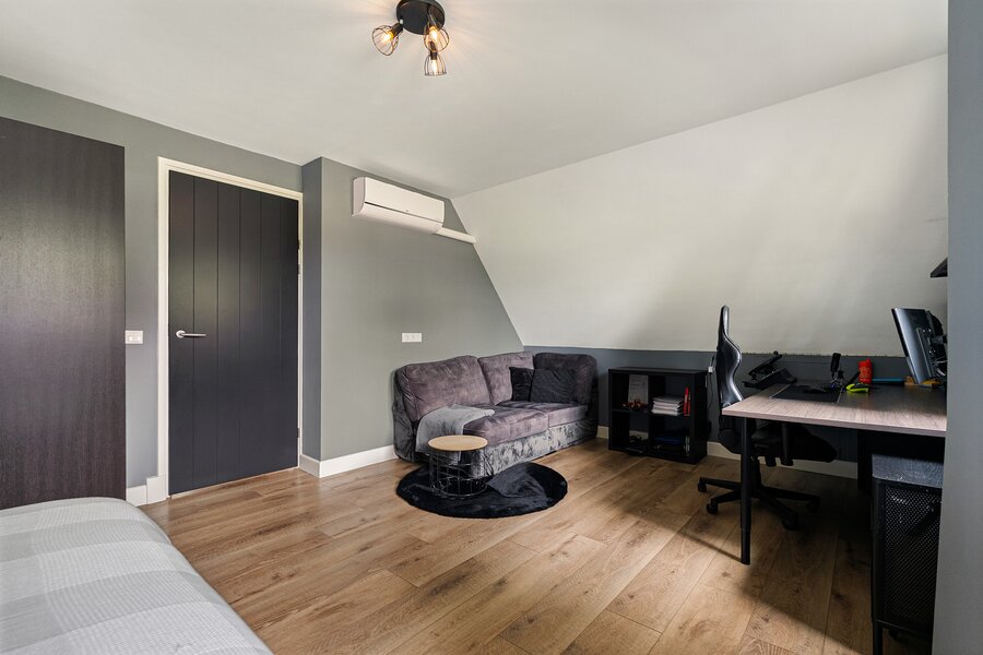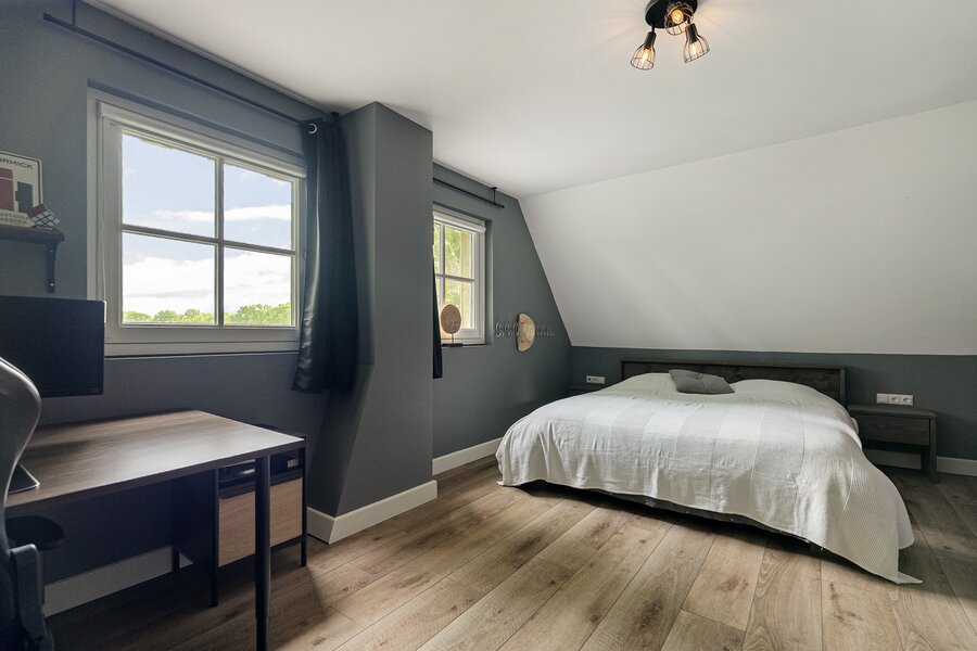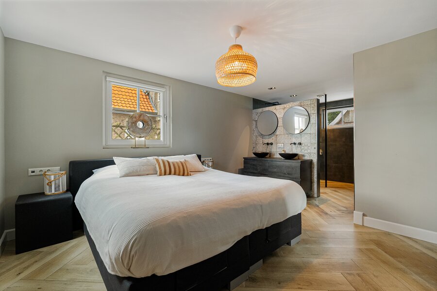 Op de begane grond vind je bovendien een royale slaapkamer met badkamer annex, voorzien van een dubbele wastafel, inloopdouche en toilet. Dankzij deze indeling is gelijkvloers wonen hier eenvoudig mogelijk, zonder in te leveren op luxe.