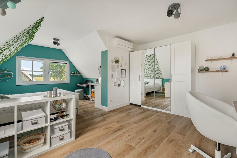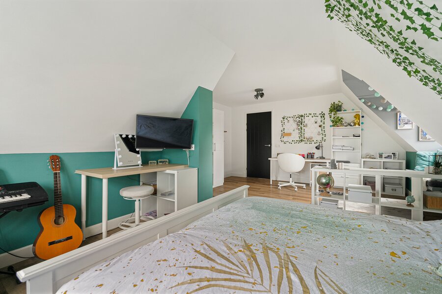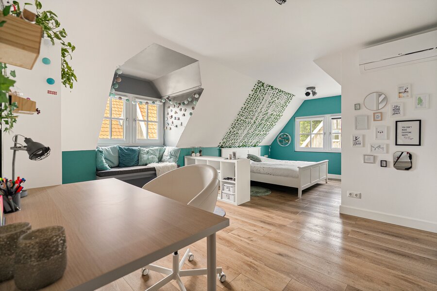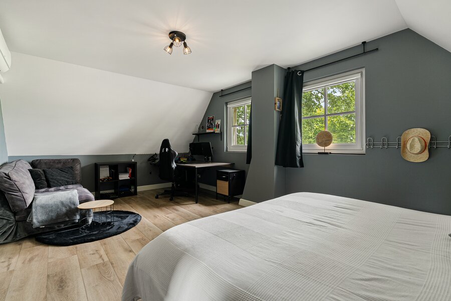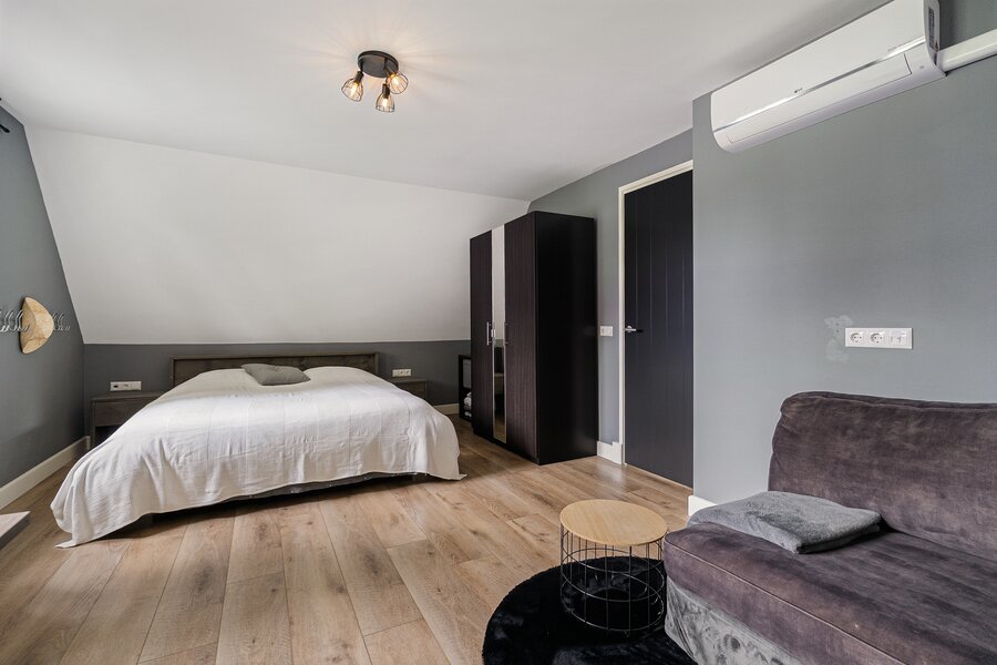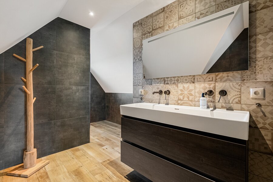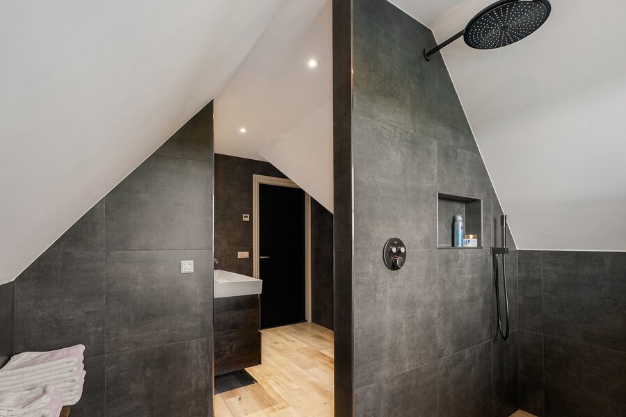 Via de overloop bereik je drie slaapkamers, waarvan twee zeer royaal en uitgerust met airconditioning. Ook vind je hier een separaat toilet en een stijlvolle badkamer met inloopdouche, dubbele wastafel en spiegelverwarming.
