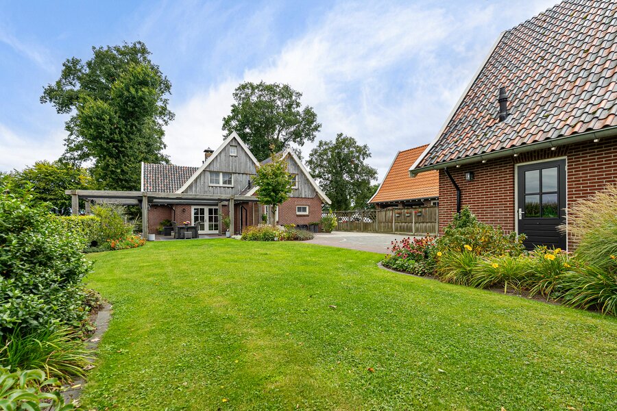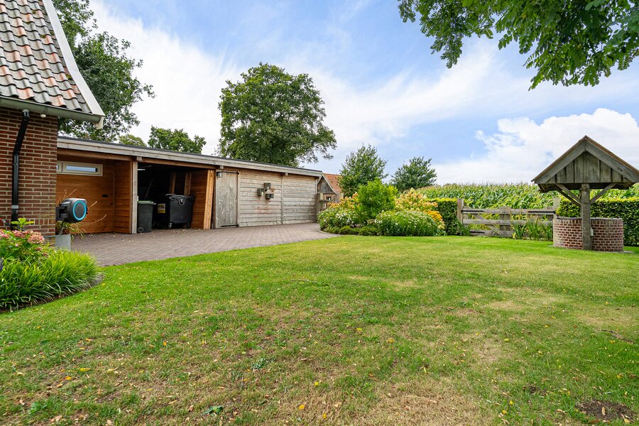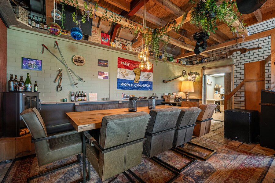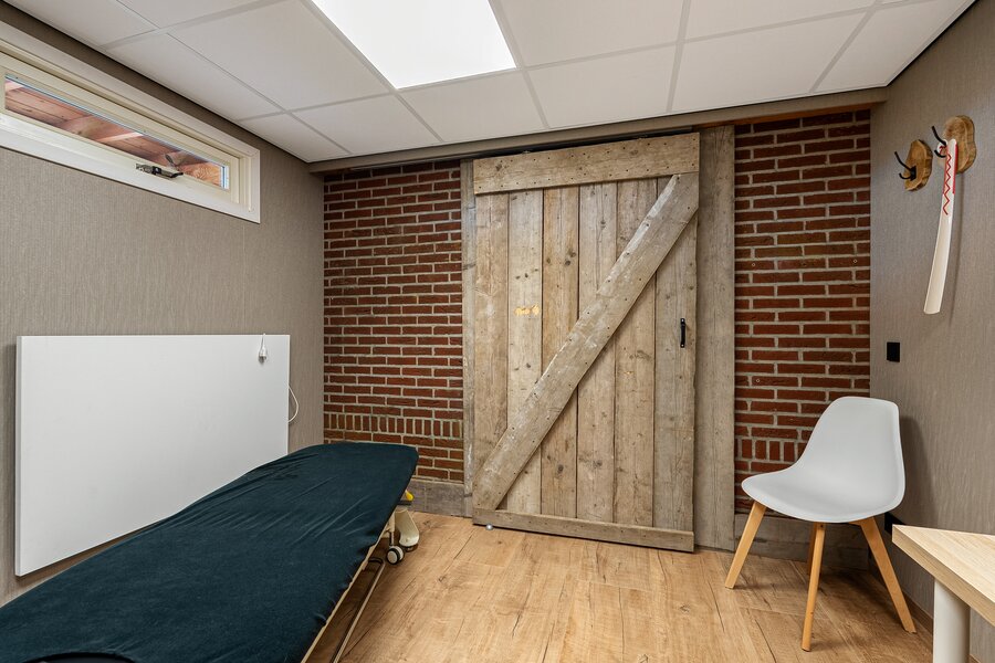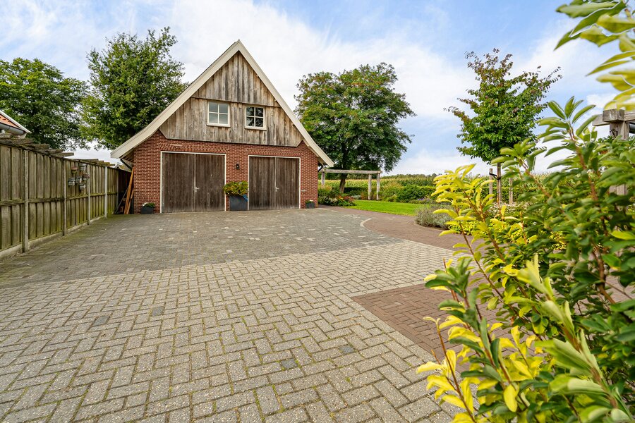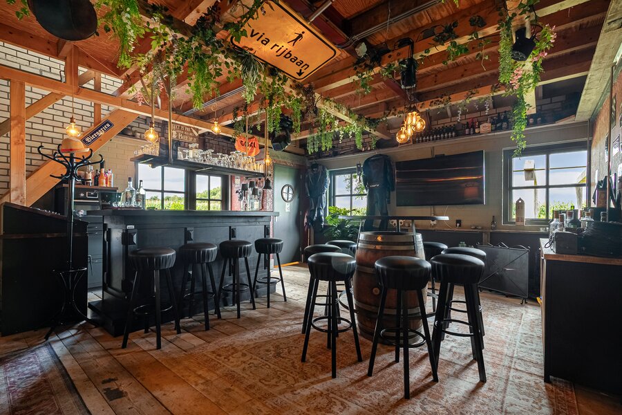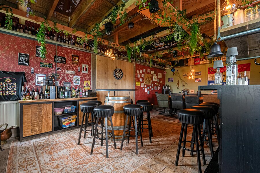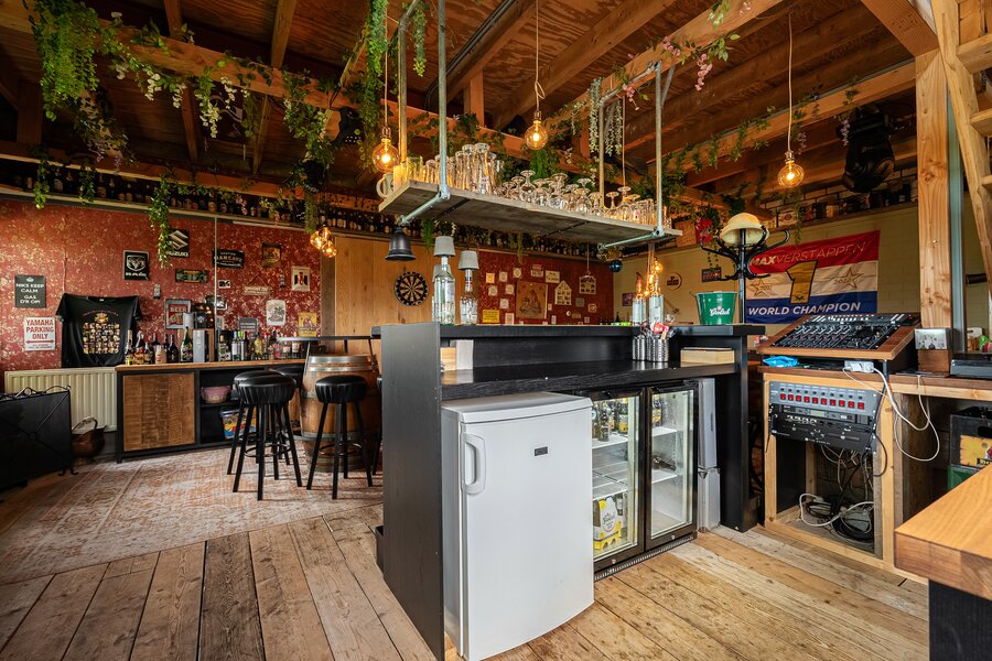 Buiten wordt de woonervaring alleen maar versterkt. Het royale bijgebouw omvat een dubbele garage, een werkplaats en zelfs een compleet café met bar en toilet, dé plek voor feestjes en gezellige avonden met familie en vrienden. Daarnaast is er een aparte ruimte die nu als behandelruimte wordt gebruikt. De verdieping van dit bijgebouw biedt twee kamers en een grote bergzolder, perfect als logeerverblijf voor gasten of familie. Ook is er nog een aparte houten fietsenschuur.