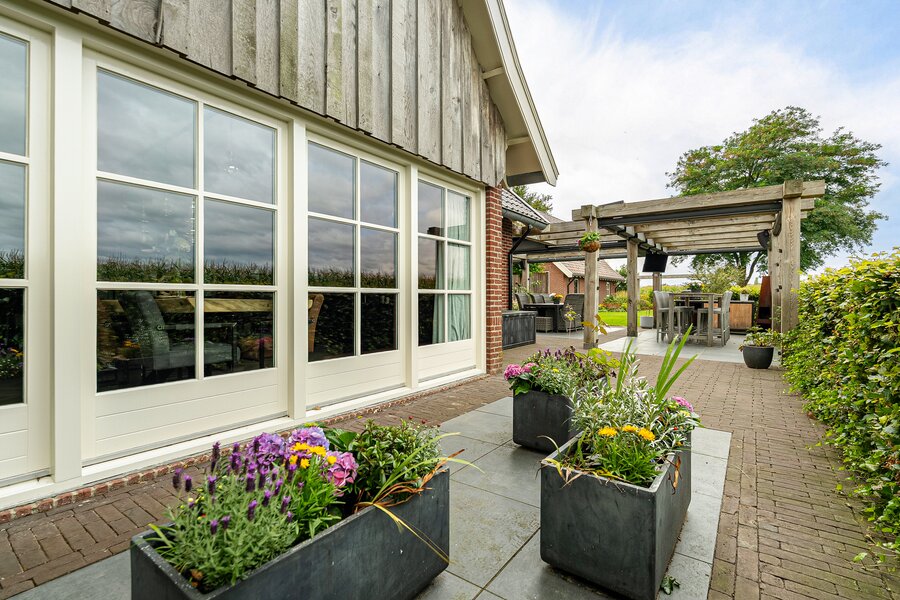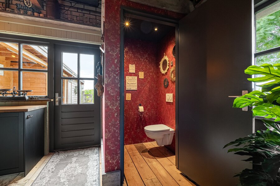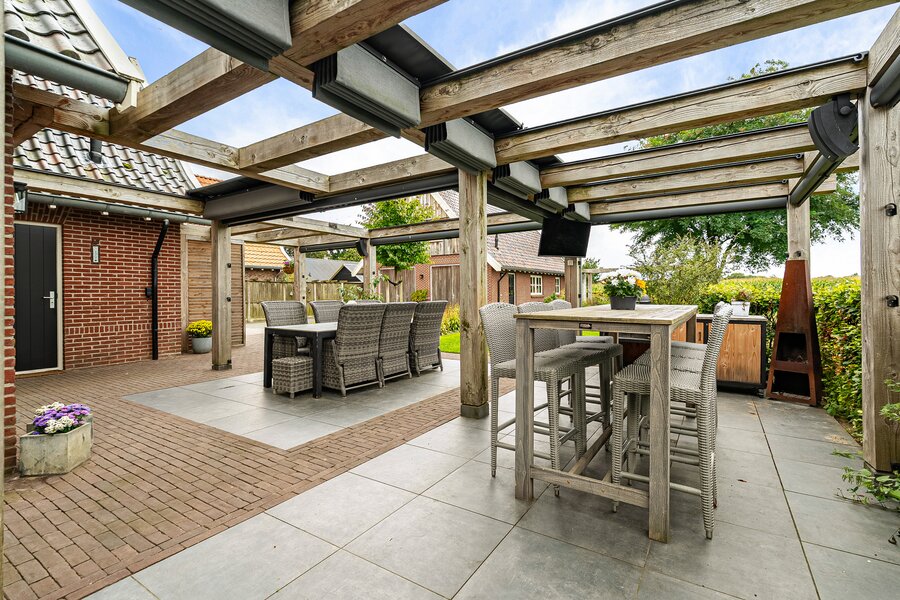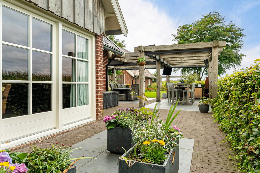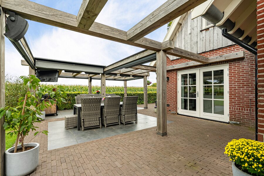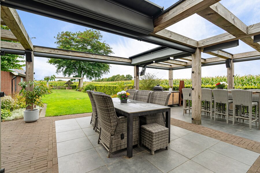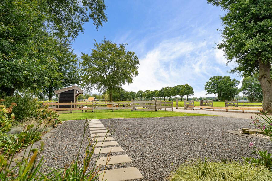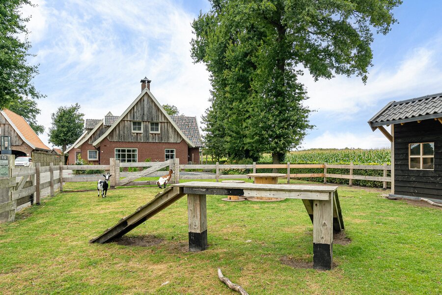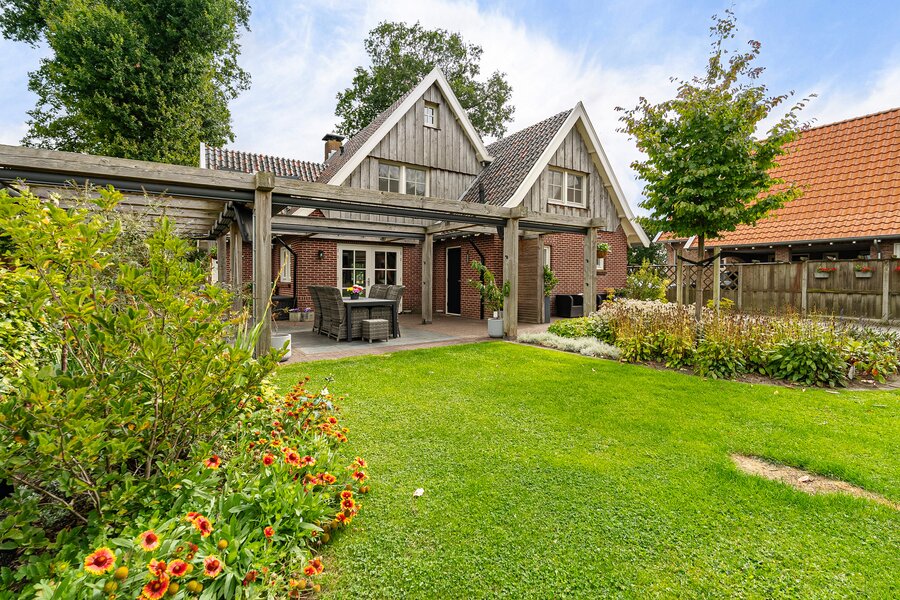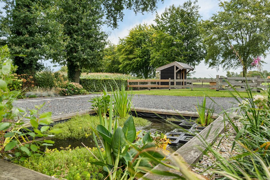 De tuin rondom de villa is met evenveel zorg en liefde aangelegd als het interieur. Hier vind je een vijver, een gazon, kleurrijke borders, volwassen bomen en struiken en diverse sfeervolle zitjes. Dankzij de schuifbare schaduwdoeken op het terras kun je hier het hele jaar door comfortabel buiten zitten, ongeacht het weer. Voor dierenliefhebbers is er bovendien een weide waar nu geitjes lopen, een charmant detail dat bijdraagt aan de landelijke beleving.