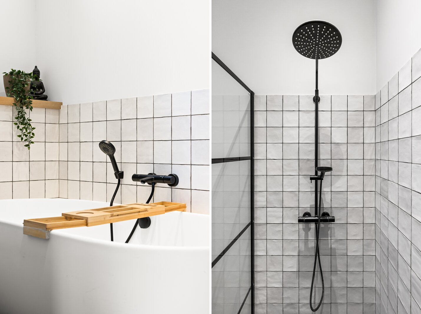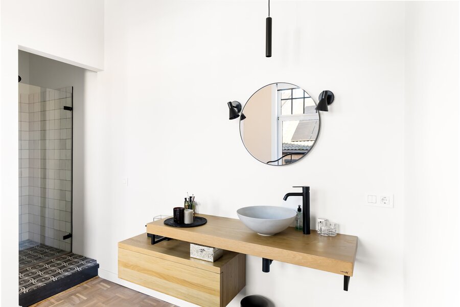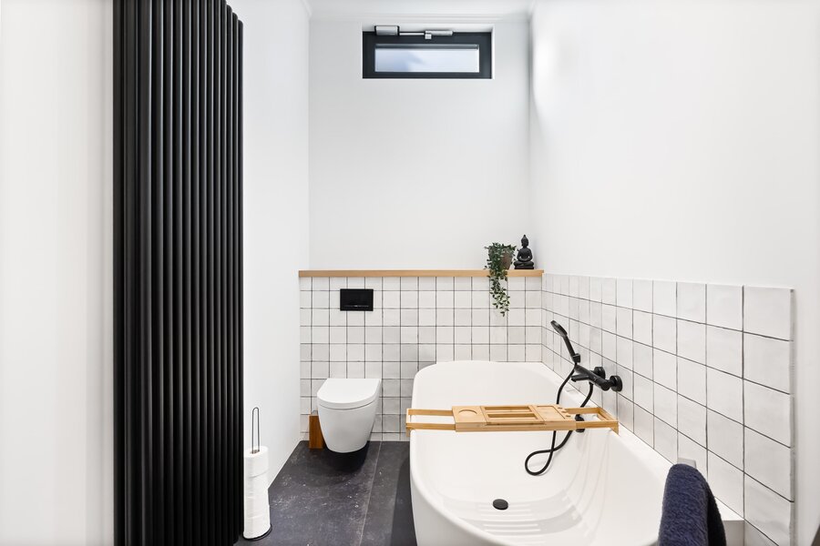 De ruime master-bathroom met ruim ligbad en luxe afwerking is te bereiken via de overloop.