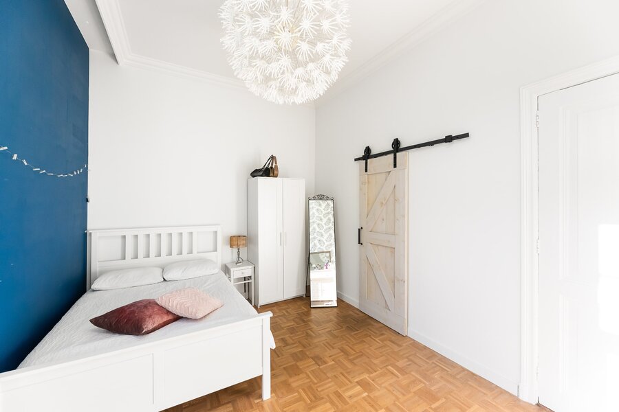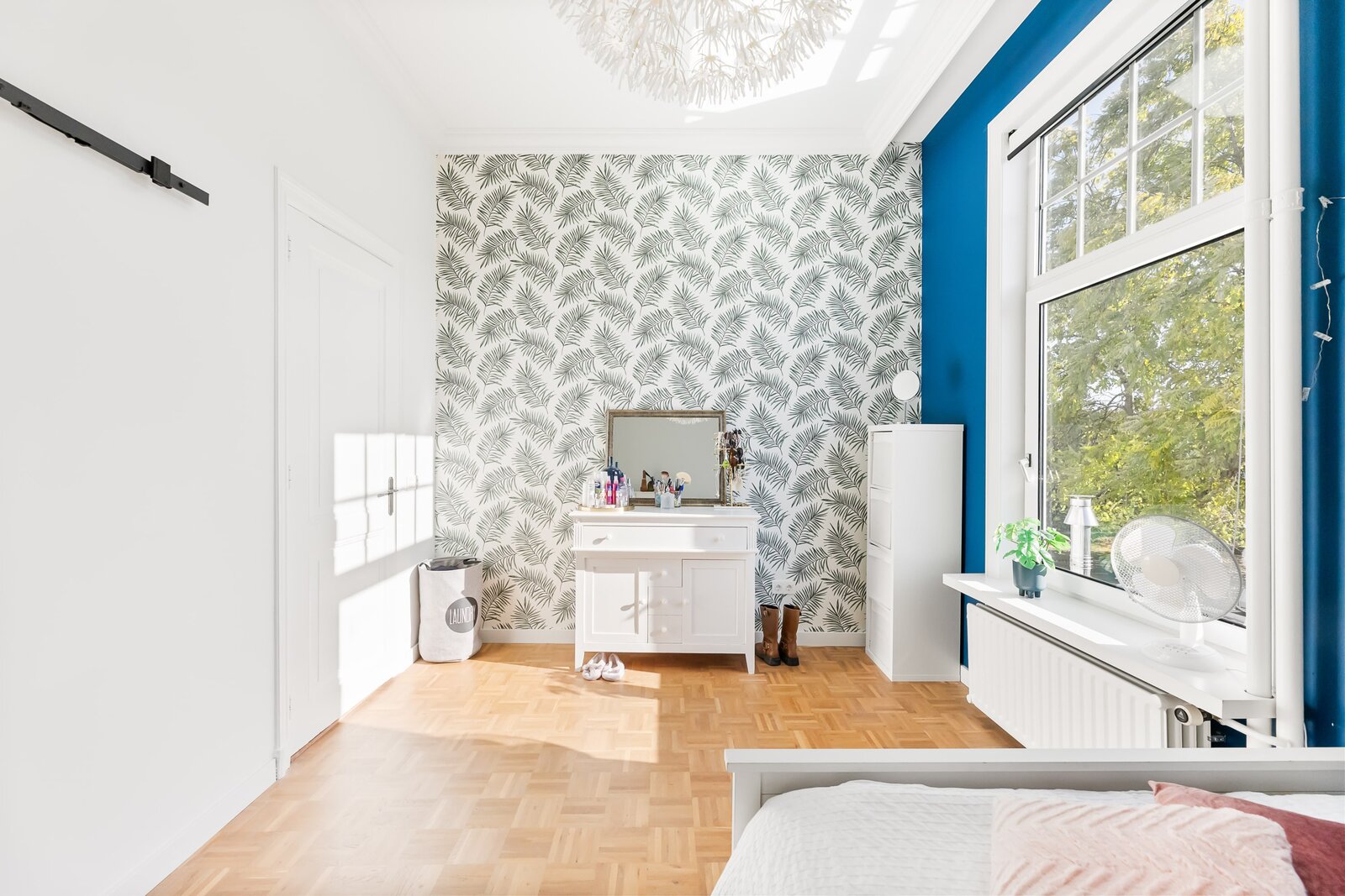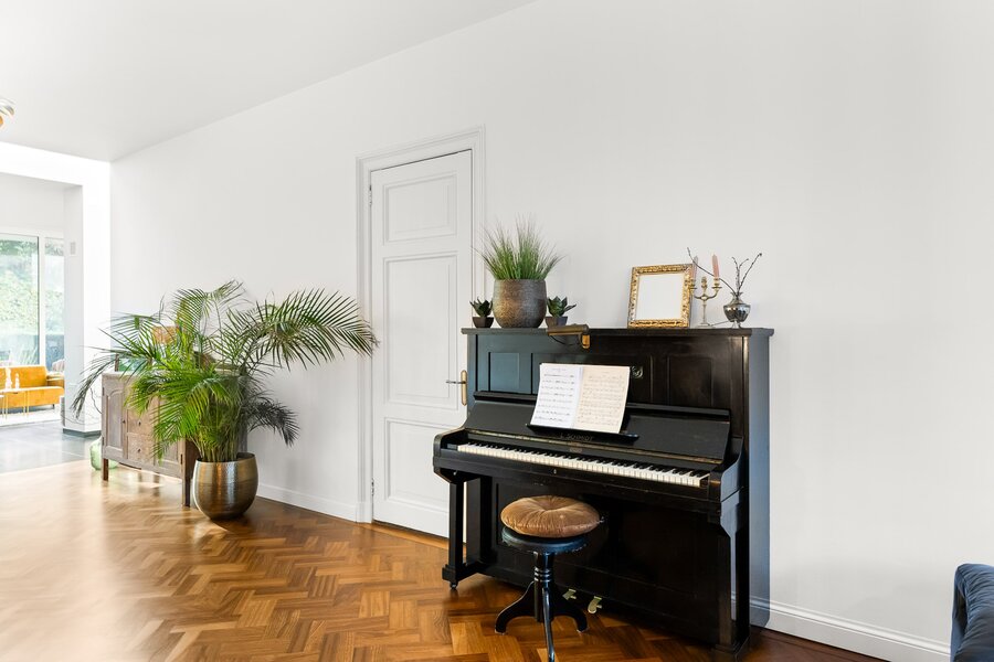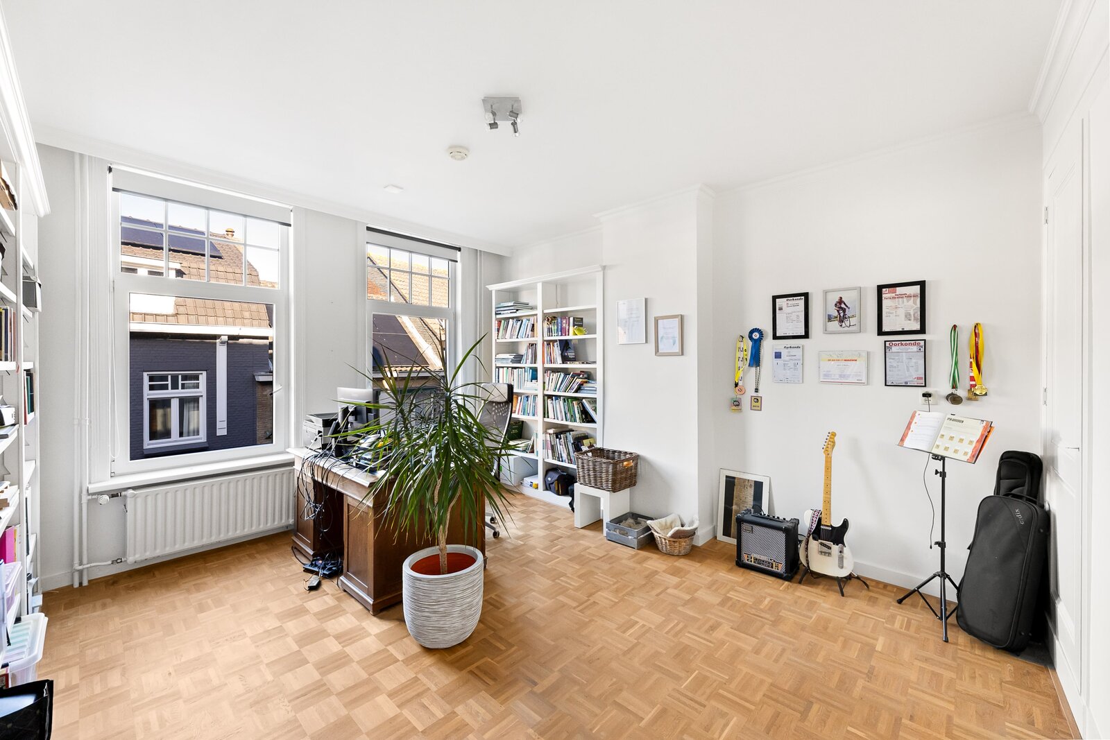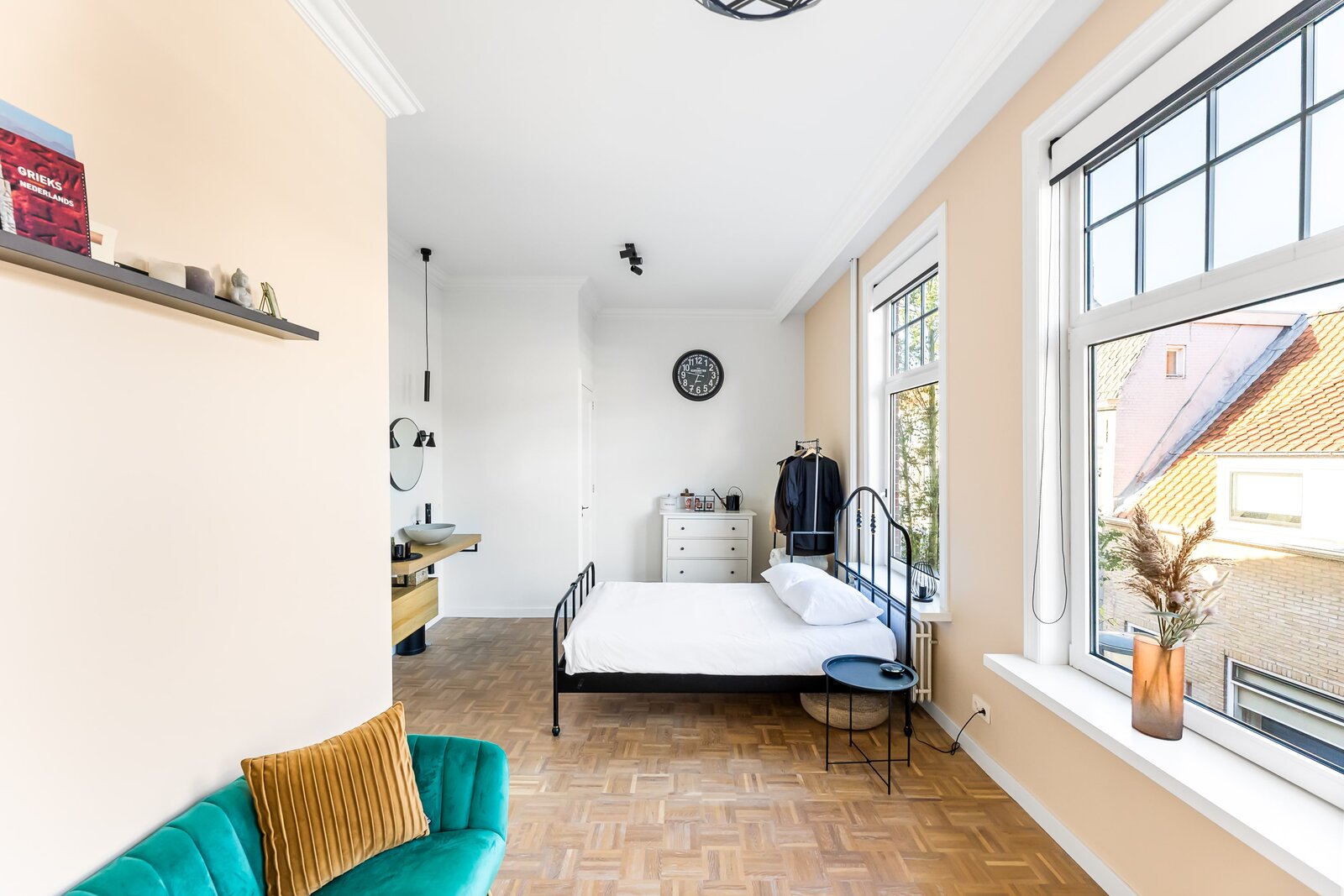 Direct rechts in de hal bevindt zich een royale slaapkamer of kantoorruimte, ideaal voor werken aan huis of gasten. Deze ruimte is ook bereikbaar via een tweede hal, waardoor het flexibel in gebruik is en volledig los te koppelen van de rest van de woning. De vloer is afgewerkt met warm teak parket, wat bijdraagt aan een luxe en huiselijke sfeer.