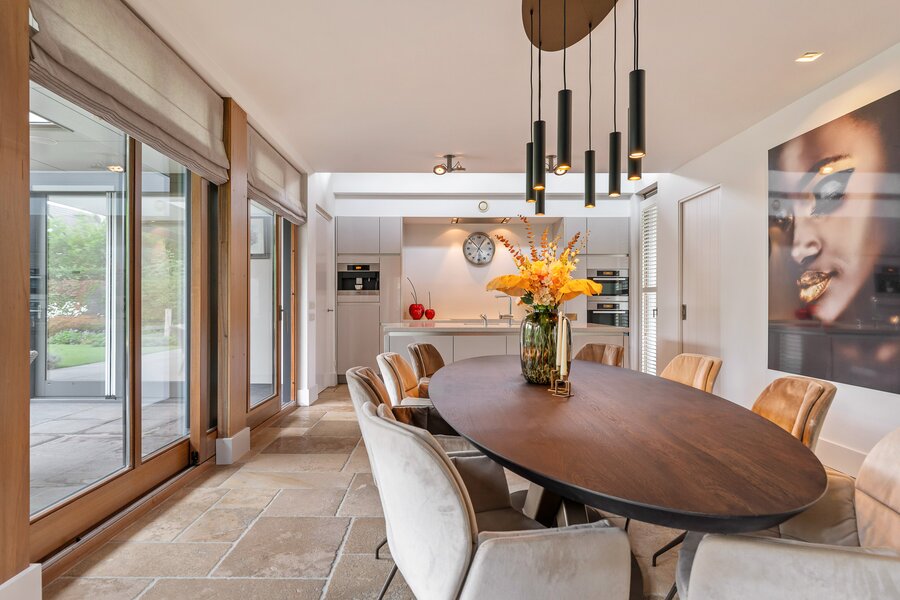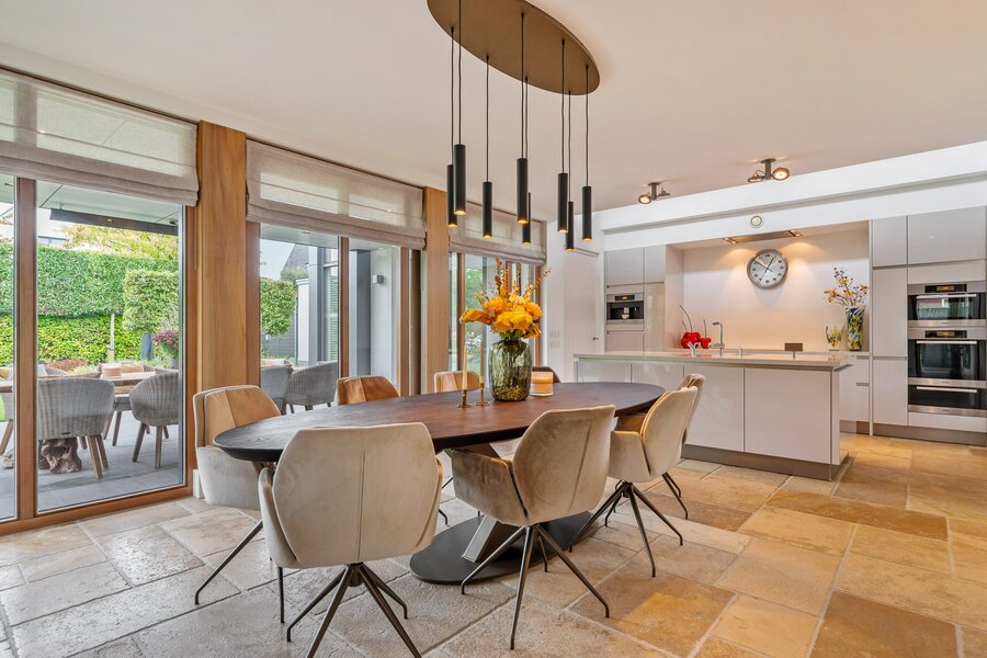 Aan de grote eettafel bij de keuken begin je de dag met een kop koffie of praat je gezellig bij tijdens het koken. Dankzij de grote ramen en schuifpui geniet je van overvloedig daglicht en een prachtig zicht op de tuin.