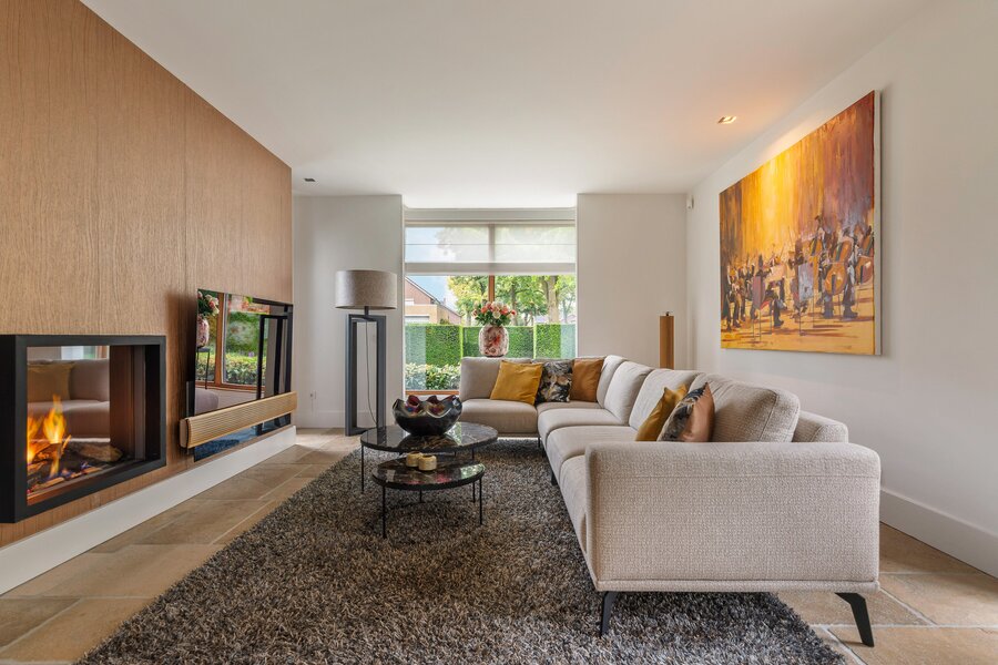 De woonkamer bestaat uit twee sfeervolle gedeelten: een zitruimte en een eetgedeelte. Aan de voorzijde, in de erker, bevindt zich de zitkamer – warm, elegant en uitnodigend. De strakke wand met inbouw-gashaard en nis voor de televisie vormt een eigentijds accent en creëert een prettige balans tussen comfort en design. De eethoek sluit aan bij deze ruimte en vormt samen een harmonieus geheel.