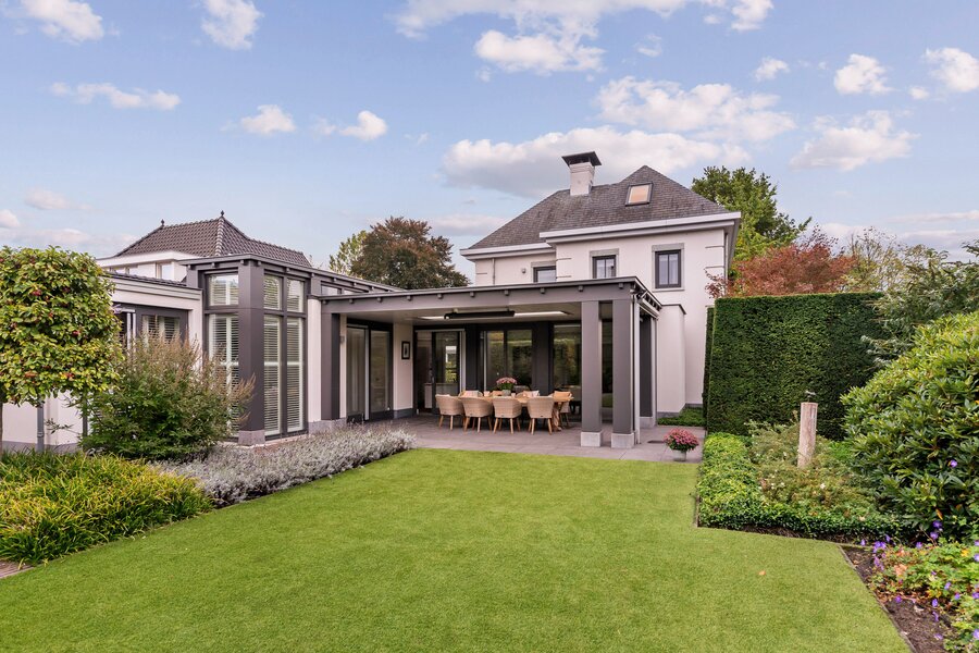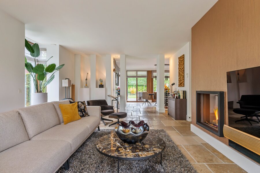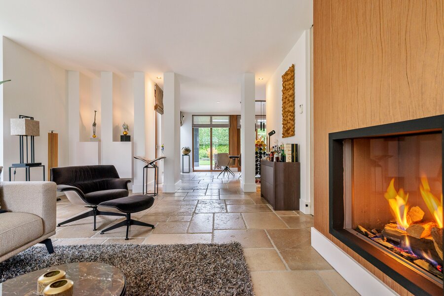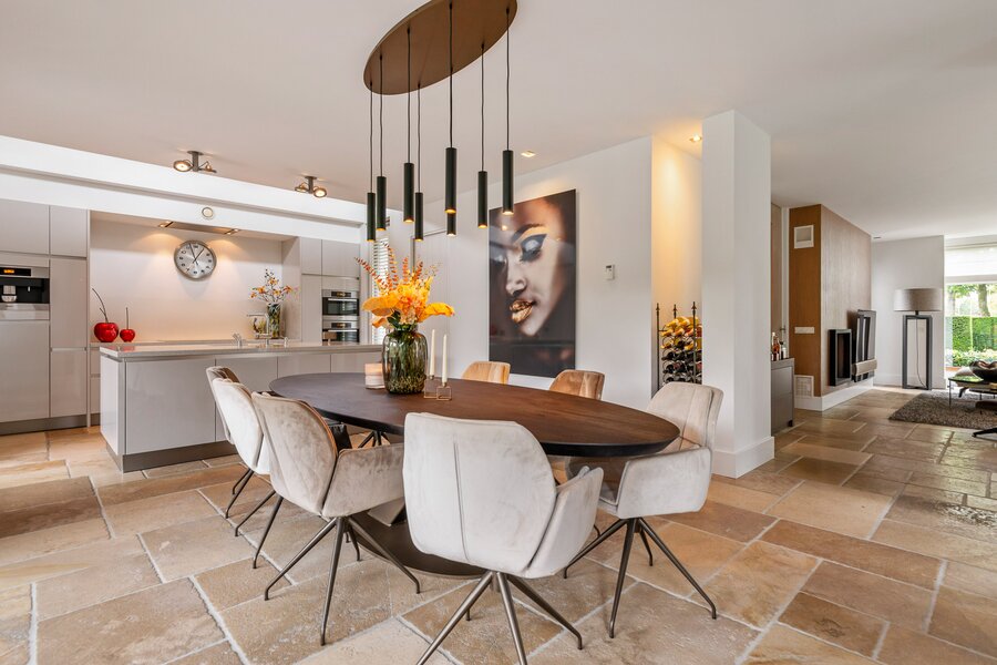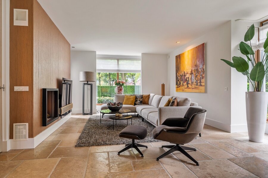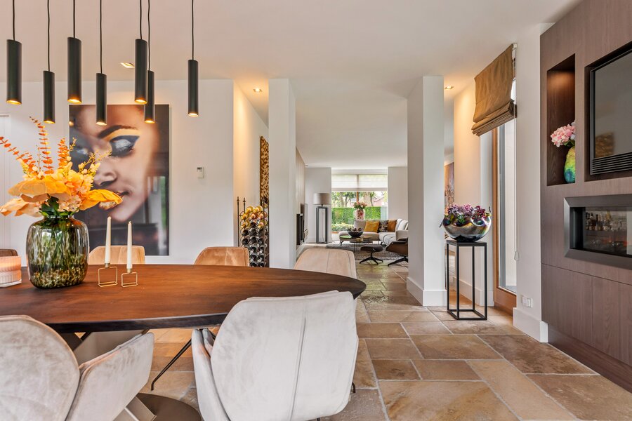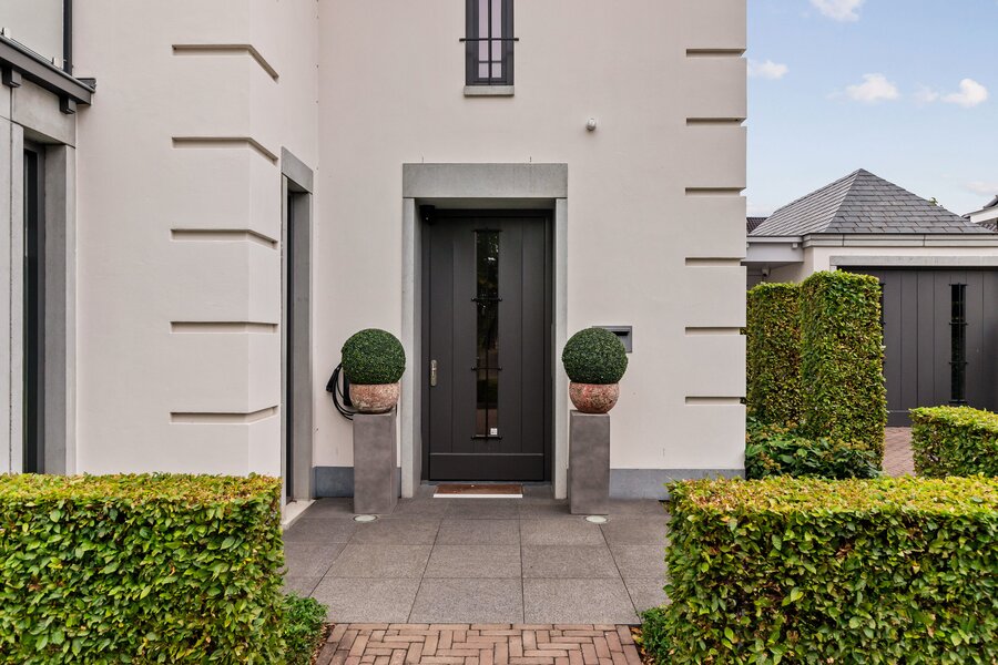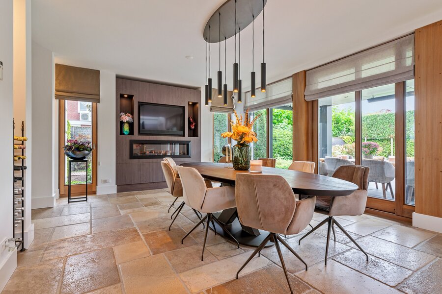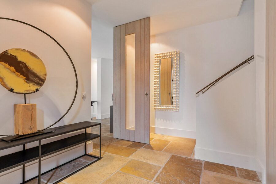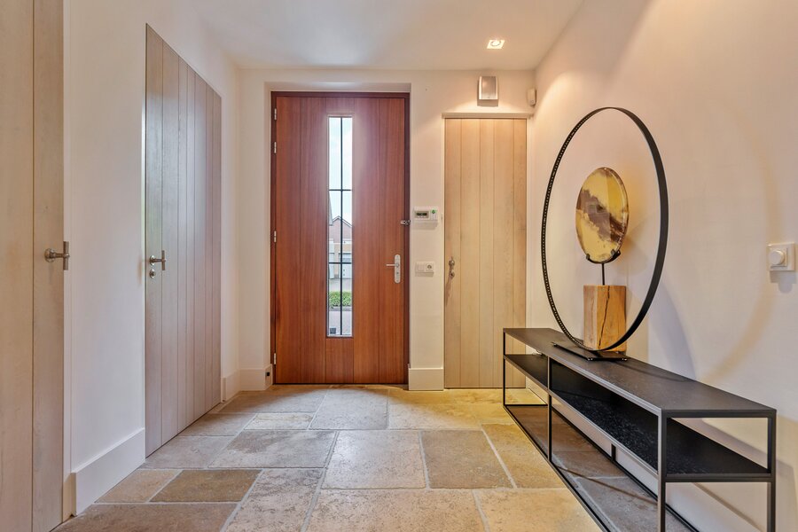 Kom binnen. Deze luxe villa straalt rust en verfijning uit, vanaf het moment dat je via de prachtig aangelegde voortuin en de stijlvolle houten voordeur naar binnen stapt. In de royale ontvangsthal met natuurstenen vloer voel je meteen de kwaliteit en sfeer van de woning. Hier bevinden zich een ruim en keurig afgewerkt toilet en, slim weggewerkt onder de trap, een garderobekast voor jassen en tassen. Voordat je verder loopt, valt het oog op de karakteristieke binnendeuren van Piet Boon – met fraai beslag en een tijdloze uitstraling. Ze komen in de hele woning terug en vormen een stijlvol detail dat direct de toon zet.