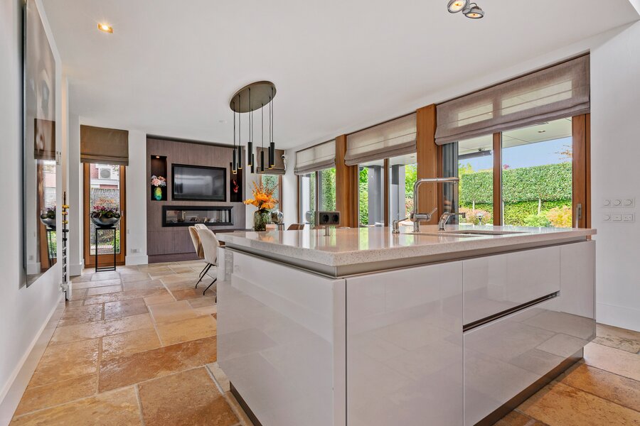 Ook hier is gedacht aan sfeer: een tweede wand met elektrische haard en cinewall, stijlvol geïntegreerd in het interieur. De royale leefkeuken is een droom voor kookliefhebbers. Het kookeiland met granieten werkblad, Quooker en veel bergruimte vormt het hart van de ruimte. De keuken is uitgerust met hoogwaardige Miele-apparatuur, waaronder twee ovens, een warmhoudlade, koelkast, luxe ingebouwd koffiezetapparaat en een nieuwe vijfpits inductiekookplaat (Bosch, 2024) met plafondafzuiging.