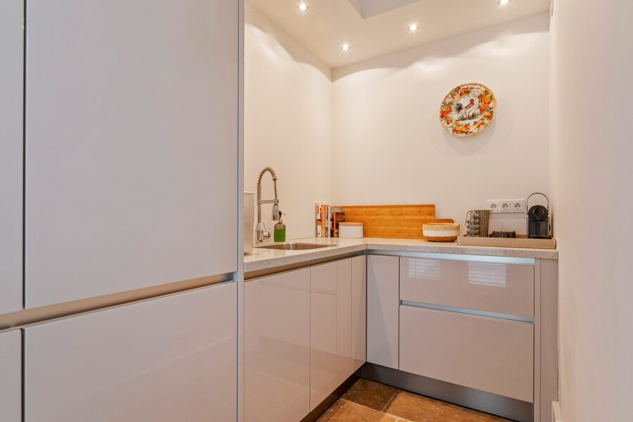 Achter de schuifdeur in de keuken bevindt zich een praktische bijkeuken in dezelfde stijl, met extra spoelbak, koelkast, vriezer en volop inbouwkasten. Een ideale plek voor voorraad, servies of een mooie wijncollectie.