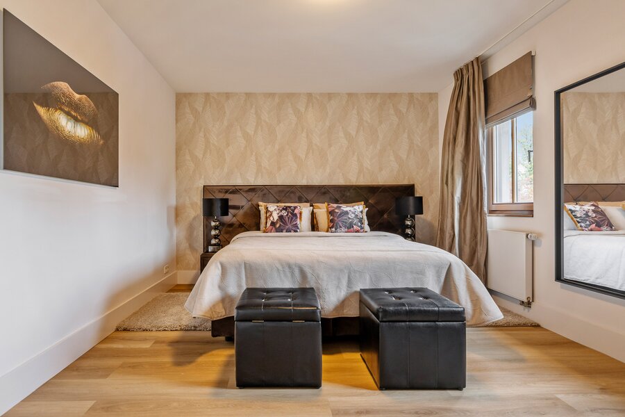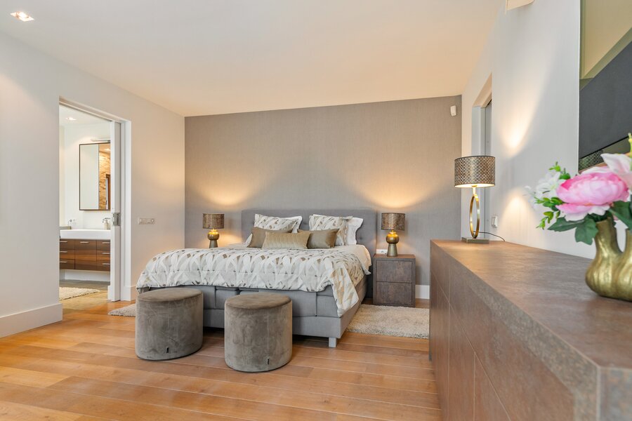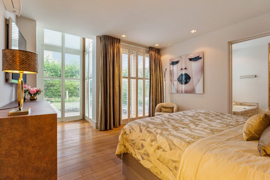 De royale slaapkamer op de begane grond is een oase van rust. Met een brede schuifpui naar de tuin, een sfeervolle eikenhouten vloer en een ruime inloopkast vormt dit een heerlijke, privé plek. De aangrenzende badkamer is luxueus uitgevoerd met vloerverwarming, ligbad, royale inloopdouche, toilet en breed wastafelmeubel.