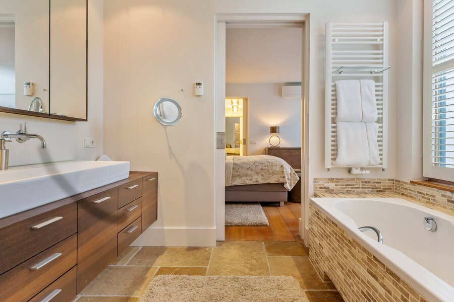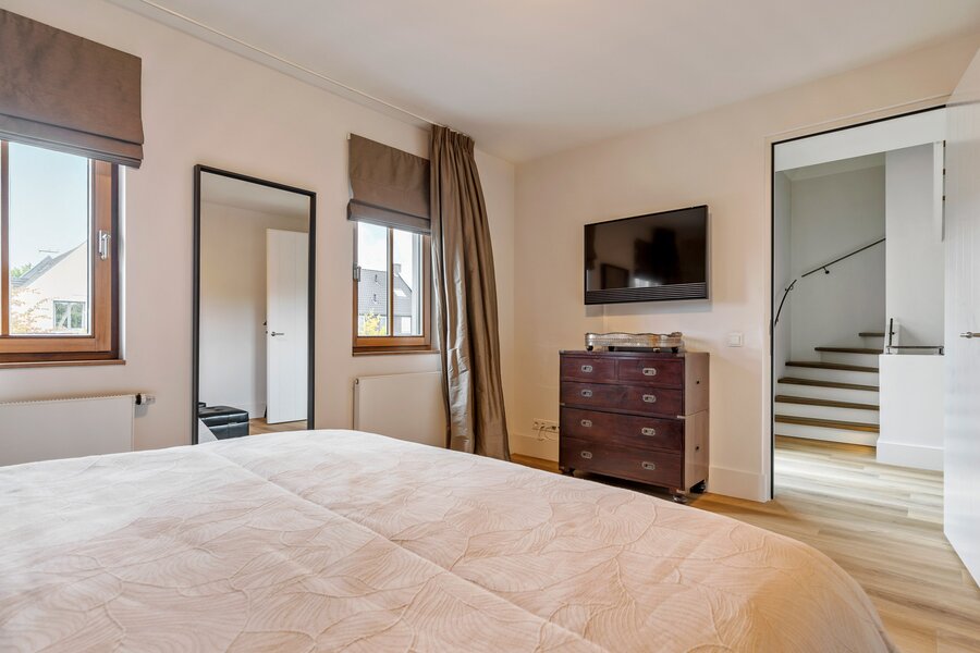 Een slaapkamer en badkamer op de begane grond – misschien niet alledaags, maar bijzonder praktisch en comfortabel. Terwijl de rest van het huis nog slaapt, begin jij hier rustig aan de dag of sluit je de avond ontspannen af. Vanuit het bad, met uitzicht op de tuin, ervaar je dat ultieme gevoel van privacy en ontspanning – wonen in harmonie met de natuur.
