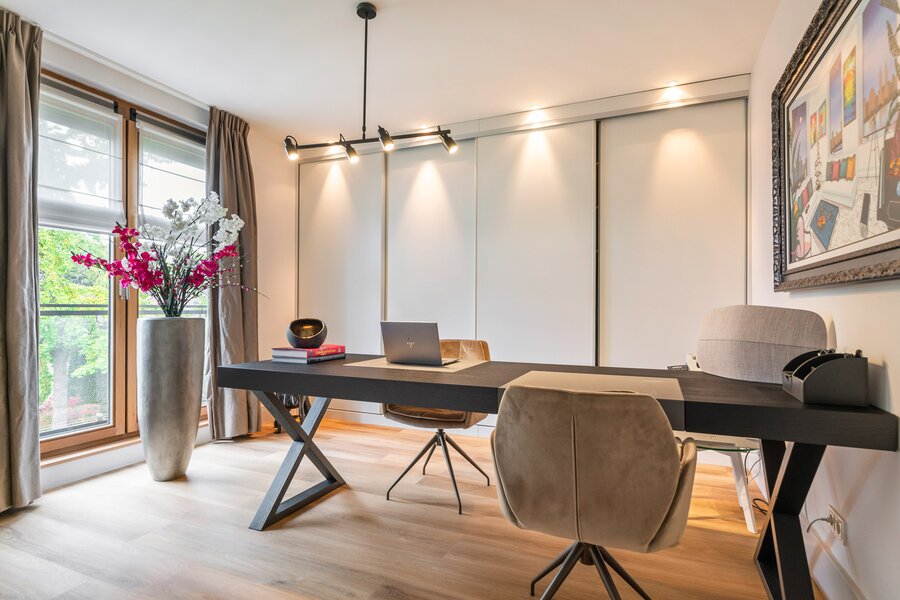 Hier bevinden zich twee bijzonder ruime slaapkamers. De kamer aan de voorzijde, momenteel in gebruik als werkkamer, beschikt over een ingebouwde kastenwand, elektrisch bedienbare zonnescreens en een balkon. Op zonnige dagen zet je hier de deuren open en geniet je van de frisse buitenlucht. De slaapkamer aan de achterzijde is eveneens ruim en licht, met een prachtig uitzicht over de groene tuin.