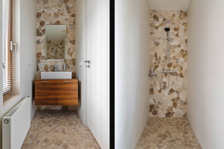 De moderne badkamer op deze verdieping is uitgevoerd in een strak wit ontwerp met een natuurstenen tegel en voorzien van een inloopdouche en wastafelmeubel. Het separate toilet aan de overloop is in dezelfde stijlvolle en natuurlijke sfeer afgewerkt.
