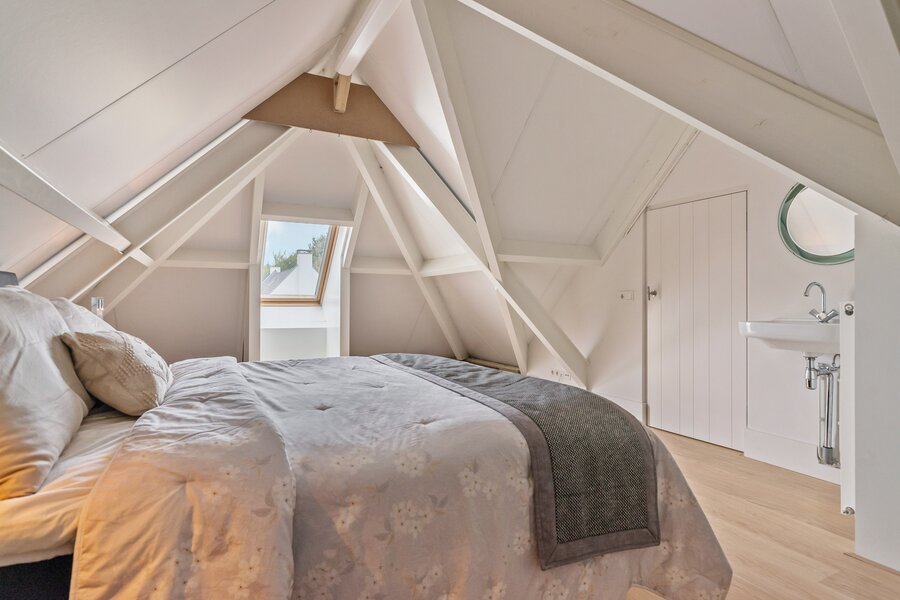 Via een vaste trap bereik je de tweede verdieping, waar zich nog een vierde slaapkamer bevindt. Met het hoge plafond met zichtbare balken, een dakraam en een eigen wastafel is dit een volwaardige ruimte die zich uitstekend leent als speelkamer, fitnessruimte, logeer- of werkkamer. Dankzij de royale afmetingen kun je deze verdieping geheel naar wens inrichten.