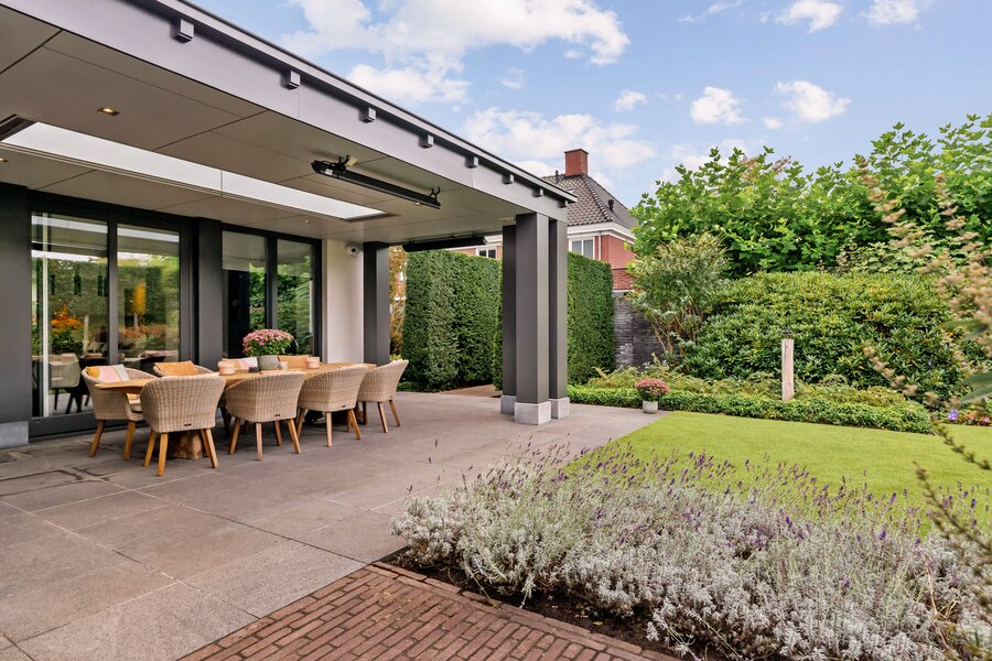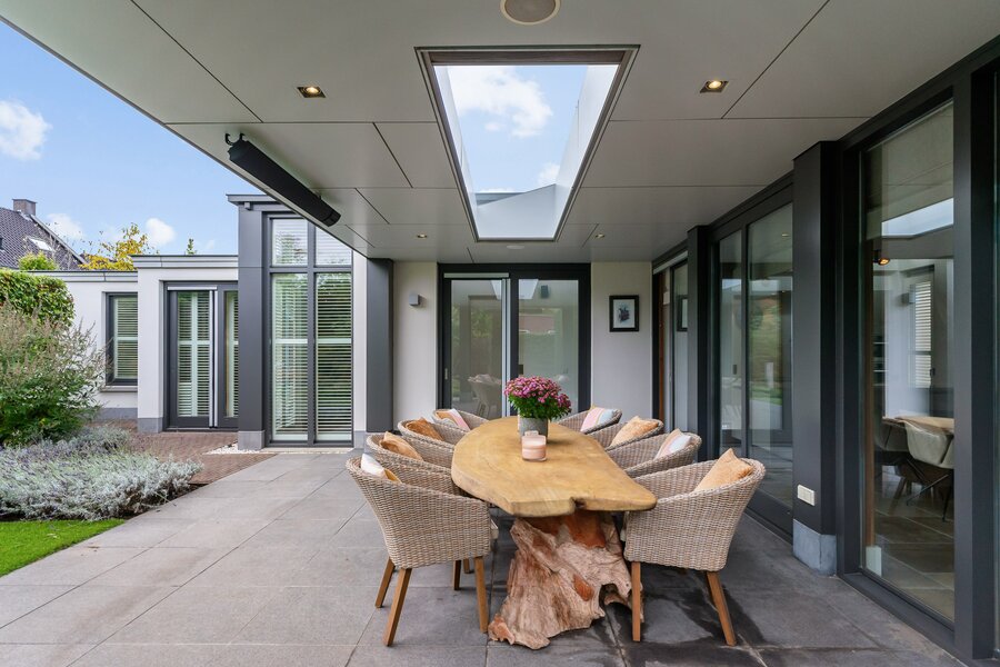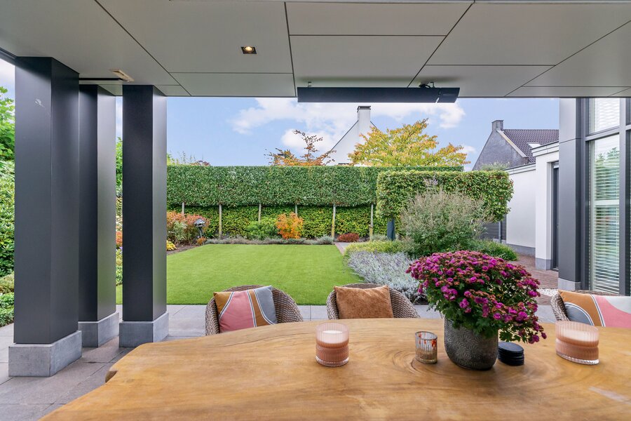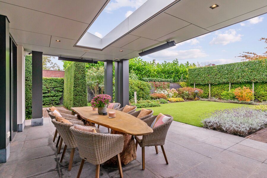 Direct aan de woning ligt een royale overkapping met brede lichtstraat, strakke antracieten tegelvloer, inbouwspots, heaters en ingebouwde speakers. Dankzij het elektrisch bedienbare screen aan de zijkant zit je hier het hele jaar door comfortabel, beschut tegen zon of wind.