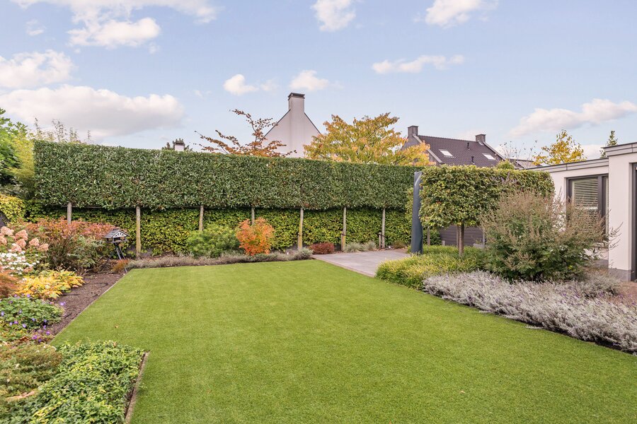 De tuin zelf is prachtig ontworpen met onderhoudsvriendelijk kunstgras van hoge kwaliteit, groene hagen en borders vol vaste planten en bomen. Lavendel, vlinderstruiken en rododendrons zorgen voor kleur en geur in elk seizoen.