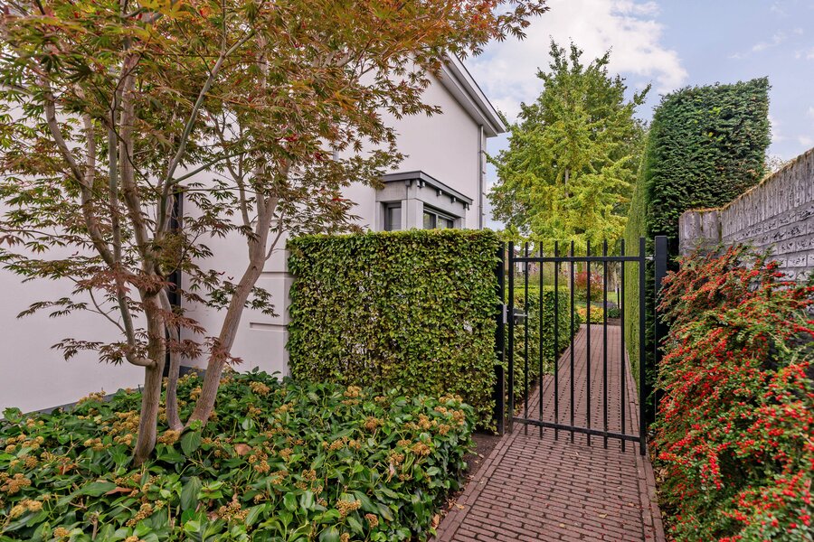 Kom, we nemen een kijkje in de tuin. Via de metalen poort aan de zijkant of de schuifdeuren met schuifhorren bij de eethoek en het tussenportaal stap je direct de achtertuin in. Al bij binnenkomst valt op hoe doordacht en stijlvol deze is aangelegd – een plek waar rust, ruimte en privacy samenkomen.