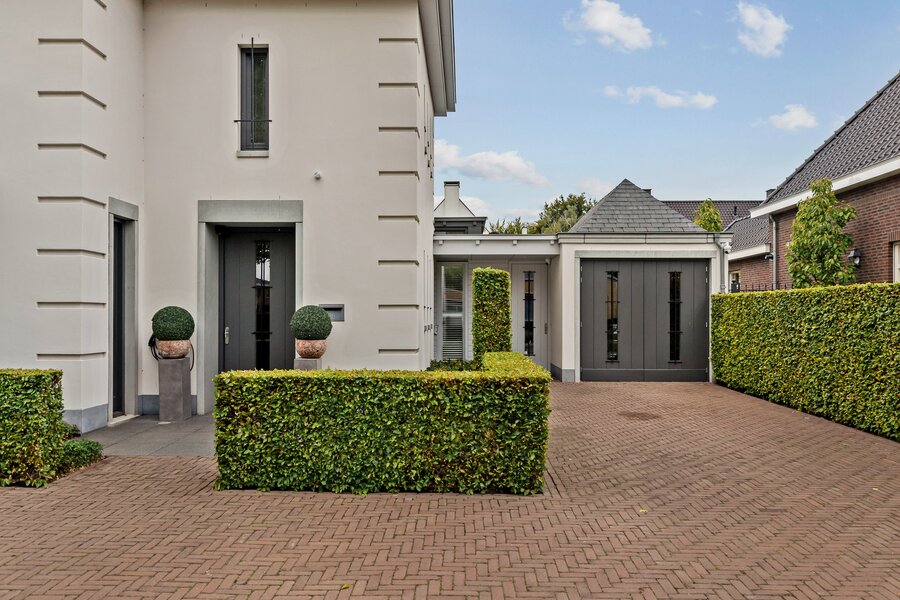 De brede oprit biedt plaats aan meerdere auto’s. Wie liever binnen parkeert, kan terecht in de inpandige garage met twee elektrisch bedienbare openslaande deuren.