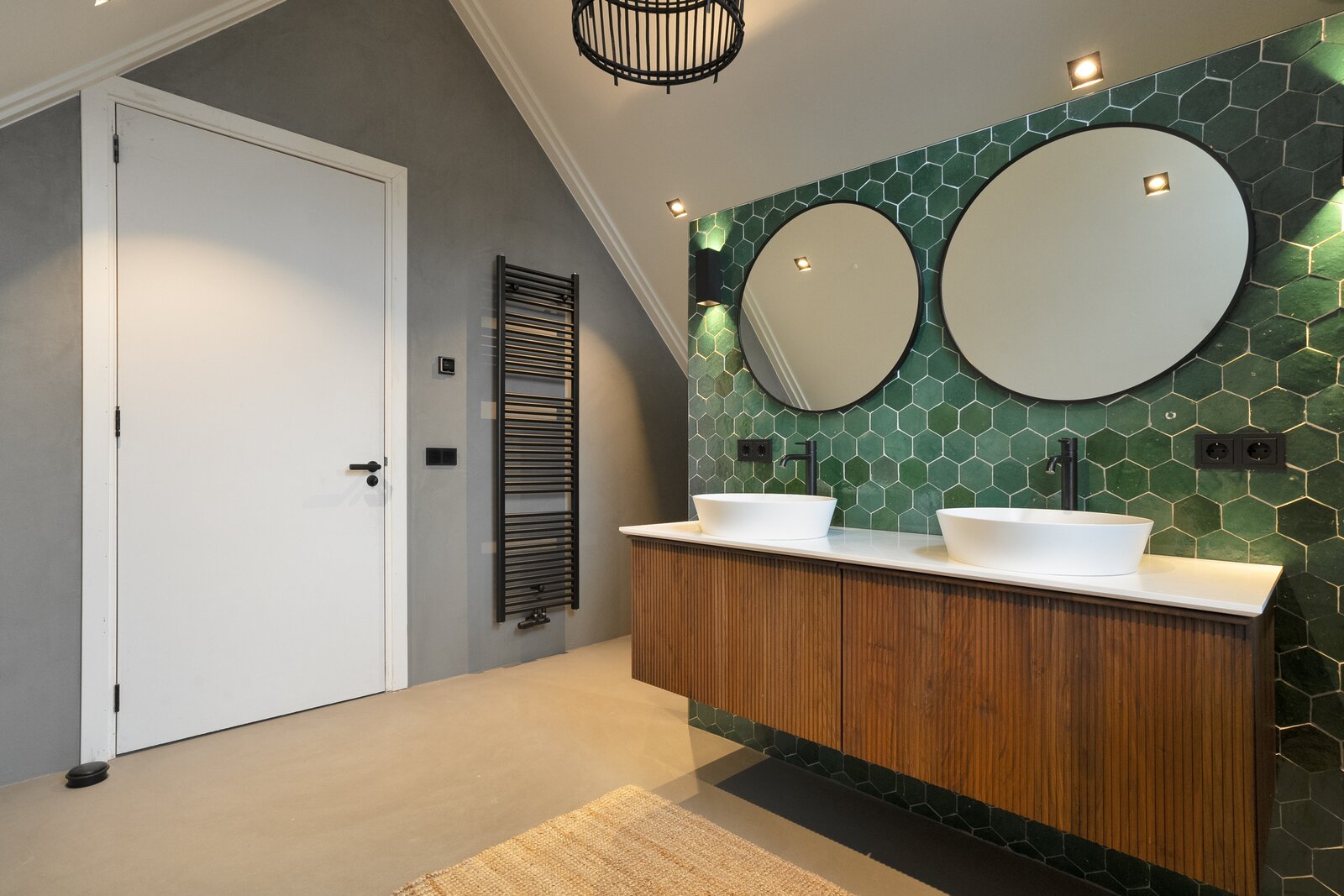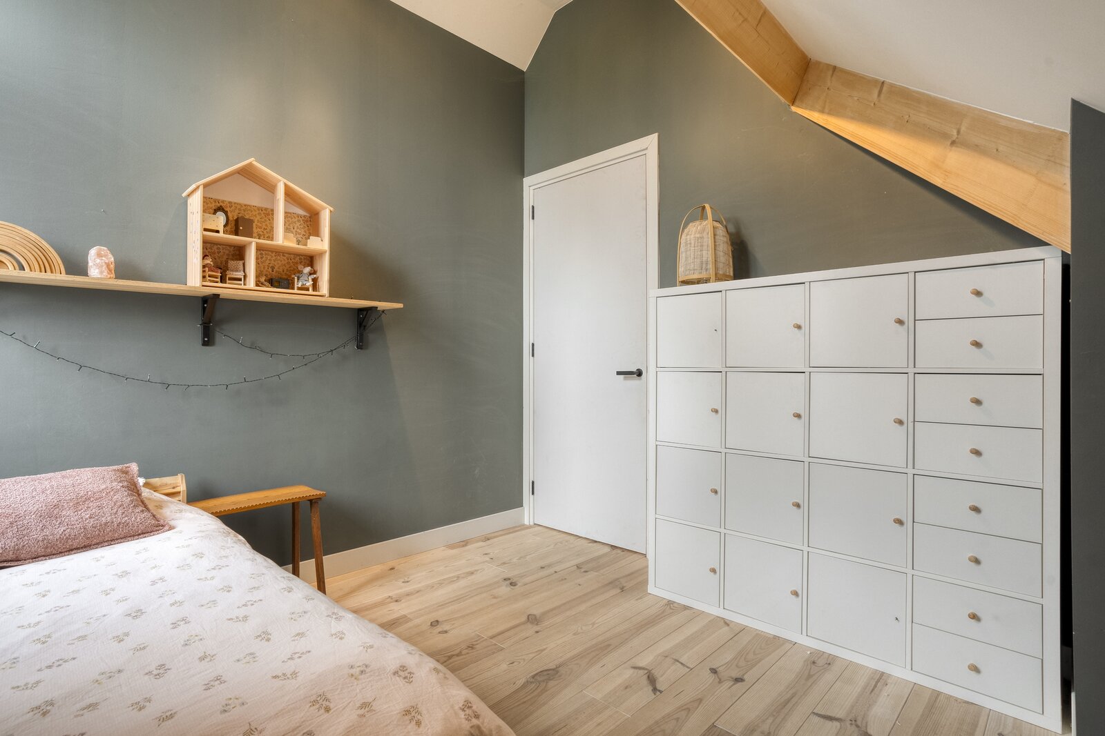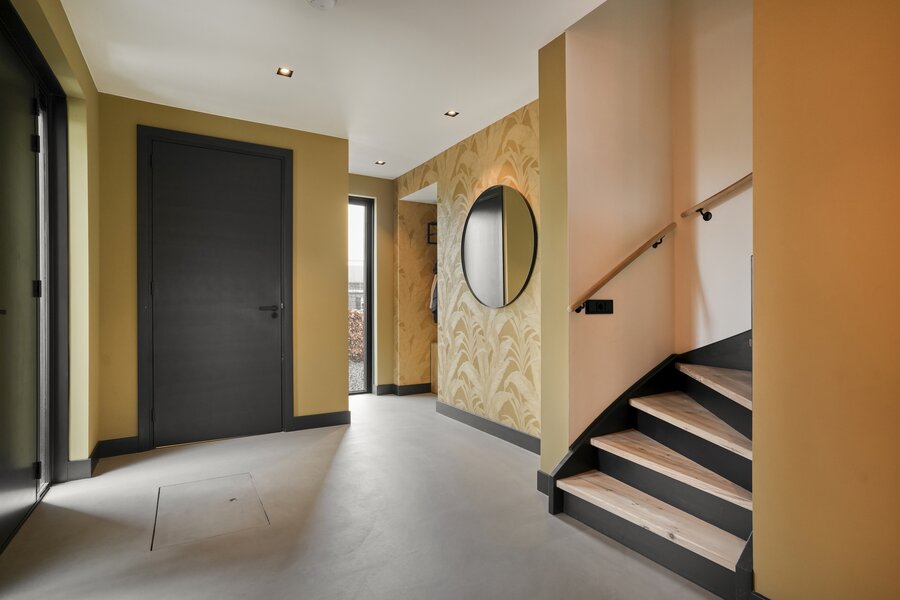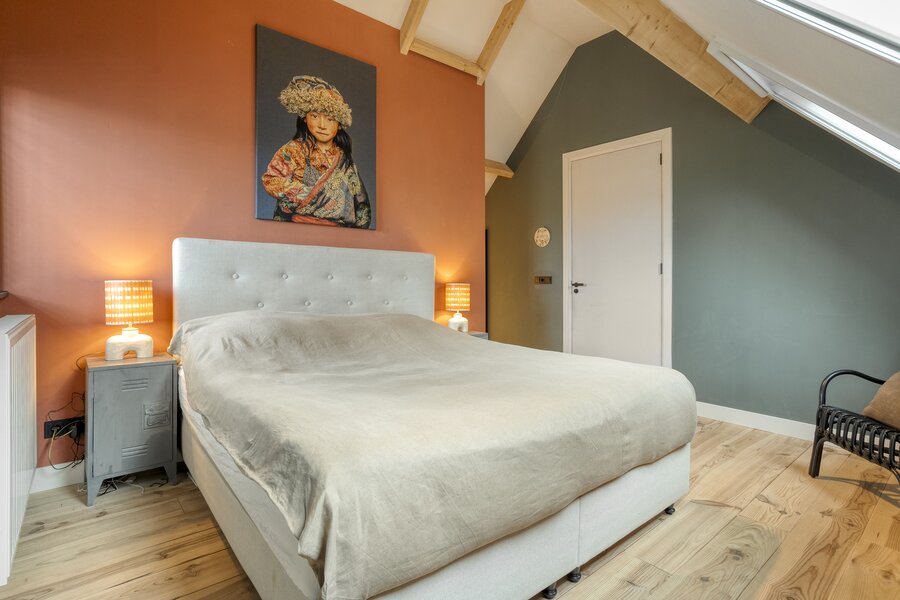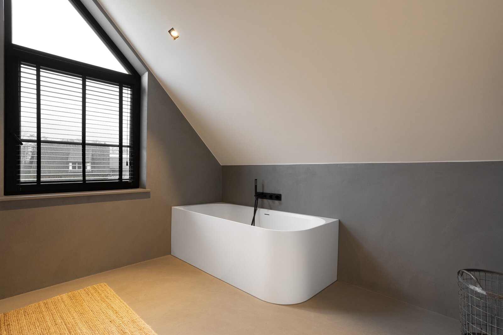 Verdieping: overloop, 4 slaapkamers waarvan één slaapkamer is voorzien van een walk-in-closet. Badkamer met ligbad, inloopdouche, dubbel wastafelmeubel en vloerverwarming. Separate toiletruimte met wandcloset en fonteintje. Technische ruimte/bergruimte met aansluiting voor de wasapparatuur, hier bevindt zich ook de hybride ketel.