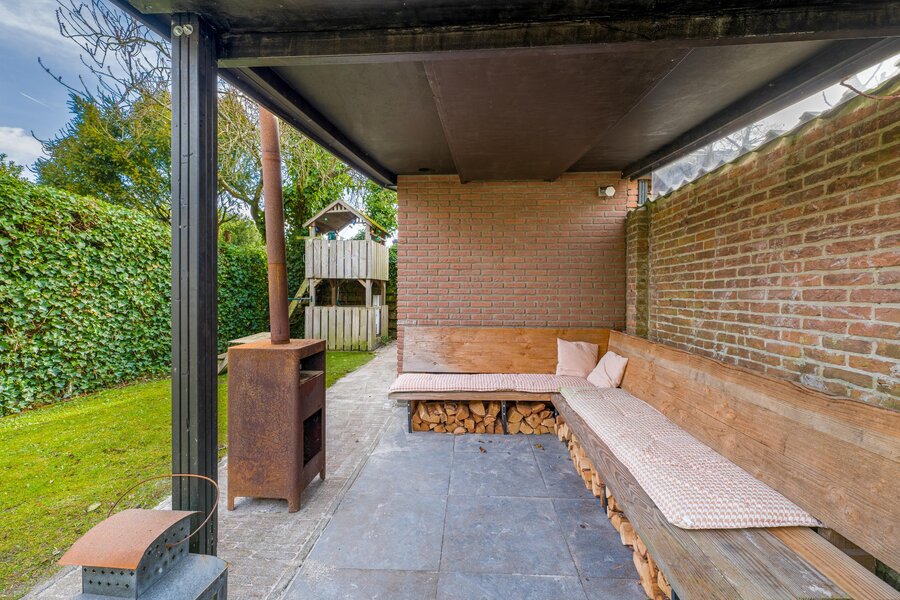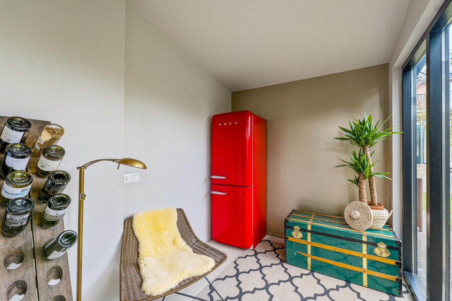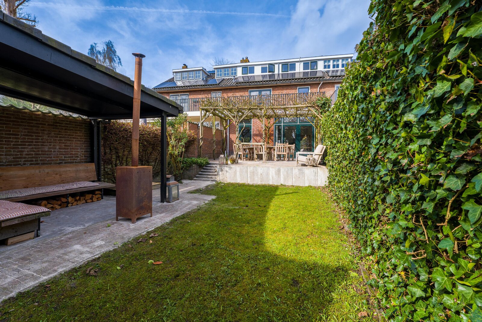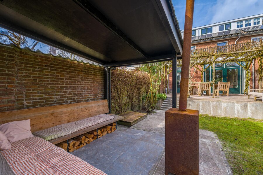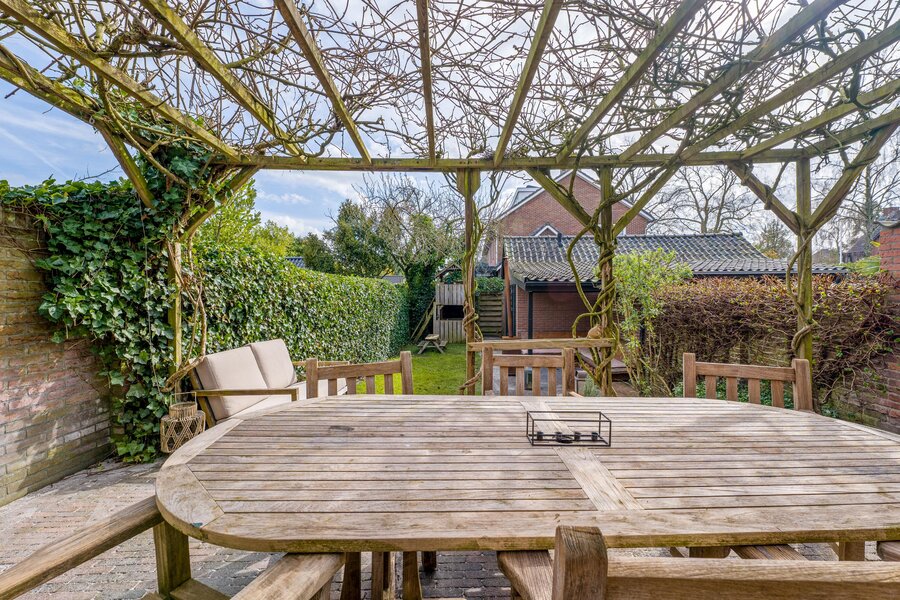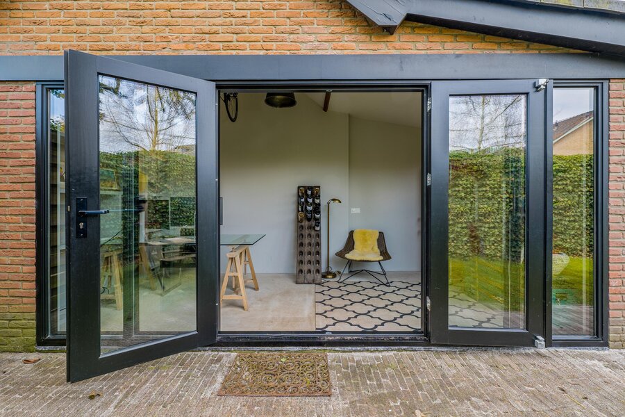 Overdekt entree, ruime vestibule met garderobe, hal, bergkast, zwevend toilet, fraaie taatsdeuren naar de royale Z-vormige woon-/eetkamer met houtkachel en openslaande deuren naar de achtertuin. Ruime keuken met schiereiland waar heerlijk voor vrienden en familie gekookt kan worden. De bar maakt het geheel extra gezellig. Uiteraard is de keuken voorzien van diverse inbouwapparatuur. Vanuit de keuken loopt u het terras op dat fraai overdekt is middels een pergola. De achtertuin is ruim. Hier vindt u de veranda en vervolgens het kantoortje dat voorzien is van comfortabele vloerverwarming.