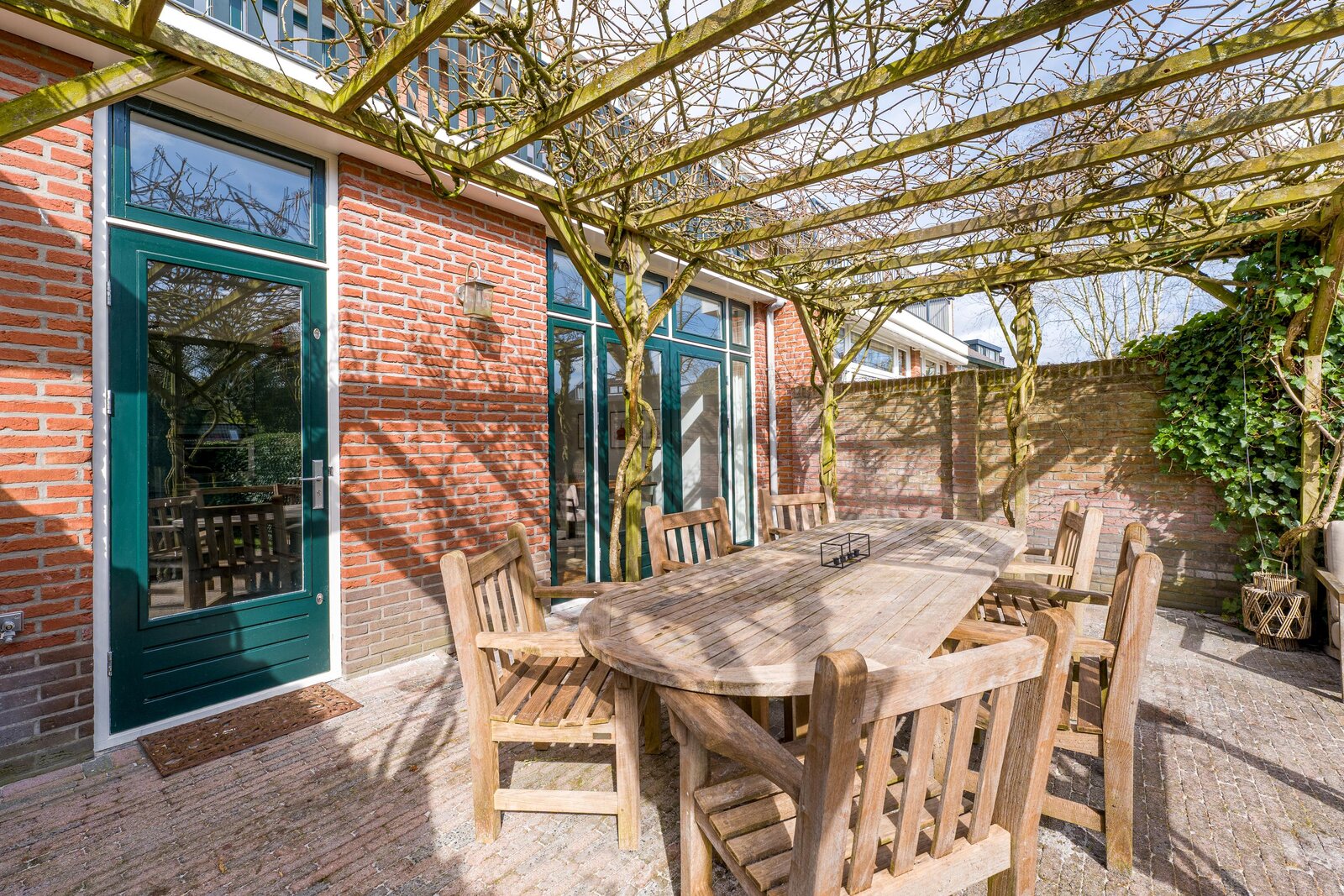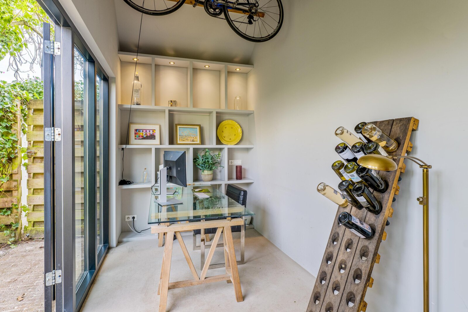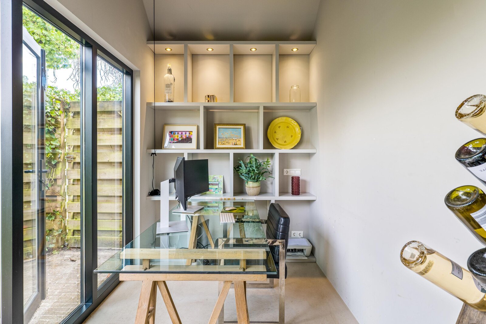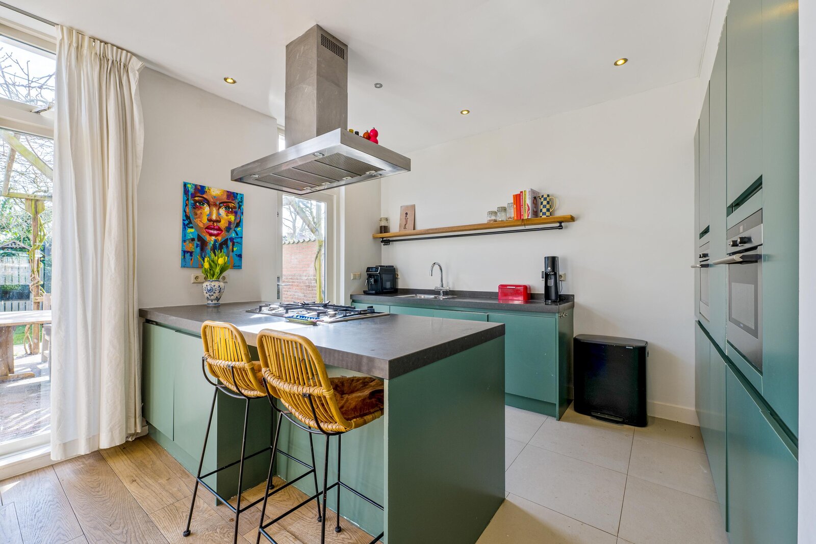 Overdekt entree, ruime vestibule met garderobe, hal, bergkast, zwevend toilet, fraaie taatsdeuren naar de royale Z-vormige woon-/eetkamer met houtkachel en openslaande deuren naar de achtertuin. Ruime keuken met schiereiland waar heerlijk voor vrienden en familie gekookt kan worden. De bar maakt het geheel extra gezellig. Uiteraard is de keuken voorzien van diverse inbouwapparatuur. Vanuit de keuken loopt u het terras op dat fraai overdekt is middels een pergola. De achtertuin is ruim. Hier vindt u de veranda en vervolgens het kantoortje dat voorzien is van comfortabele vloerverwarming.
