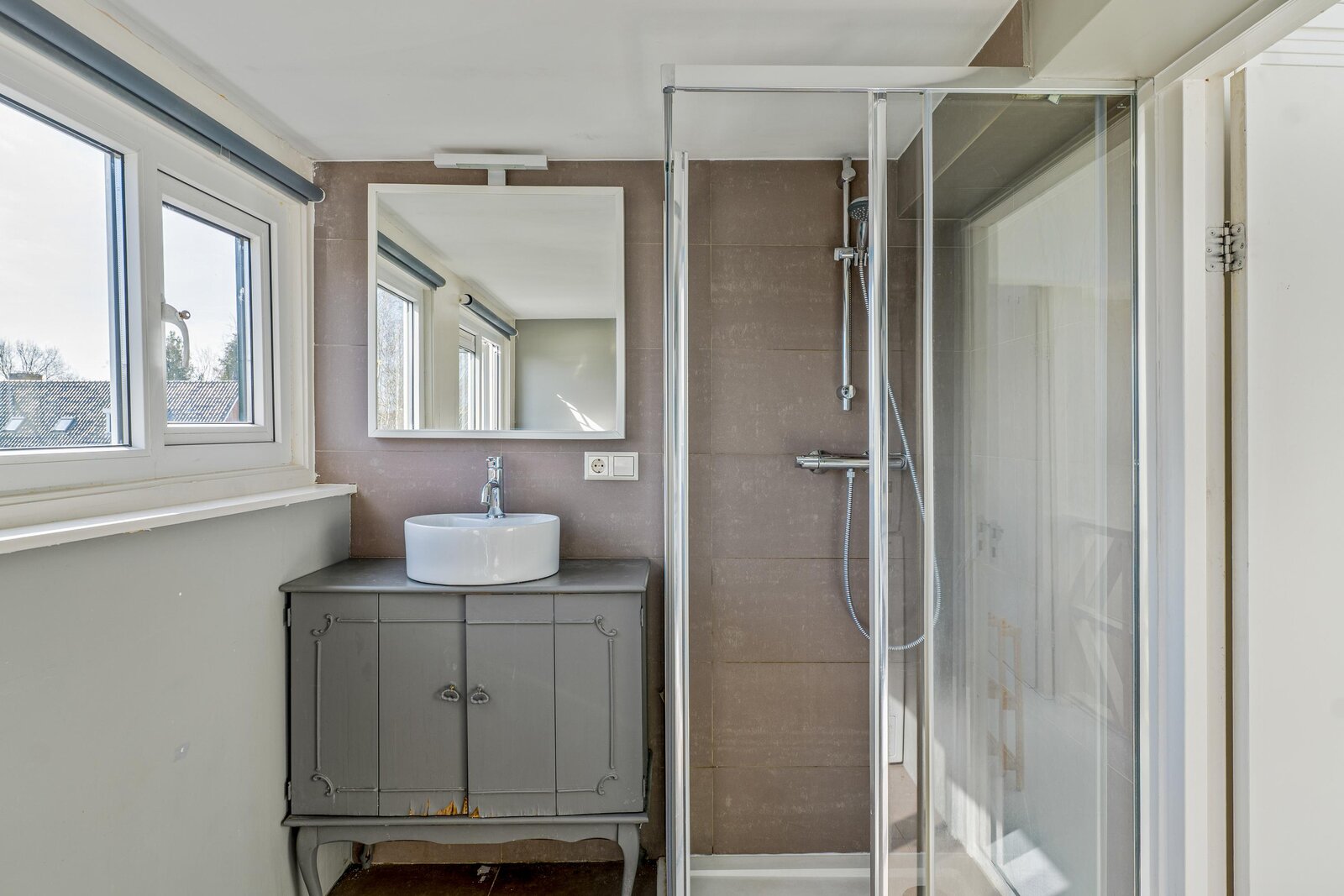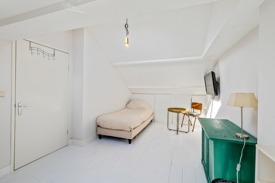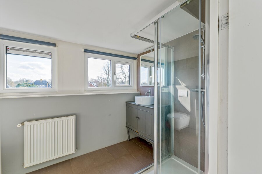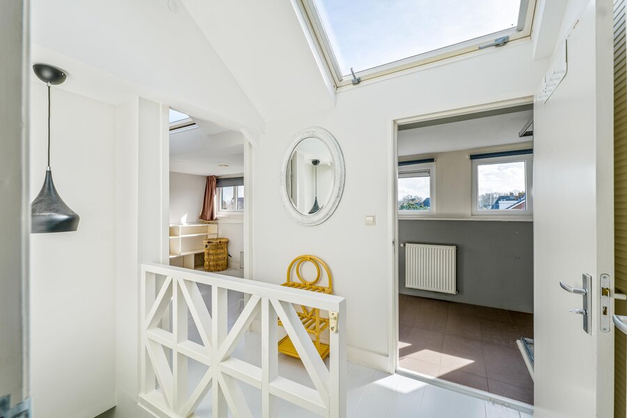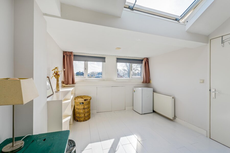 Op de zolder bevindt zich een overloop, een slaapkamer aan de voorzijde met eveneens de opstelling van de cv-ketel. Aan de achterzijde bevindt zich de 2e badkamer die voorzien is van een 3e toilet, wastafelmeubel, douche en de aansluitingen voor de wasmachine en droger. Er is tevens een ruime 5e slaapkamer.