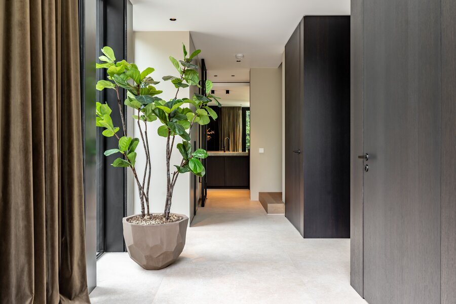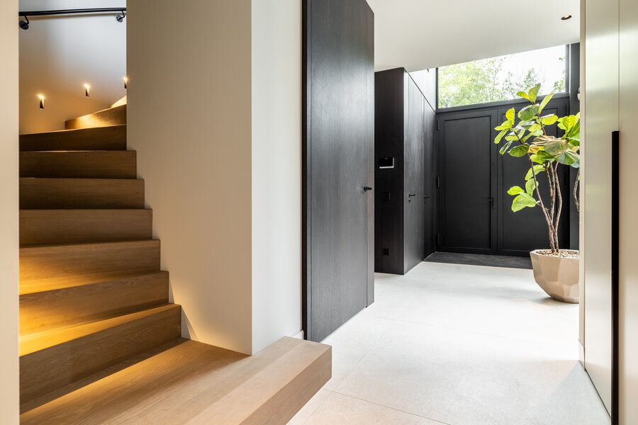 The finishing level is of the highest quality, with natural materials, custom-made built-in wardrobes in nearly every room, luxurious sanitary fittings, and a fully integrated home automation system, including DALI-controlled lighting.