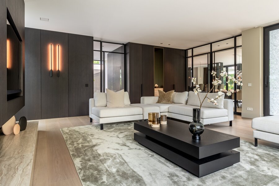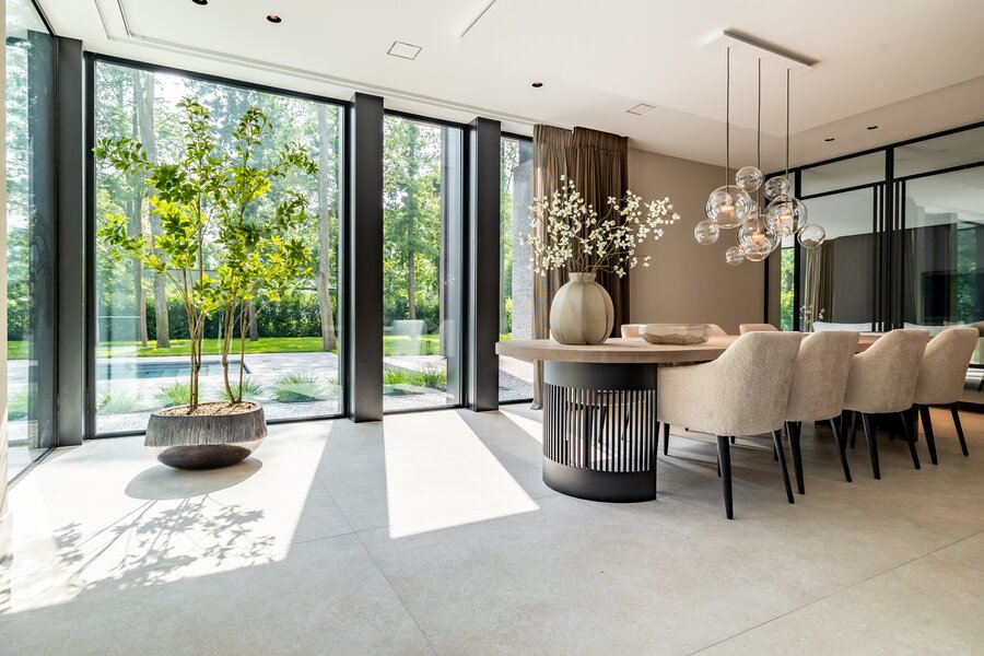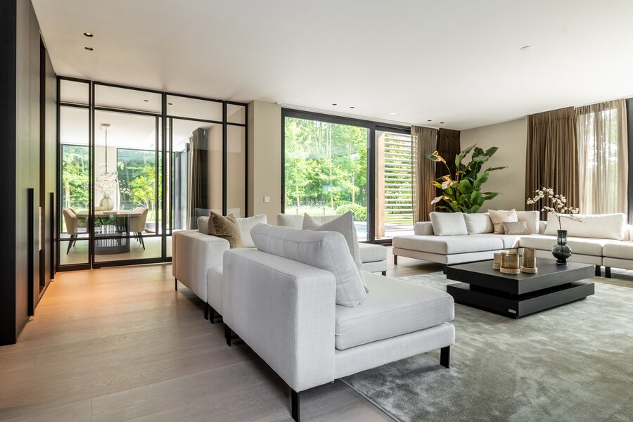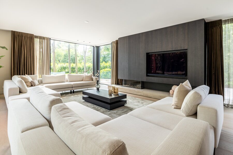 De living is het stijlvolle hart van de woning: een warme, comfortabele ruimte met open haard, plafondhoge ramen en spectaculair uitzicht op de omliggende tuin en het eigen bos. Hier komen gezelligheid, rust en esthetiek samen.