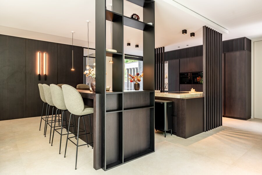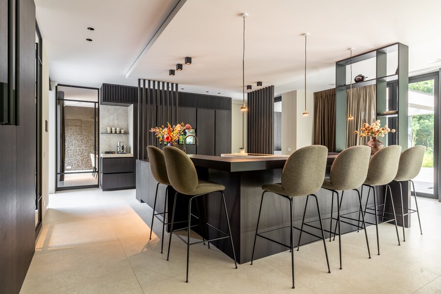 De op maat gemaakte woonkeuken sluit naadloos aan op het interieur en combineert design met functionaliteit. Uitgerust met hoogwaardige Miele-apparatuur, marmeren werkbladen, twee koelkasten, twee vaatwassers, stoomoven, combimagnetron, inductiekookplaat met geïntegreerde afzuiging, vrieskast en een charmante koffiehoek. De eettafel biedt uitzicht op het bos – elke maaltijd wordt hier een bijzonder moment.