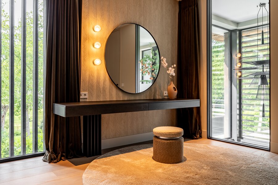 De eerste verdieping biedt een weelderige master suite met zicht op zwembad, tuin en bos. De suite beschikt over een ruime kleedkamer met maatwerk kasten en een luxe badkamer met duo ligbad, inloopdouche, dubbele wastafel en natuurlijke materialen die rust en zachtheid uitstralen.