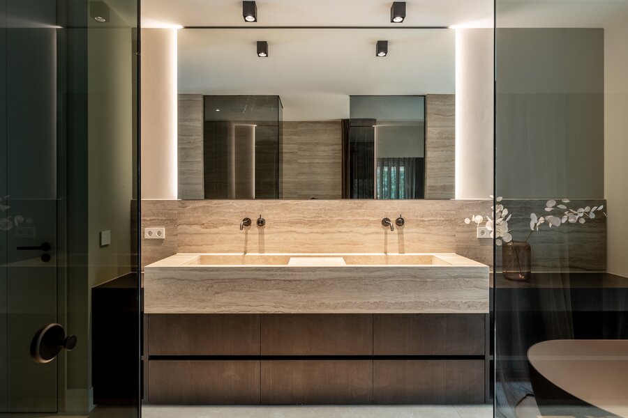 Alle badkamers zijn uitgevoerd met regendouches, natuursteentegels, ingebouwde verlichting en maatwerkmeubels, wat zorgt voor zowel luxe als dagelijks comfort.