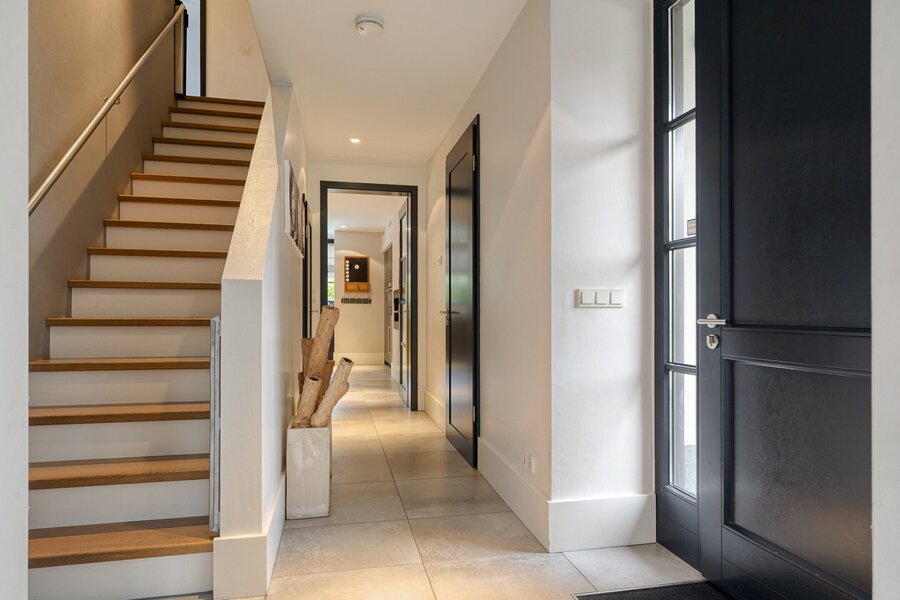 Via de royale entree betreed je de woning. De hal is voorzien van een toilet met urinoir, een garderobenis, meterkast en biedt toegang tot een kantoor- of speelkamer, de living en de trapopgang naar de eerste verdieping. Direct valt de fraaie eikenhouten vloer op, die grotendeels op de begane grond is doorgelegd en stijlvol wordt gecombineerd met plavuizen in de keuken en bijkeuken.