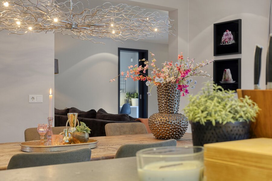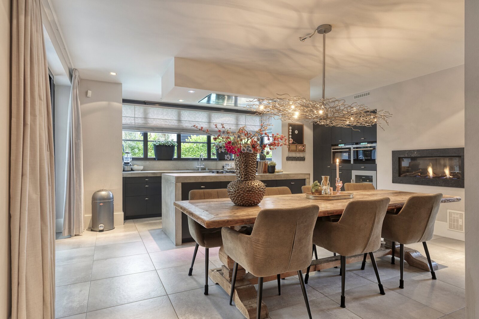 De woonkeuken vormt het hart van de woning en is de verbindende ruimte tussen keuken, woonkamer en tuin. Er is volop plaats voor een grote eettafel: een plek om de dag te beginnen met de krant, samen te dineren met het gezin of ’s avonds met vrienden te genieten van een goed glas wijn. Vanuit de keuken is er via een schuifpui toegang tot de overdekte veranda met glazen separatiewanden (2019) en uitzicht op de fraai aangelegde, groene tuin.