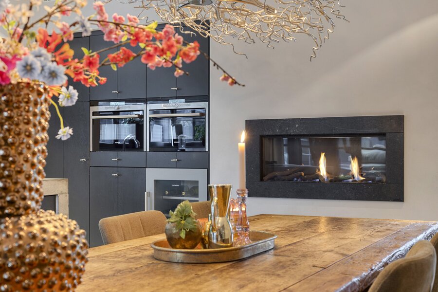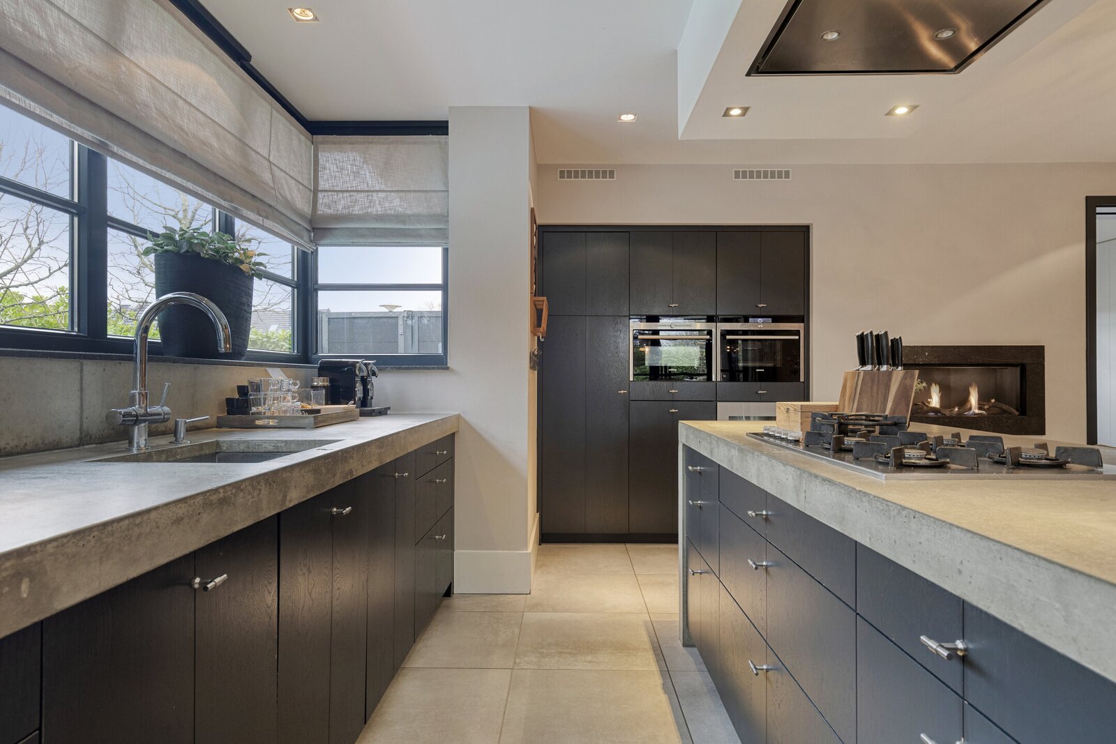 De luxe keuken is uitgevoerd met hoogwaardige A-merk inbouwapparatuur, waaronder een grote gaskookplaat, afzuigschouw, stoomoven, reguliere oven, wijnklimaatkast, vaatwasser, Quooker en koel-vriescombinatie.