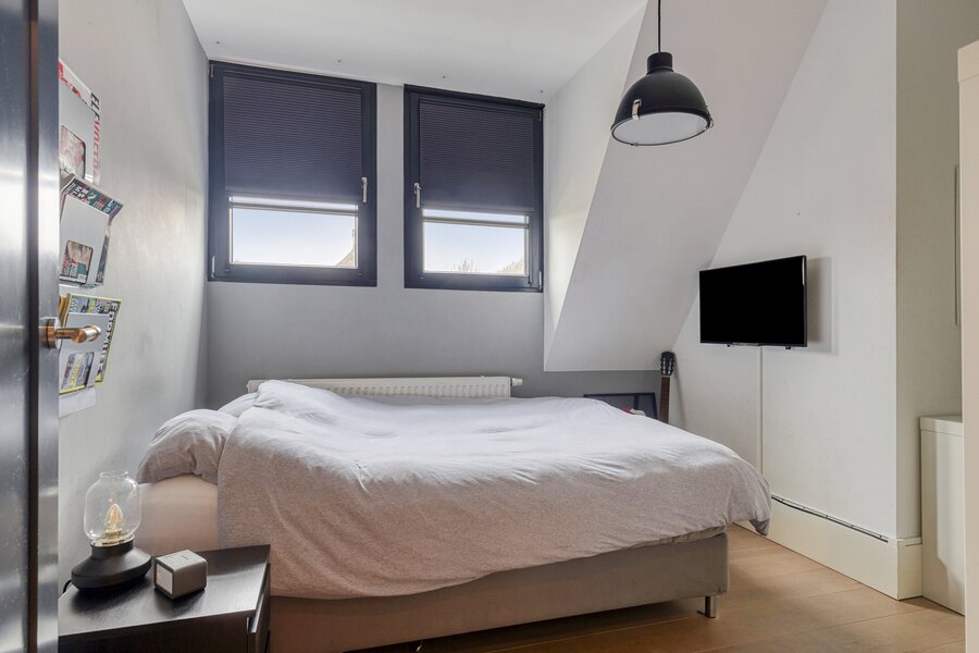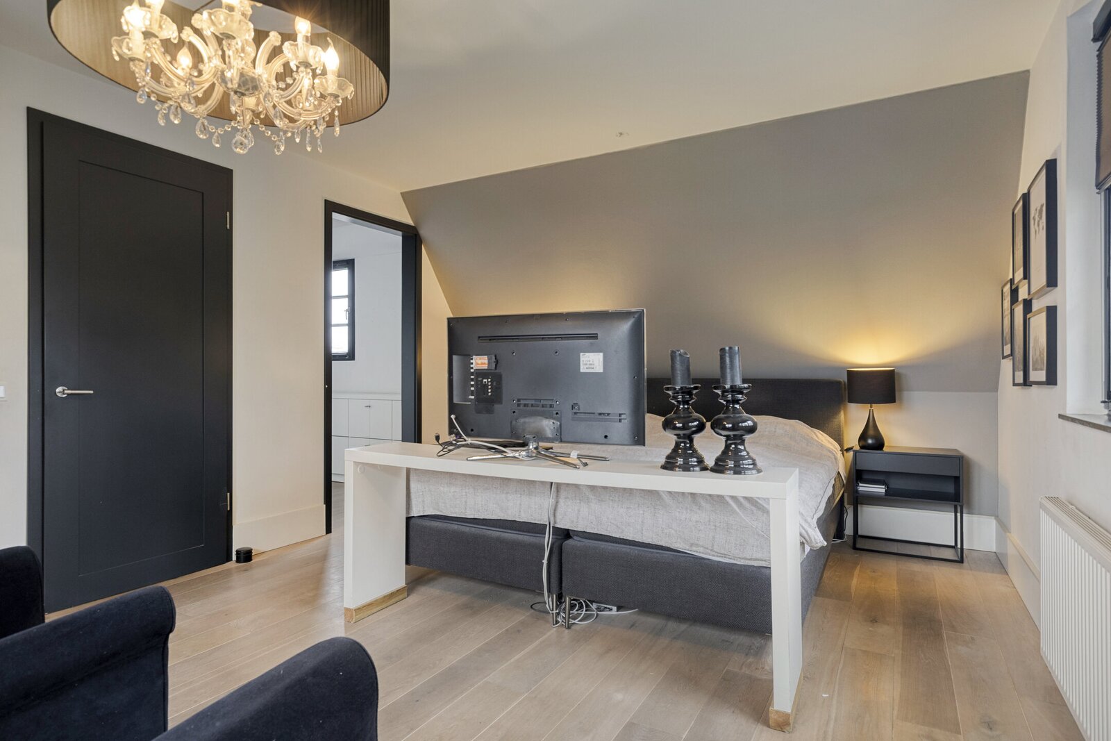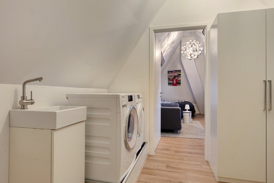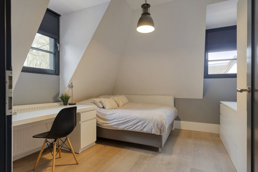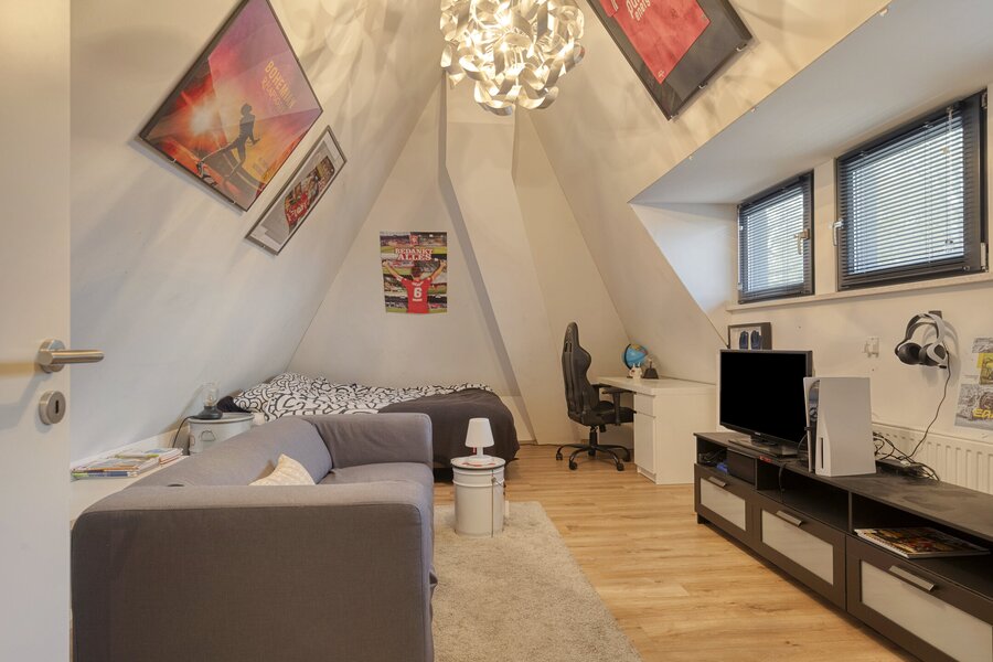 De zolderverdieping is bereikbaar via een vaste trap en herbergt de witgoedruimte en de centrale afzuigunit. Daarnaast bevindt zich hier een vijfde slaapkamer, voorzien van airconditioning. Over de gehele verdieping is praktische bergruimte aanwezig achter de knieschotten.