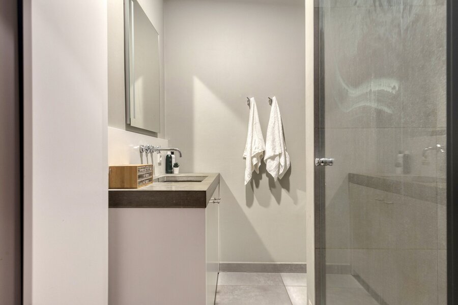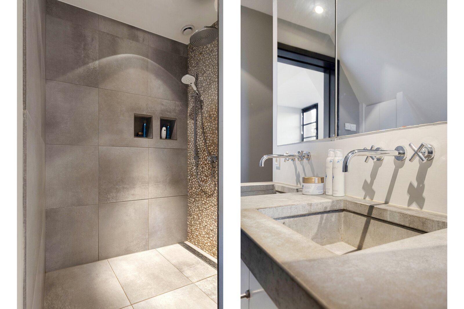 De tweede badkamer is eveneens compleet uitgevoerd met een inloopdouche, wastafelmeubel en toilet.