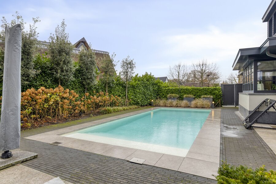 Vanuit de bijkeuken bereik je het verwarmde zwembad (10 x 4 meter, ca. 1,50 m diep) van het type Starline Nova, voorzien van LED-verlichting en een vaste trap. Achter het zwembad is een royale overkapping gerealiseerd met schuifpui, glazen separatiewanden en een aangebouwde berging.