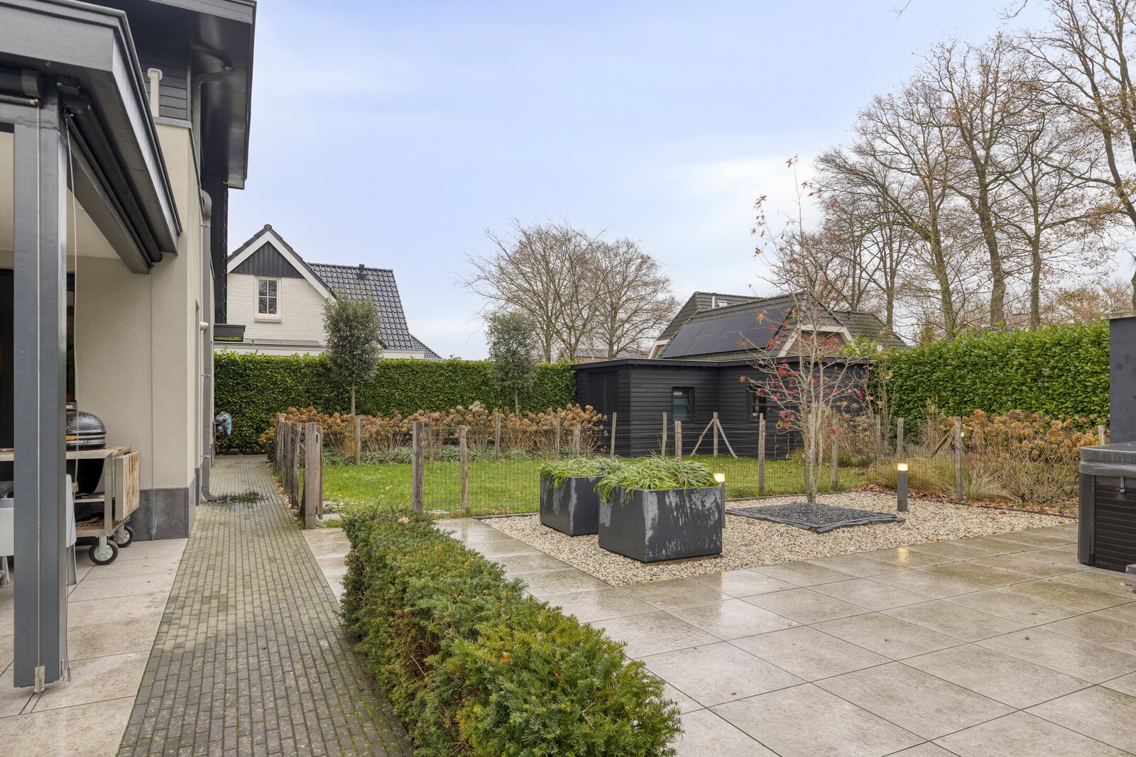 De tuin is fraai aangelegd met een gazon, diverse borders en meerdere zitplekken. Privacy is hier optimaal. Vanaf verschillende plekken in de tuin geniet je van het uitzicht op de woning, die vanuit elke hoek een bijzonder fraai beeld laat zien.