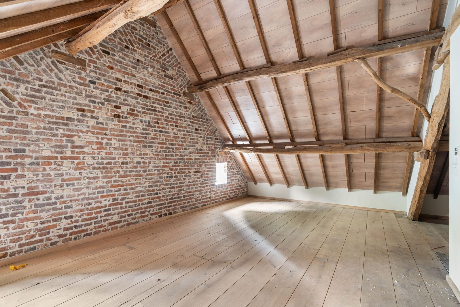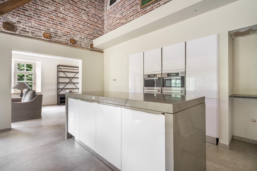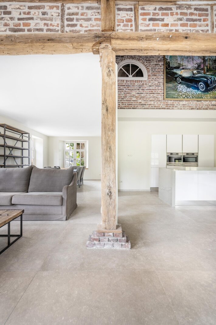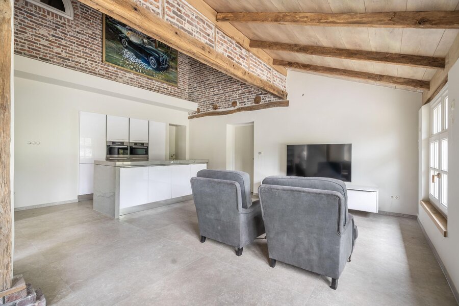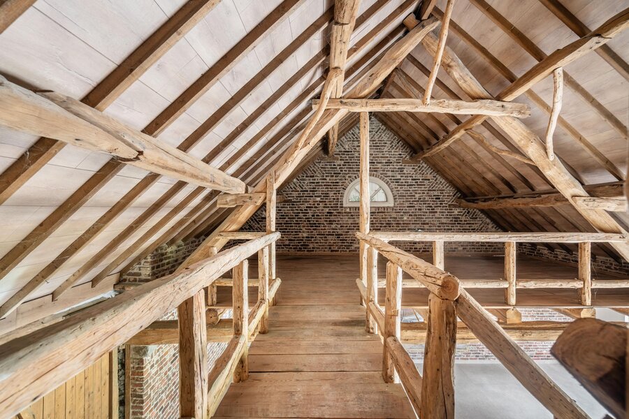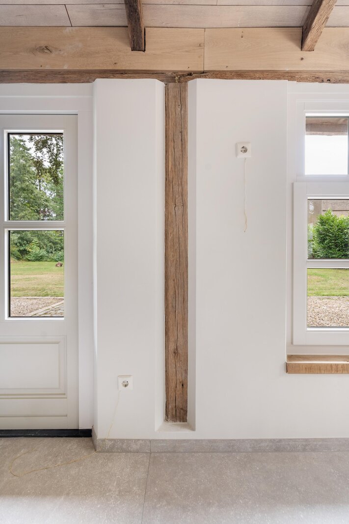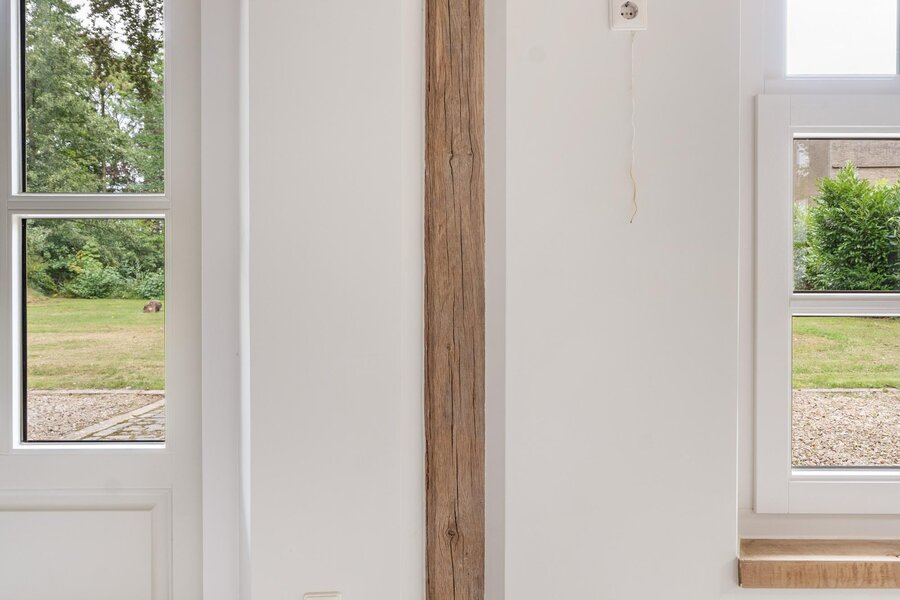 Het rechter gedeelte van de boerderij vormt het woonhart en biedt een royale entree met toegang tot de luxe keuken en de lichte woonkamer. De keuken is uitgerust met hoogwaardige Miele-apparatuur en beschikt over een bijzonder kookeiland dat met één handbeweging kan worden verplaatst en transformeert tot bar. De keuken is nagenoeg ongebruikt en vormt een echte blikvanger. Zowel de keuken als de woonkamer zijn voorzien van vloerverwarming en genieten van een prettige lichtinval. Op de verdieping bevindt zich momenteel een slaapkamer met eiken vloer en voorbereidingen voor een badkamer. De verdieping biedt daarnaast de mogelijkheid om, indien gewenst, twee extra slaapkamers te realiseren, waarmee het woonprogramma eenvoudig kan worden uitgebreid en aangepast aan de behoeften van een gezin of gecombineerd woon-werkgebruik. Daarnaast is dit gedeelte constructief voorbereid op het realiseren van een eigen trap of lift, wat bijdraagt aan toekomstbestendig gebruik.