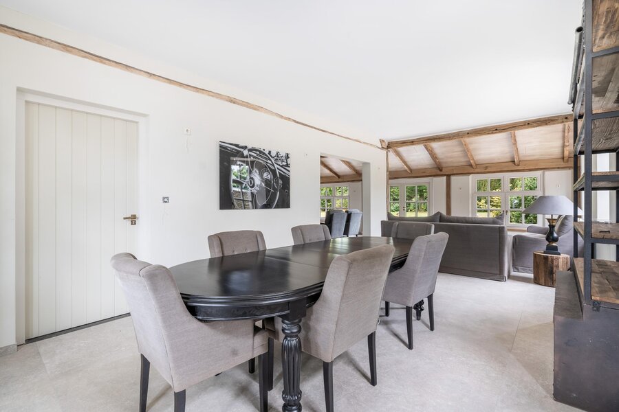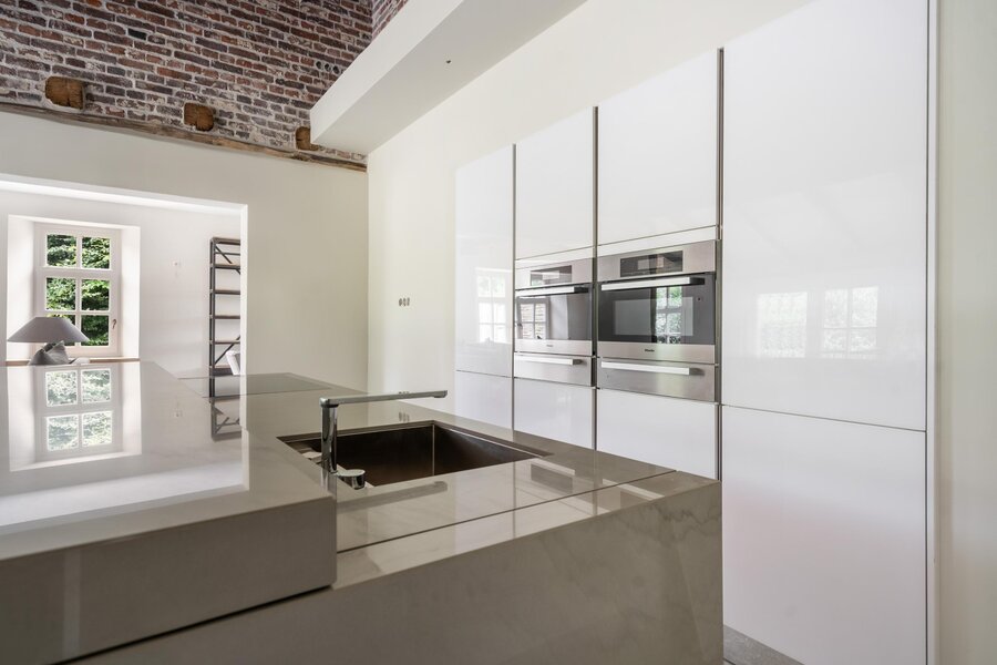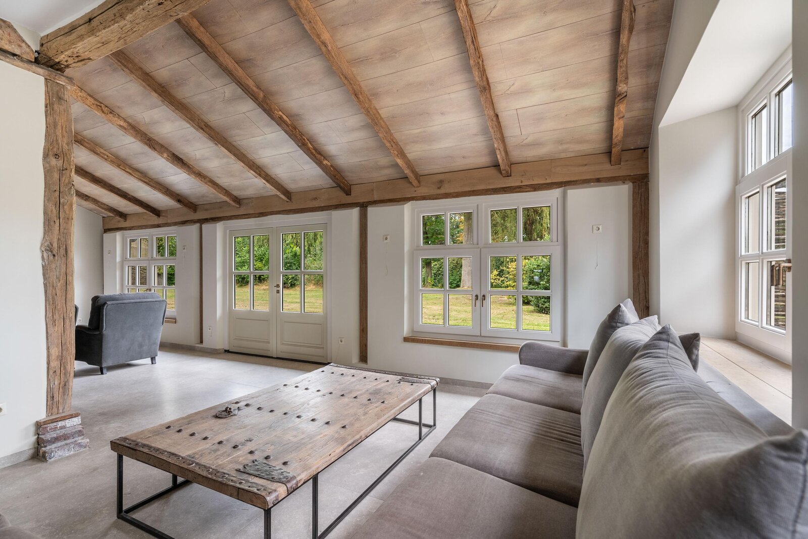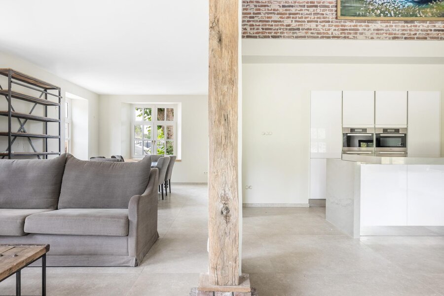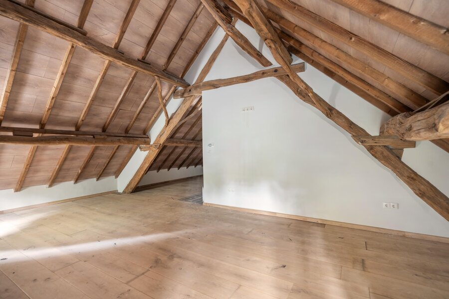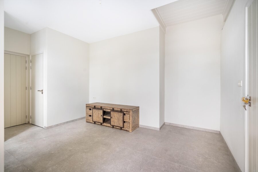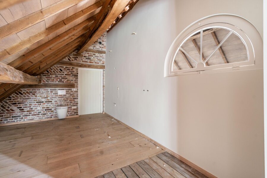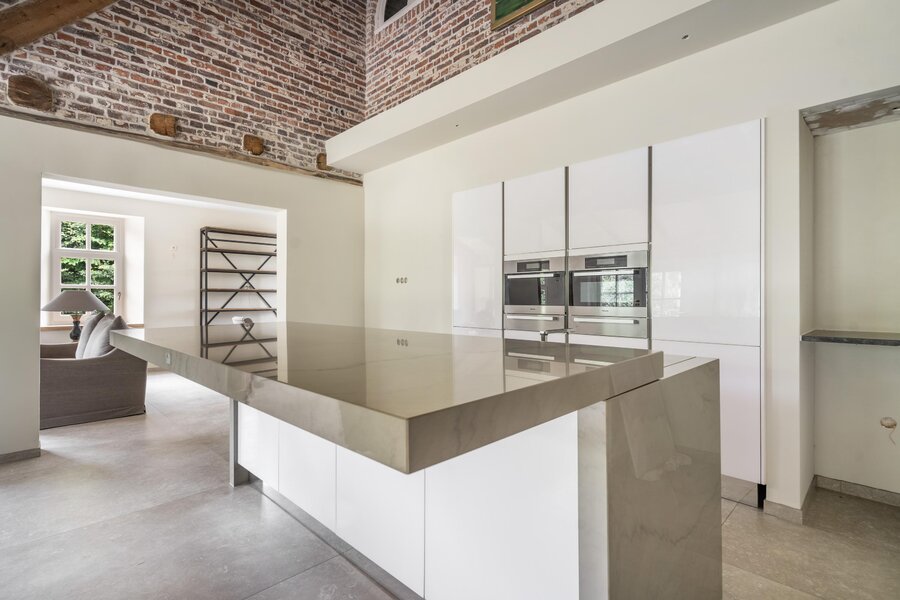 Het rechter gedeelte van de boerderij vormt het woonhart en biedt een royale entree met toegang tot de luxe keuken en de lichte woonkamer. De keuken is uitgerust met hoogwaardige Miele-apparatuur en beschikt over een bijzonder kookeiland dat met één handbeweging kan worden verplaatst en transformeert tot bar. De keuken is nagenoeg ongebruikt en vormt een echte blikvanger. Zowel de keuken als de woonkamer zijn voorzien van vloerverwarming en genieten van een prettige lichtinval. Op de verdieping bevindt zich momenteel een slaapkamer met eiken vloer en voorbereidingen voor een badkamer. De verdieping biedt daarnaast de mogelijkheid om, indien gewenst, twee extra slaapkamers te realiseren, waarmee het woonprogramma eenvoudig kan worden uitgebreid en aangepast aan de behoeften van een gezin of gecombineerd woon-werkgebruik. Daarnaast is dit gedeelte constructief voorbereid op het realiseren van een eigen trap of lift, wat bijdraagt aan toekomstbestendig gebruik.