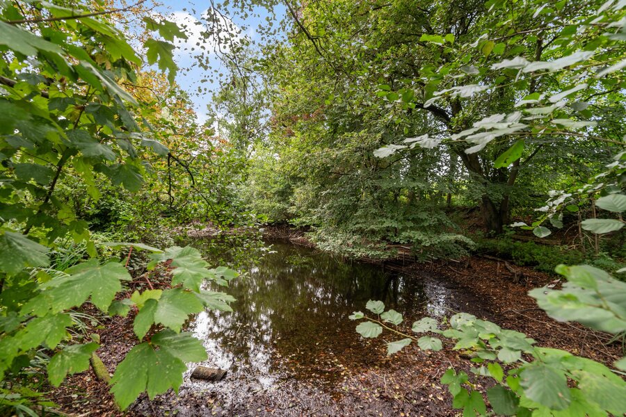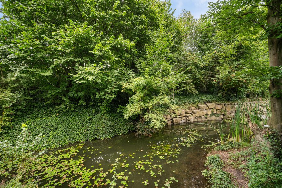 Rondom de boerderij ligt een royale buitenruimte met veel privacy en rust. De tuin biedt volop mogelijkheden voor eigen inrichting en gebruik. Aan de achterzijde bevindt zich een vijver die wordt gevoed door een naastgelegen beek, omgeven door volwassen groen. De buitenruimte sluit uitstekend aan bij zowel representatief wonen als bedrijfsmatig gebruik.
