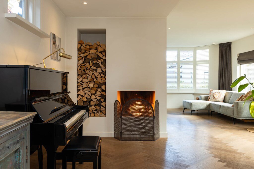 Op de begane grond treft u een lichte, gezellige woonkamer met een sfeervolle open haard. Door het subtiele hoogteverschil ten opzichte van de royale woonkeuken ontstaat een speelse en ruimtelijke indeling.