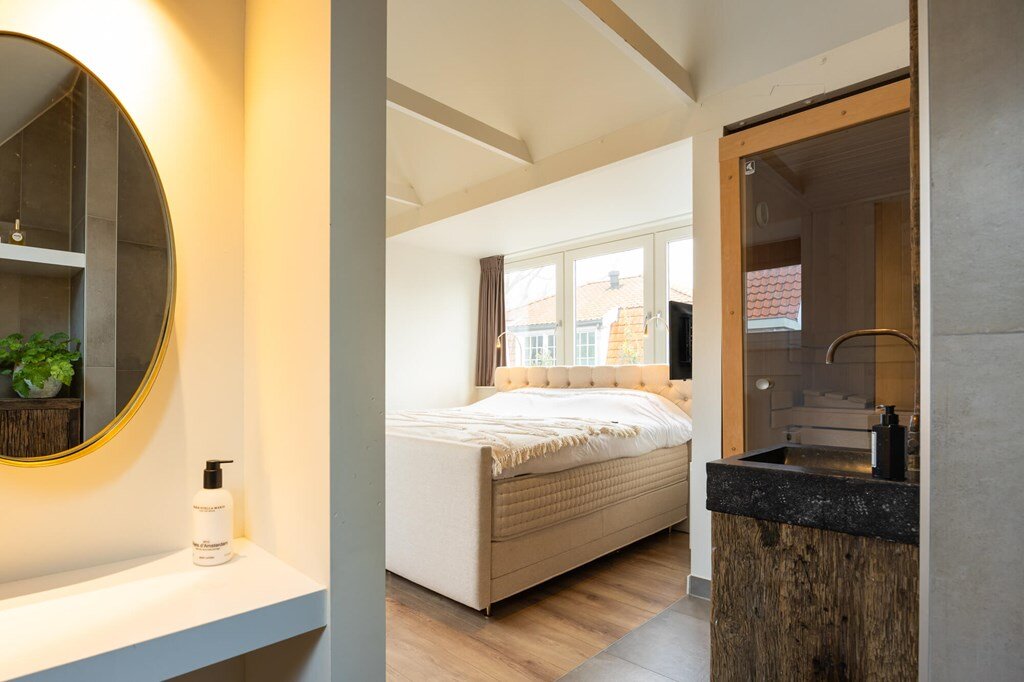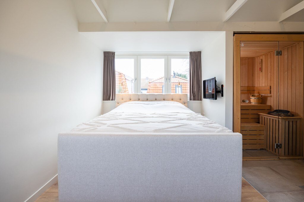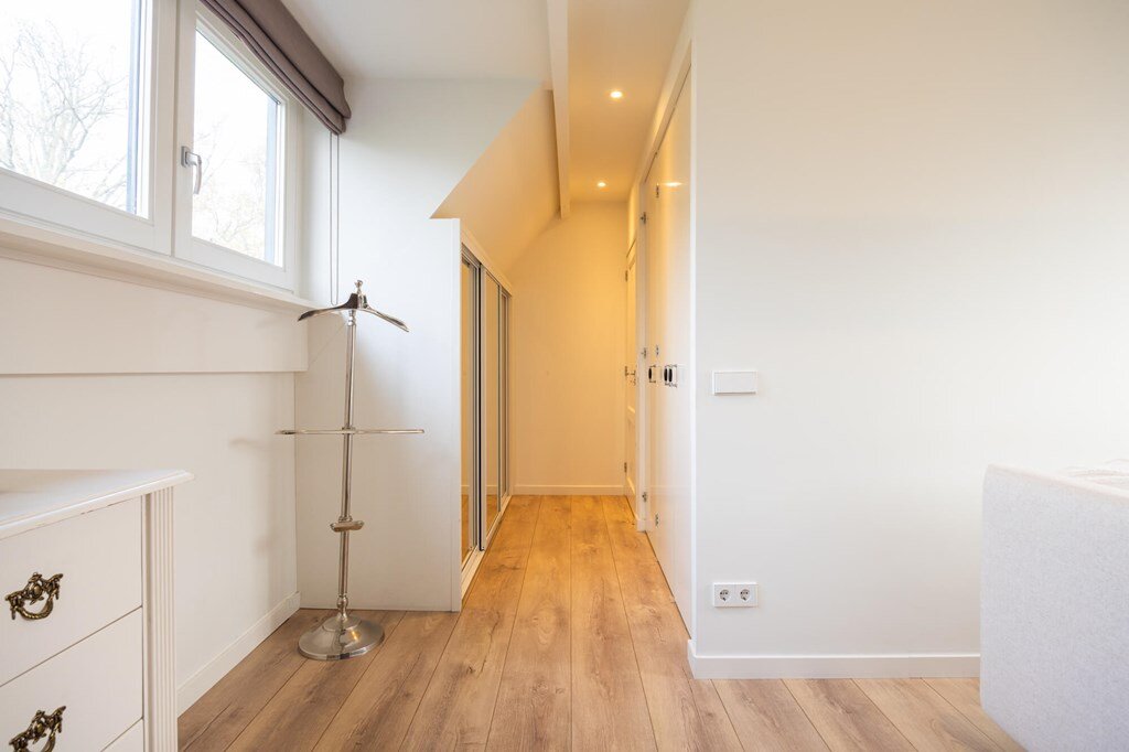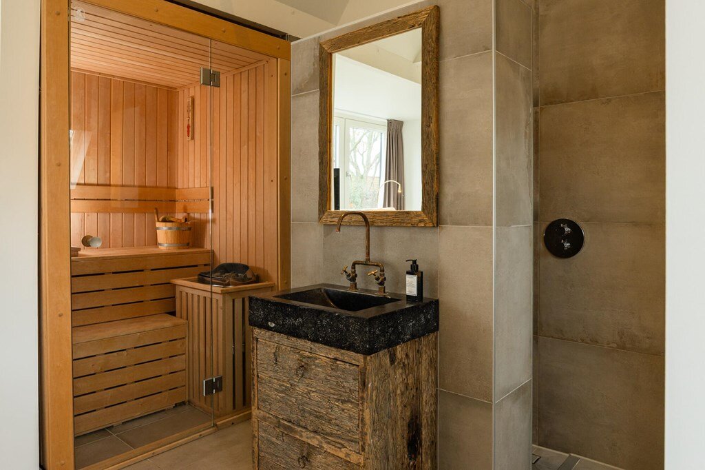 Op de eerste verdieping bevinden zich vier slaapkamers en twee luxe badkamers. De riante hoofdslaapkamer beschikt over een badkamer en-suite met inloopdouche en een Finse sauna, zodat u elke dag kunt genieten van uw eigen wellnessruimte. De op maat vervaardigde badmeubels en kasten van hout vormen een harmonieus geheel en bieden zowel stijl als optimaal gebruiksgemak.