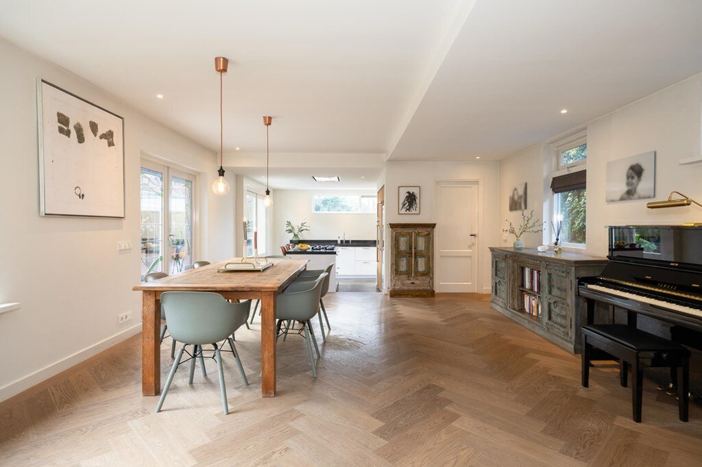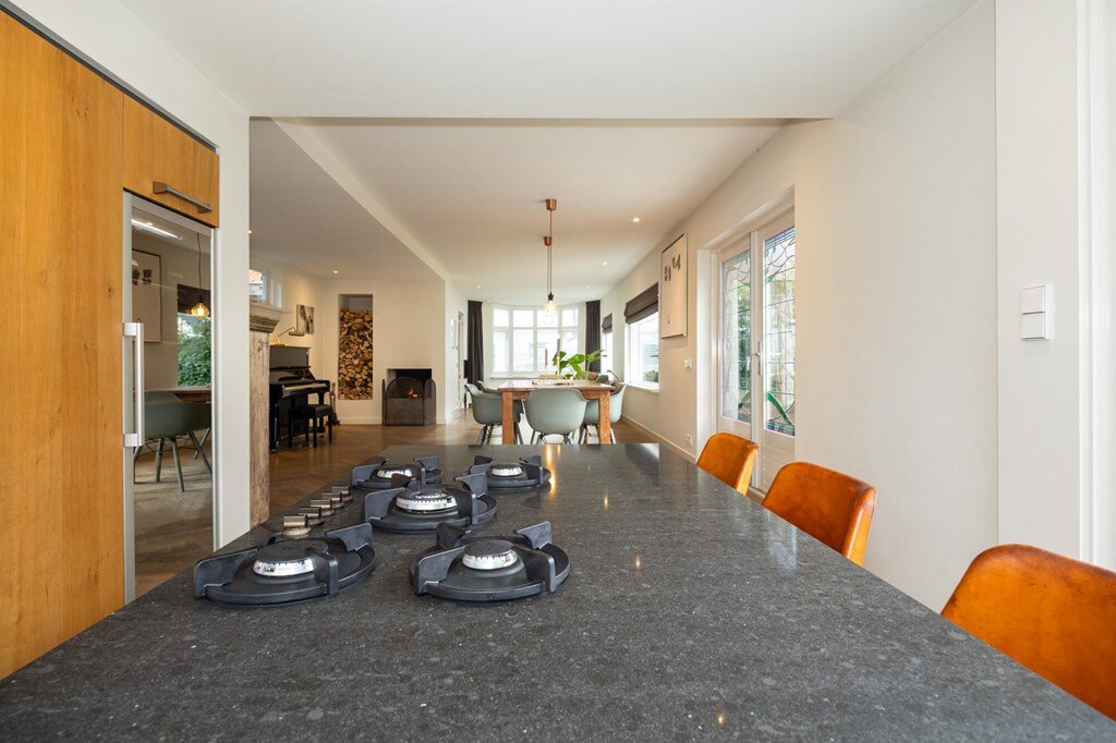 De keuken is een droom voor iedere kookliefhebber: voorzien van Boretti inbouwapparatuur, heeft een Quooker en granieten aanrecht, een kookeiland en een Bosch wijnklimaatkast. De eikenhouten visgraatvloer voorzien van vloerverwarming zorgt voor een warme en luxe uitstraling. Openslaande deuren met romantisch glas-in-lood geven toegang tot de tuin en laten veel daglicht binnenstromen.