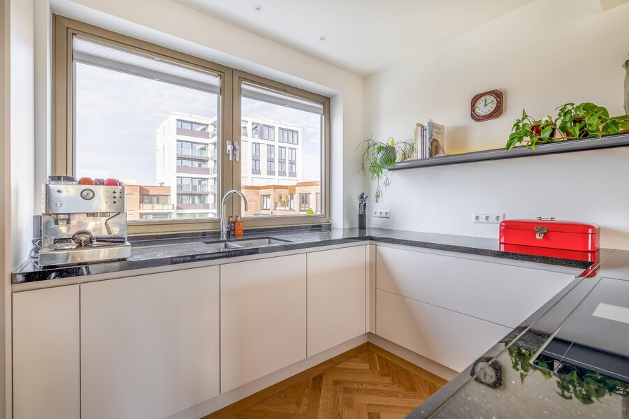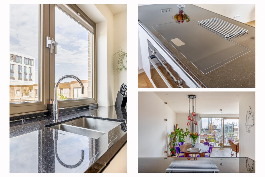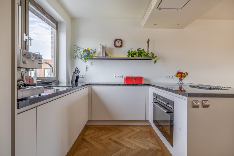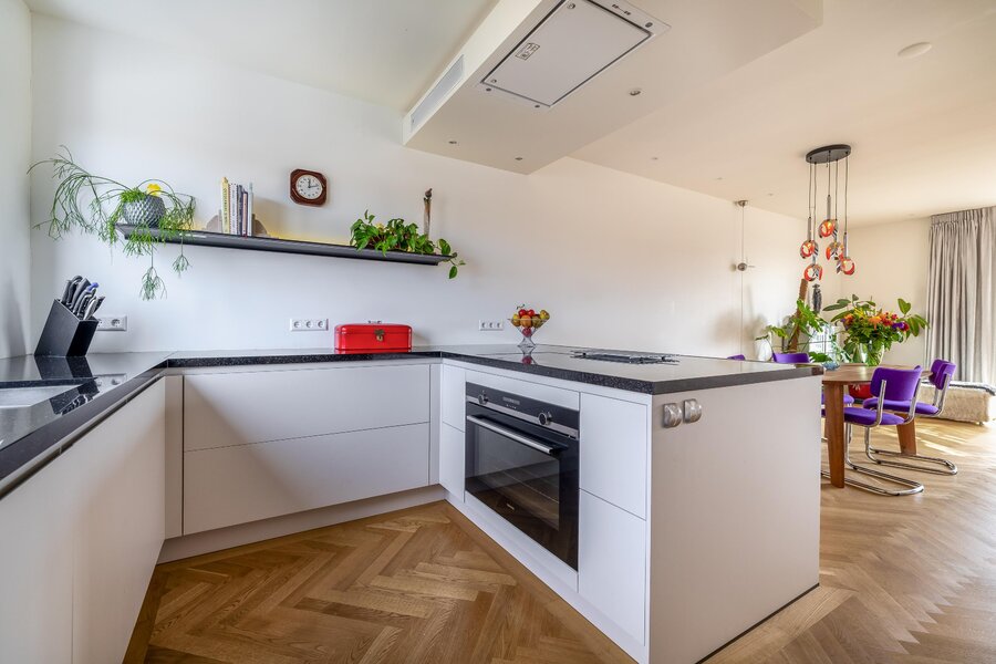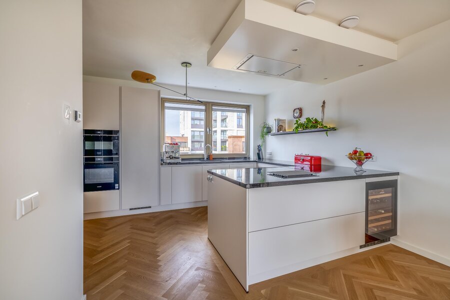 Via de centrale entree met lift en trappenhuis bereik je de woning op de vierde verdieping. Je stapt binnen in een ruim opgezet appartement dat direct indruk maakt met zijn hoogwaardige afwerking, rust en ruimte. De open keuken is strak vormgegeven in een u-opstelling met kookeiland en beschikt over alle wenselijke inbouwapparatuur, waaronder een combi oven-/magnetron, combi oven-/stoomoven, grote heteluchtoven (1 meter breed), bijpassende vrije veld inductiekookplaat, afzuigkap, vaatwasser, Quooker en een wijnkoeling. Het duurzame granieten werkblad vormt een stijlvol geheel met de strakke met de lichte kasten met lades.