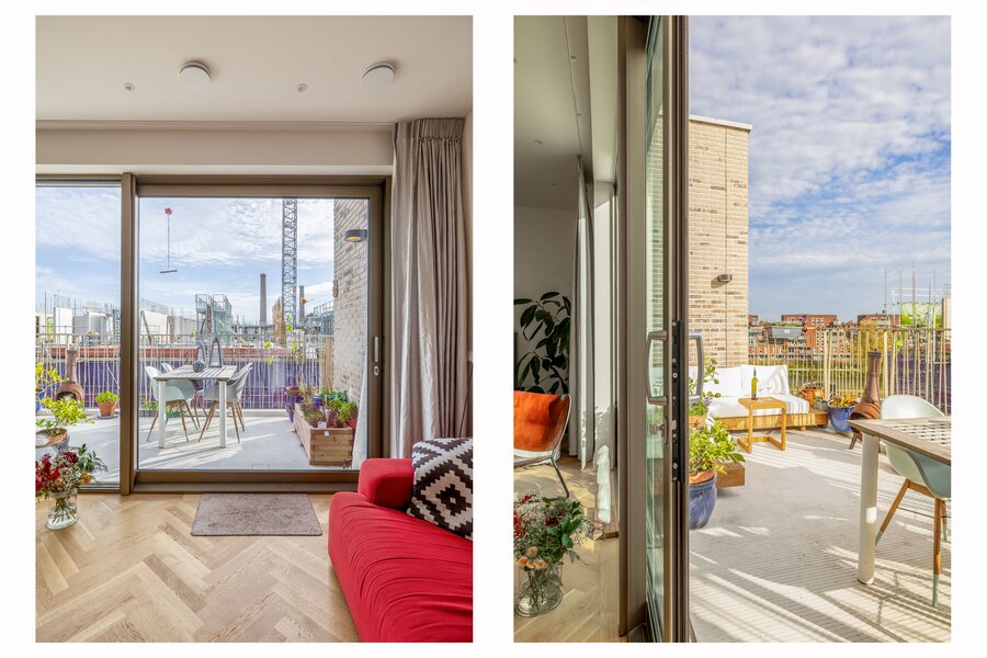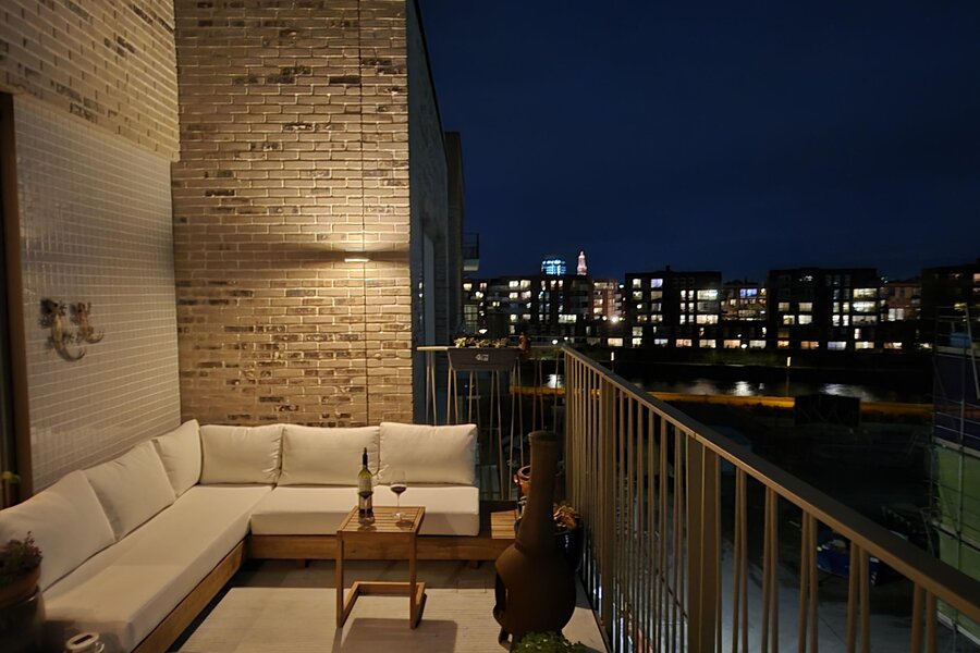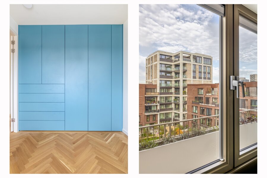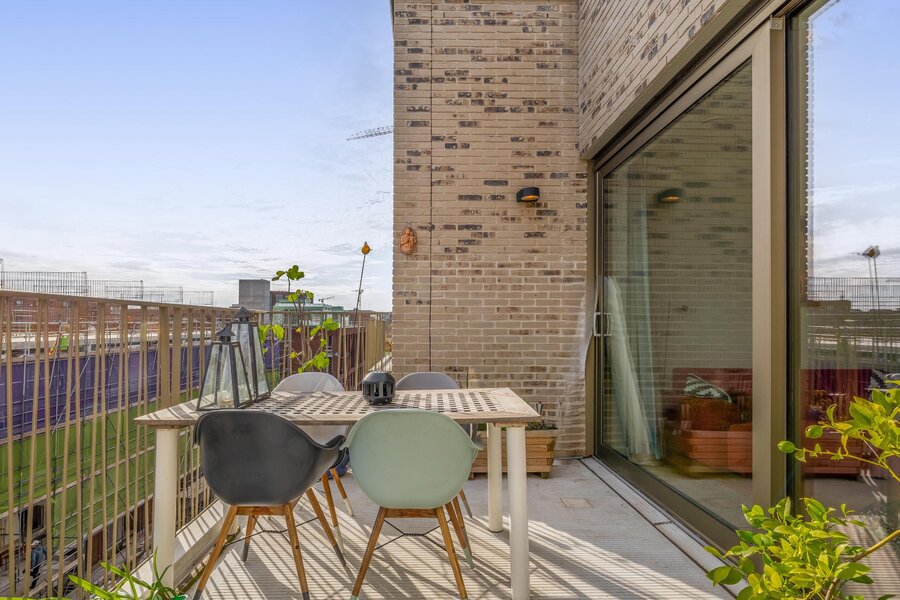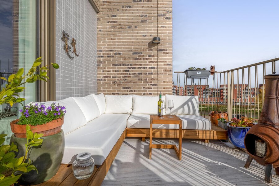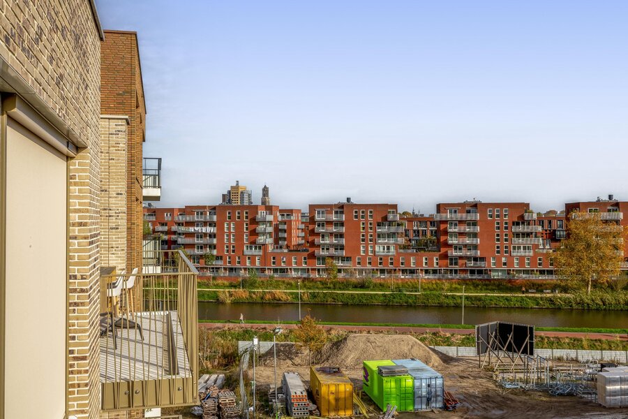 Aan de woonkamer grenst een royaal balkon van ca. 15 m² op het zuidoosten. Dit is de perfecte plek voor een ontbijtje aan het begin- of juist een borrel aan het einde van de dag. Dankzij de hogere ligging heb je vrijwel de hele dag zon, een vrij uitzicht over het Merwedekanaal en nieuwbouw in wording — een dynamisch decor.