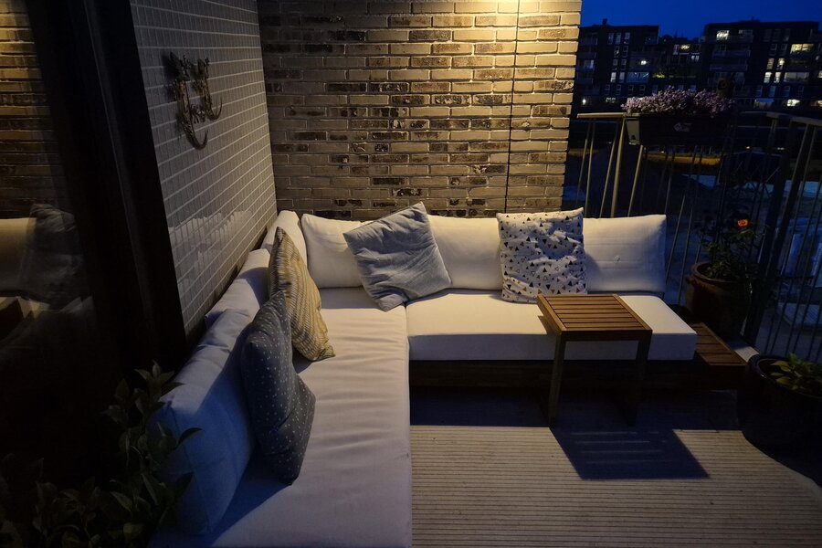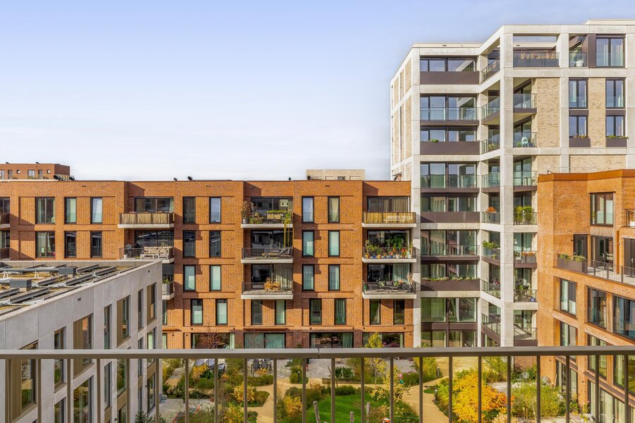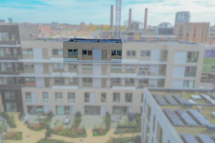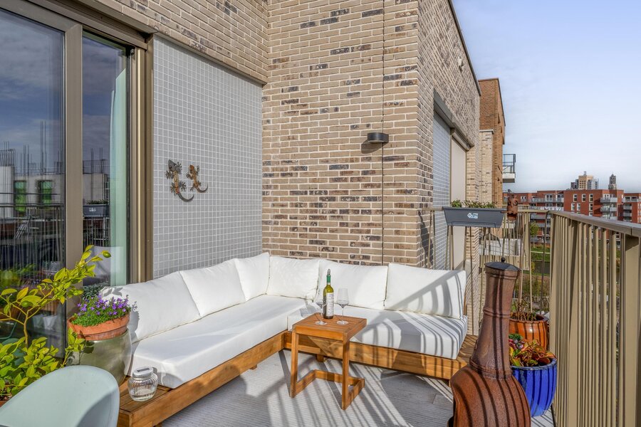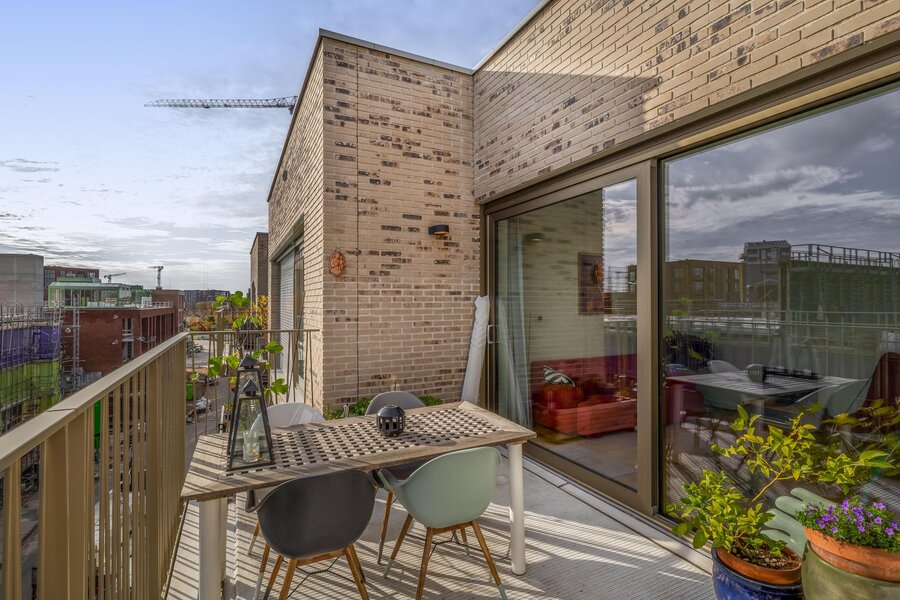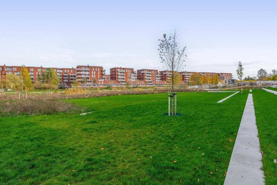 Aan de woonkamer grenst een royaal balkon van ca. 15 m² op het zuidoosten. Dit is de perfecte plek voor een ontbijtje aan het begin- of juist een borrel aan het einde van de dag. Dankzij de hogere ligging heb je vrijwel de hele dag zon, een vrij uitzicht over het Merwedekanaal en nieuwbouw in wording — een dynamisch decor.