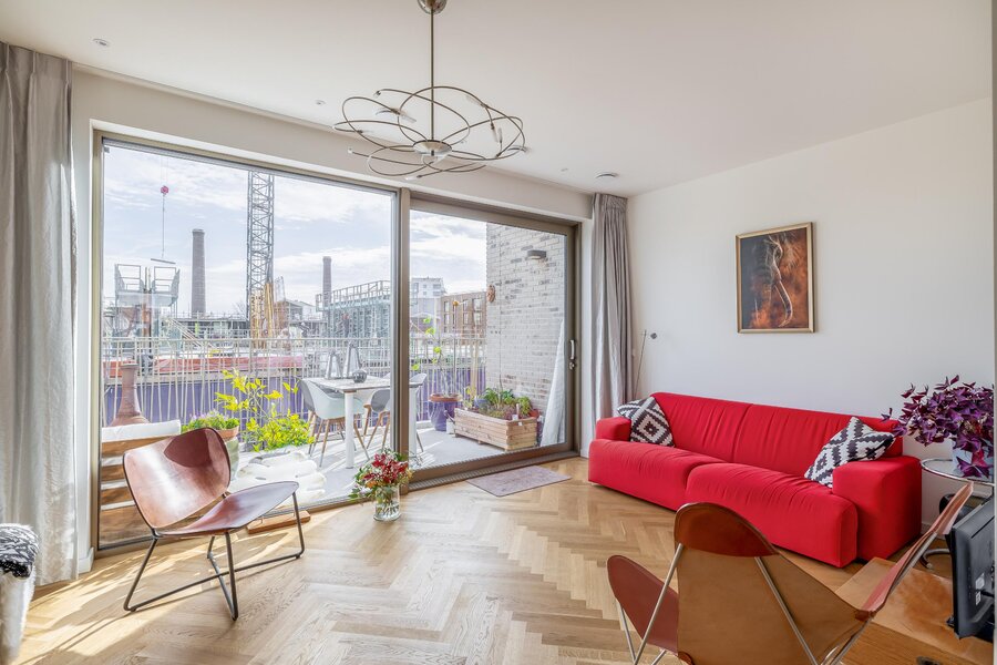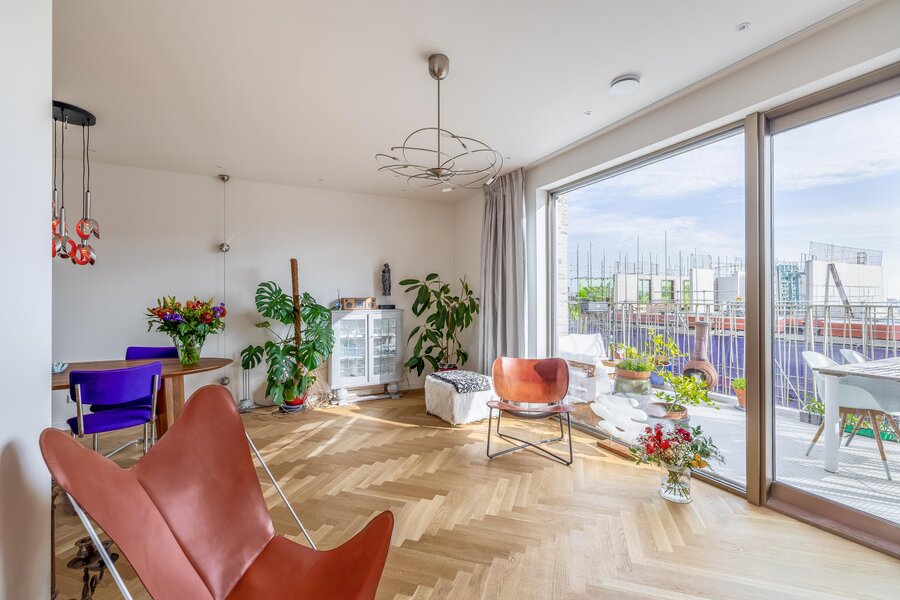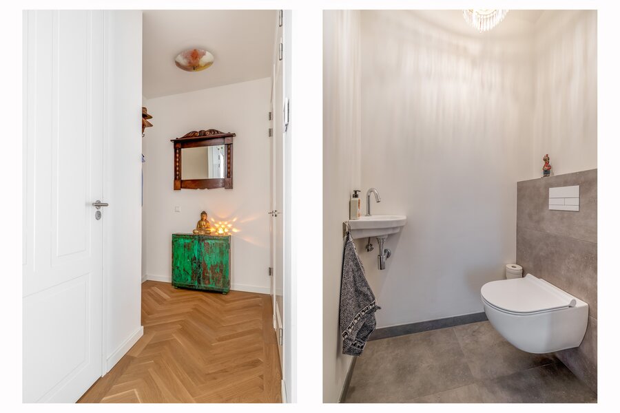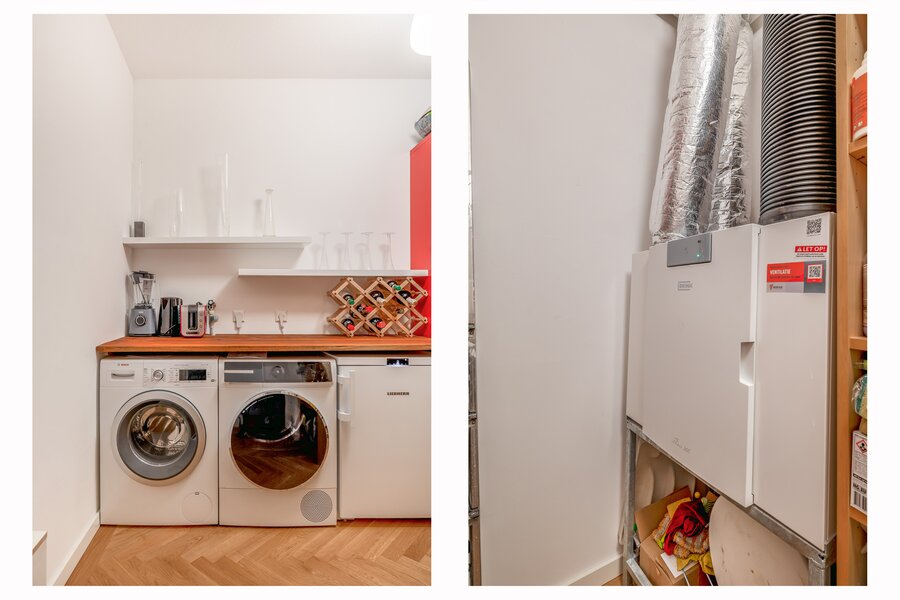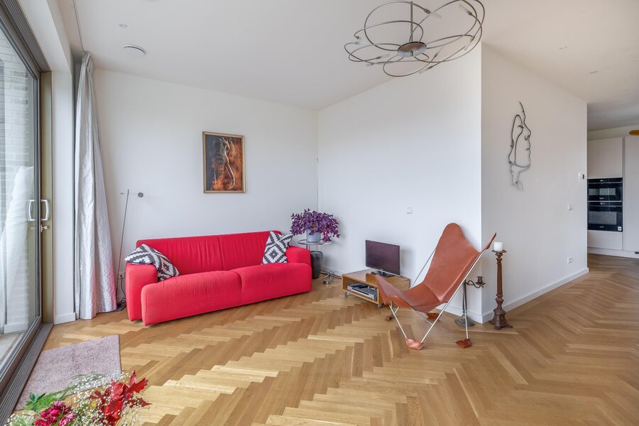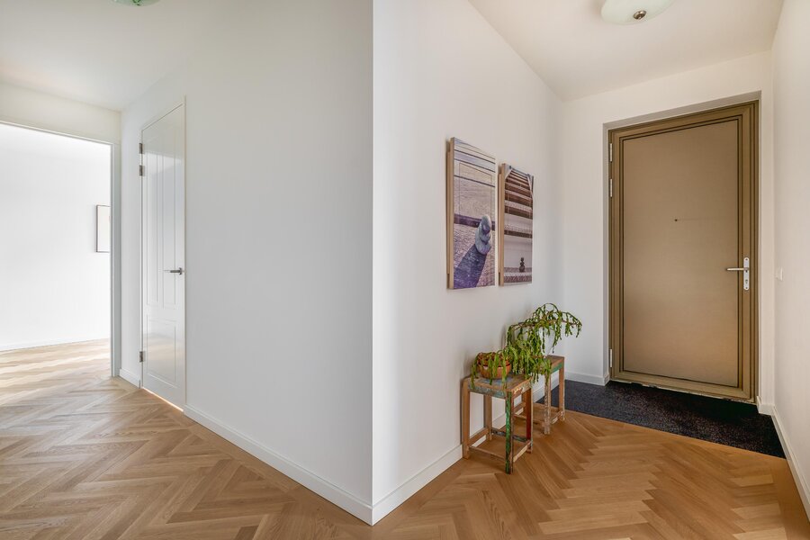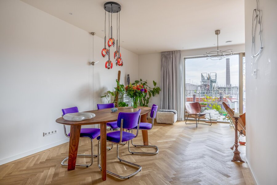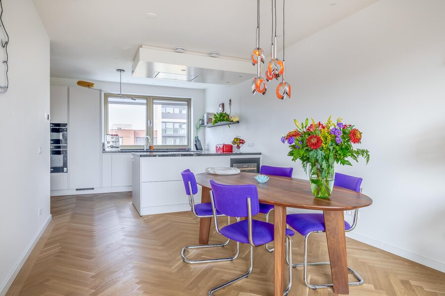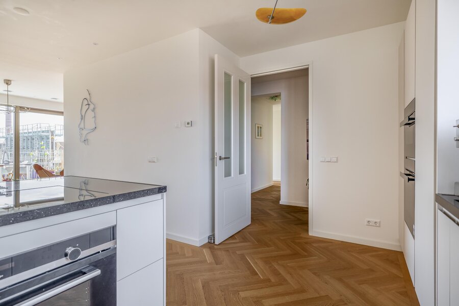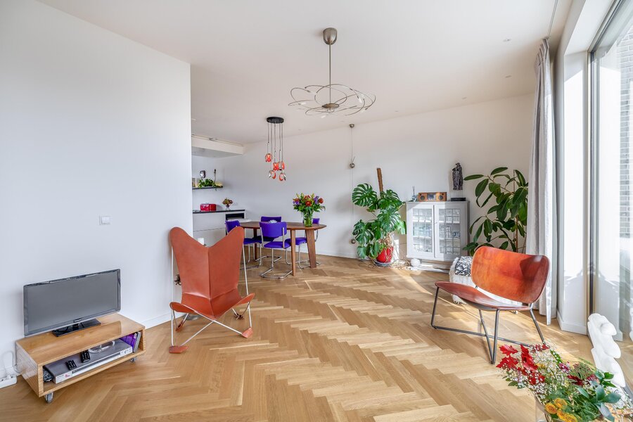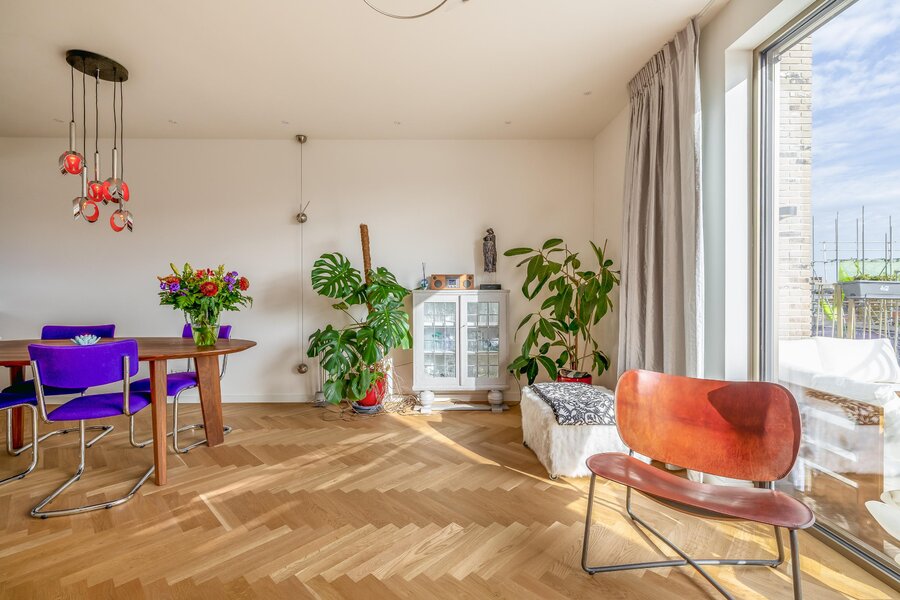 De woonkamer is heerlijk licht dankzij de grote raampartijen en heeft een mooie, open verbinding met de eethoek en het balkon. De warme houten visgraatvloer en strakke wanden en plafonds zorgen voor een moderne warme uitstraling. De schuifpui naar het balkon versterkt het gevoel van vrijheid.