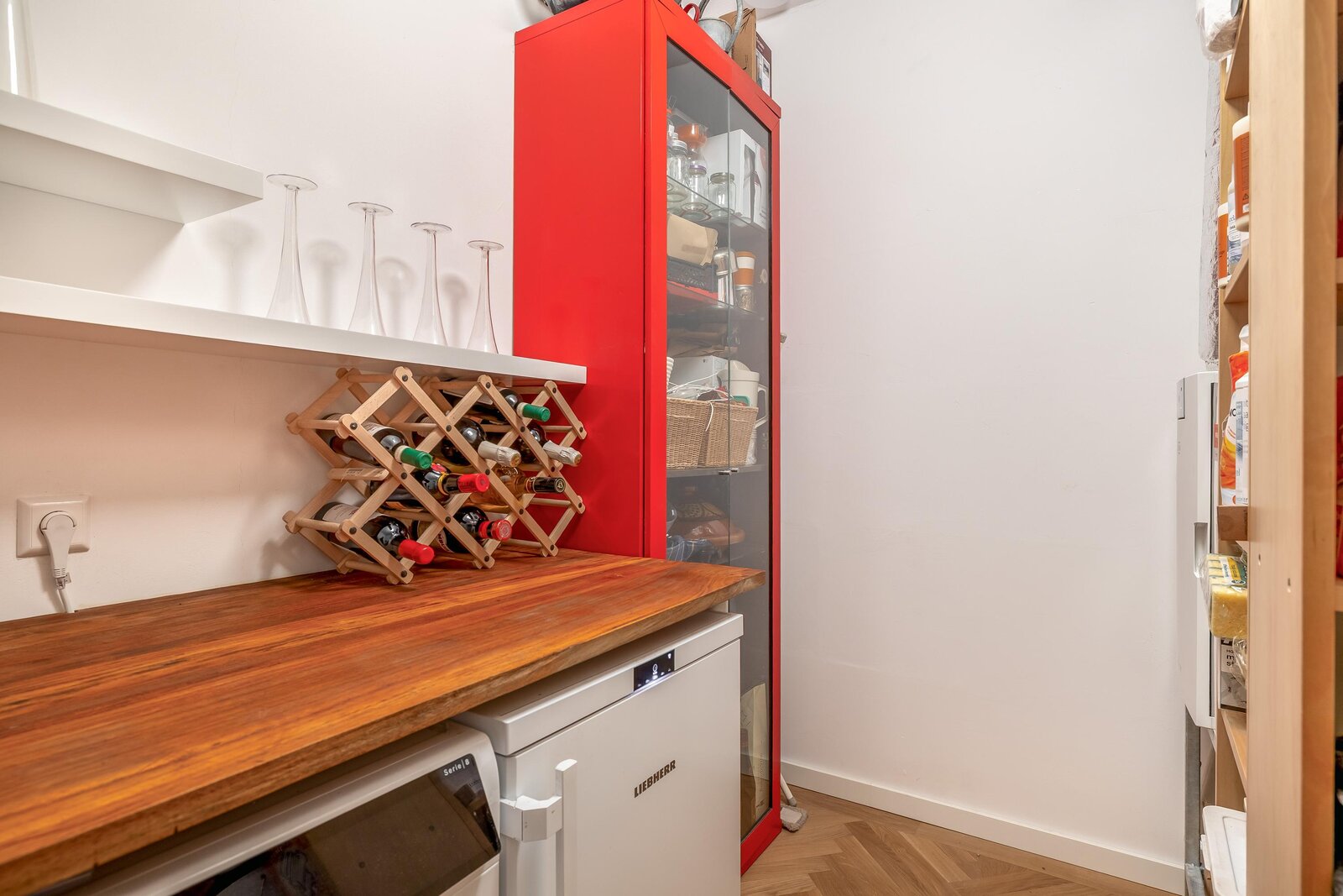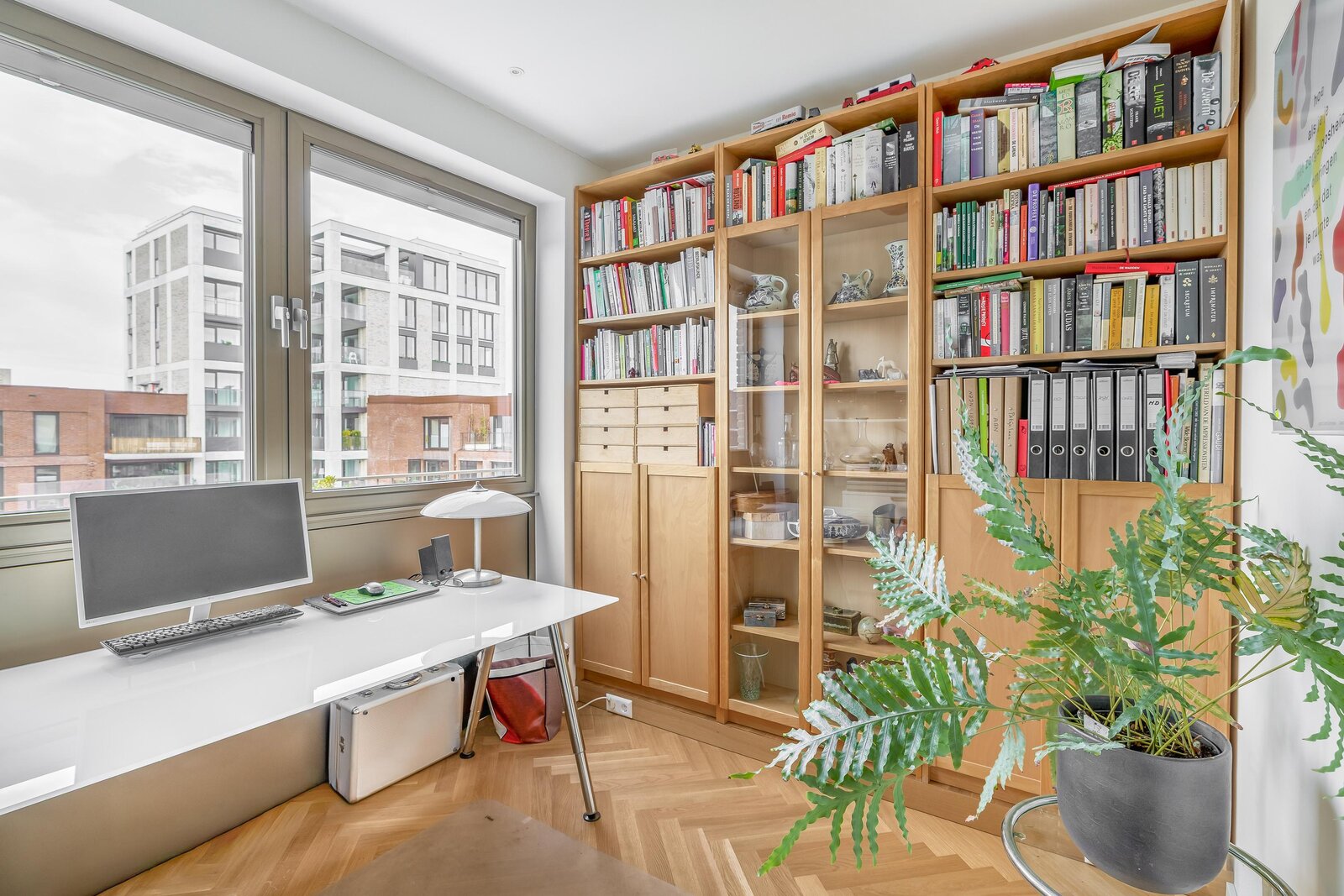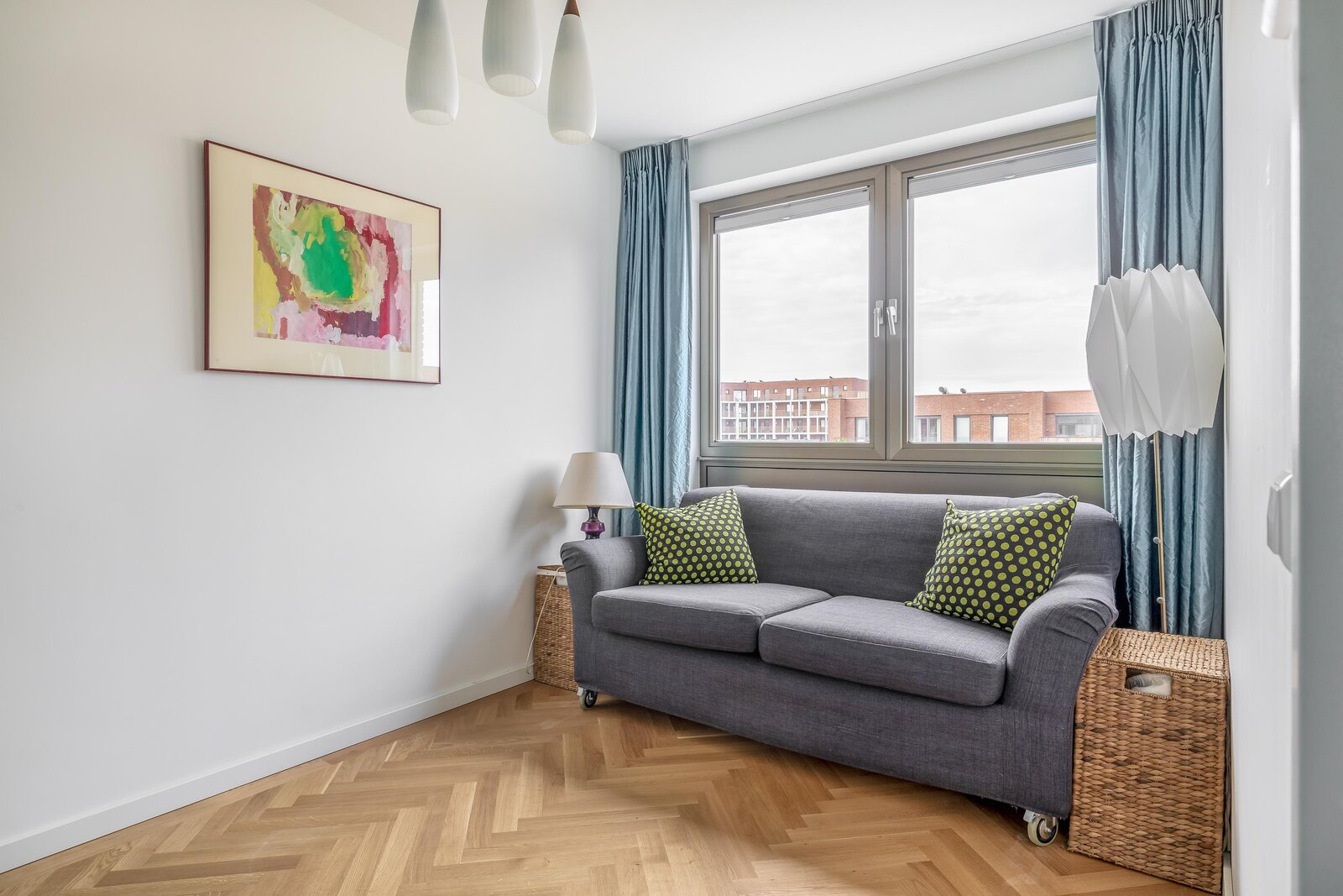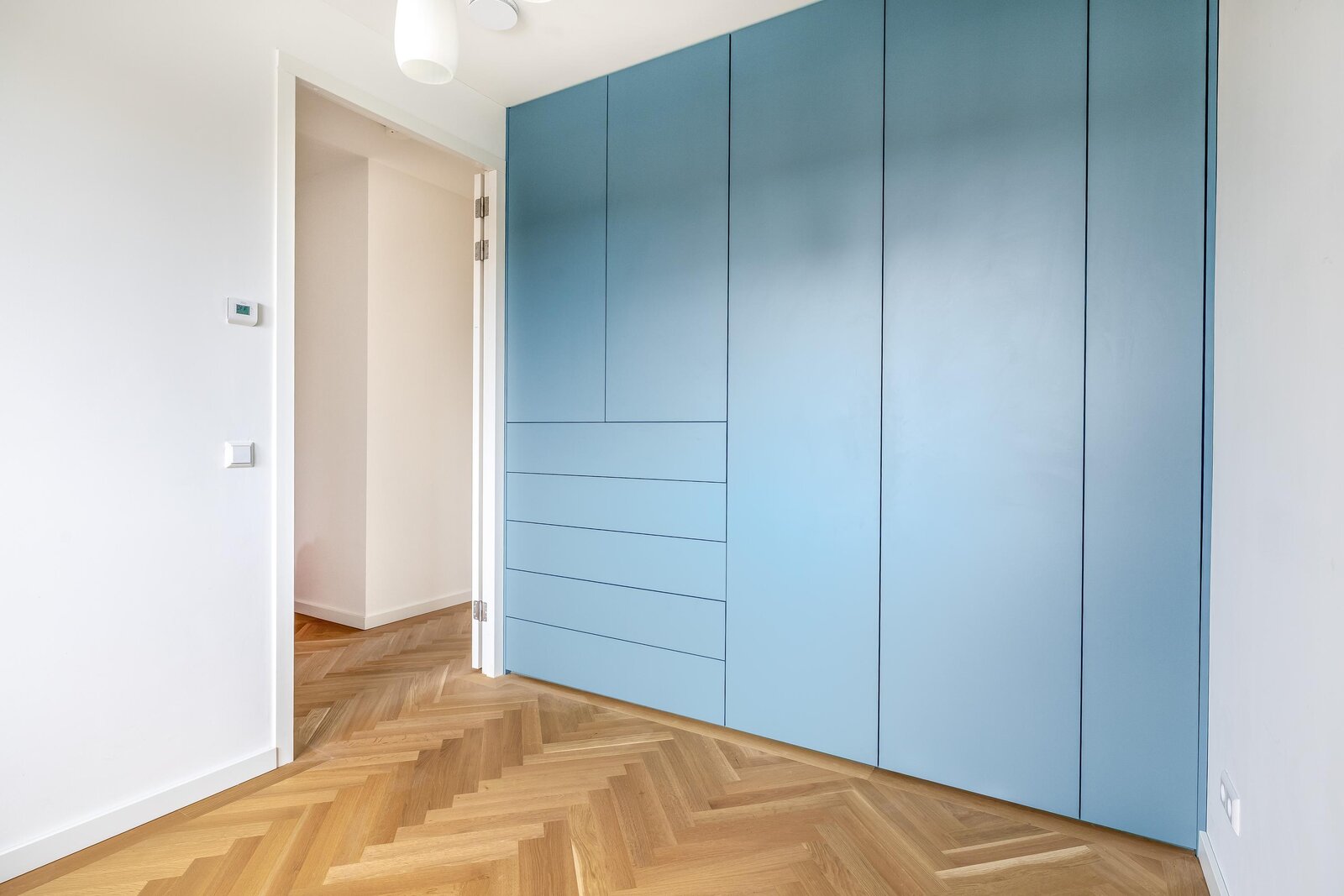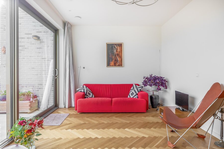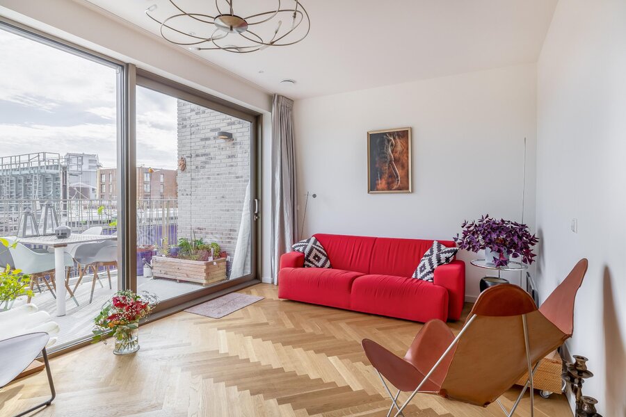 De woonkamer is heerlijk licht dankzij de grote raampartijen en heeft een mooie, open verbinding met de eethoek en het balkon. De warme houten visgraatvloer en strakke wanden en plafonds zorgen voor een moderne warme uitstraling. De schuifpui naar het balkon versterkt het gevoel van vrijheid.