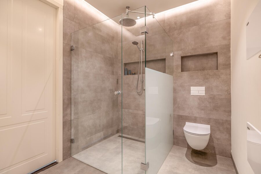 - Strakke badkamer met grote inloopdouche, wandcloset en stijlvolle afwerking
